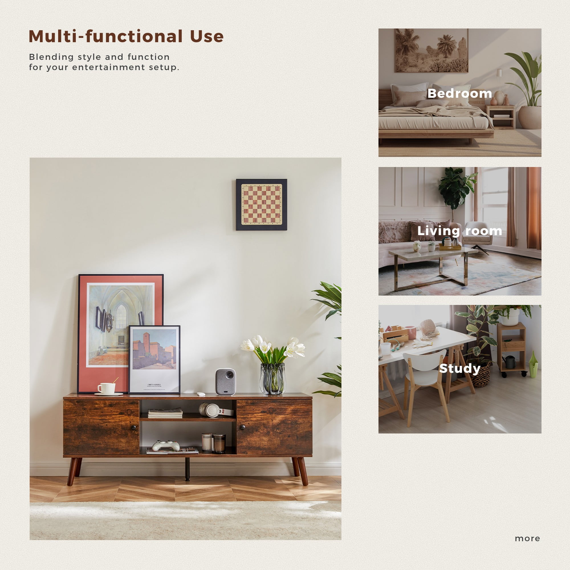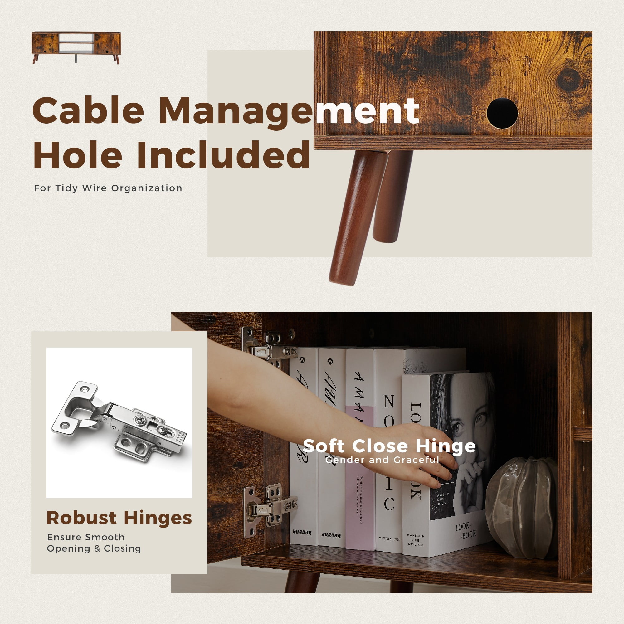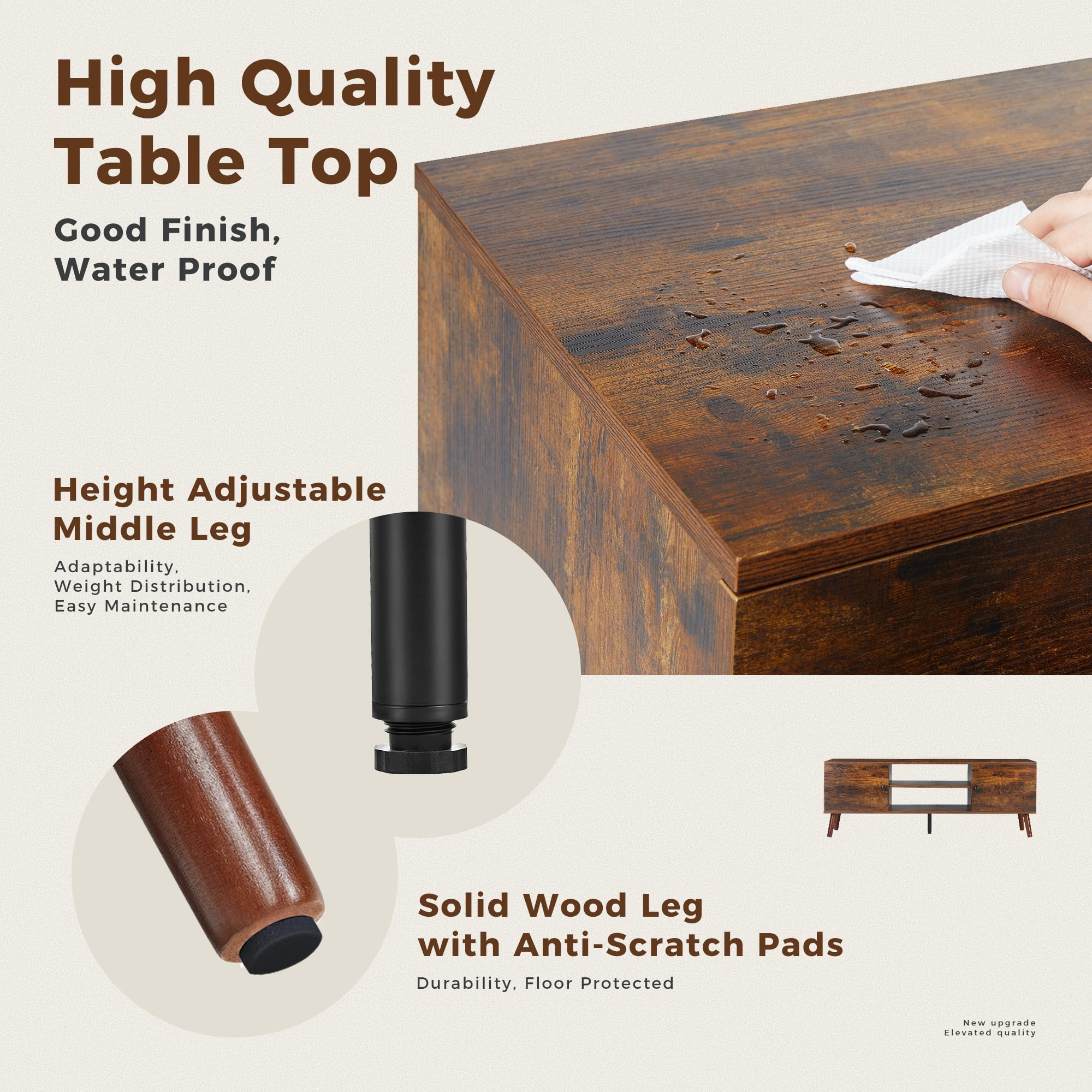 Sturdy and Stable: Equipped with 5 legs for robust support, this TV stand is built with durable particle board and features foot pads to protect floors from scratches. Fits 55-60” TVs: Designed to hold TVs up to 60 inches, this wooden TV stand features a sleek mid-century modern design, enhancing your living room, bedroom, or lounge. Ample Storage with Cable Management: Two large cabinets provide spacious storage. Cable holes in the back help organize cables for devices like game consoles and routers, while soft-close hinges ensure quiet door operation. Adjustable Open Shelf: The center shelf can be adjusted to 3 different levels, giving you flexibility to store a variety of items, from electronics to decorative pieces. Easy Assembly: Comes with clear instructions, numbered parts, full installation tools, and video guides to help you assemble your TV stand with ease.