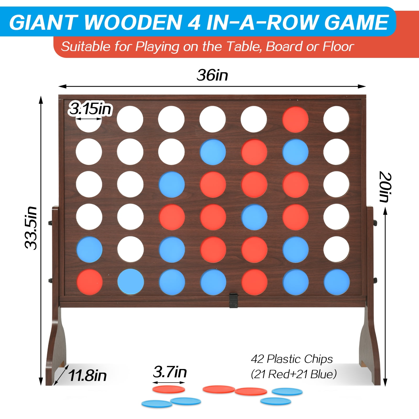 Specification Information and Usage Instructions: – Dimensions: Over 2 feet high x 3 feet wide. Material: Premium quality wood Suitable for: Indoor and outdoor use – Assembly: Tool-free assembly and disassembly Portability: Equipped with a convenient carrying bag for easy transportation – Ideal for: Family fun, team building activities, parties, and more Product Function Detailed Explanation: Standing over 2 feet high x 3 feet wide, this Giant 4 in a Row Connect Game provides the ideal size for indoor and outdoor activities. Easy to assemble in just 1 minute without the need for tools, this outdoor game is designed for convenience and quick setup. The included carrying bag allows you to effortlessly transport the game set from indoors to outdoors, making it the perfect entertainment option for barbecues, camping trips, family outings, and gatherings with friends. This jumbo connect 4in1 outdoor game is not only a great gift option for family and friends on various occasions such as Christmas, birthdays, housewarmings, and classroom events but also an excellent choice for creating your own carnival game atmosphere. Take the fun with you wherever you go and become the life of the party with the Premium Giant 4-in-a-Row Connect Wooden Game. Upgrade your game nights now!