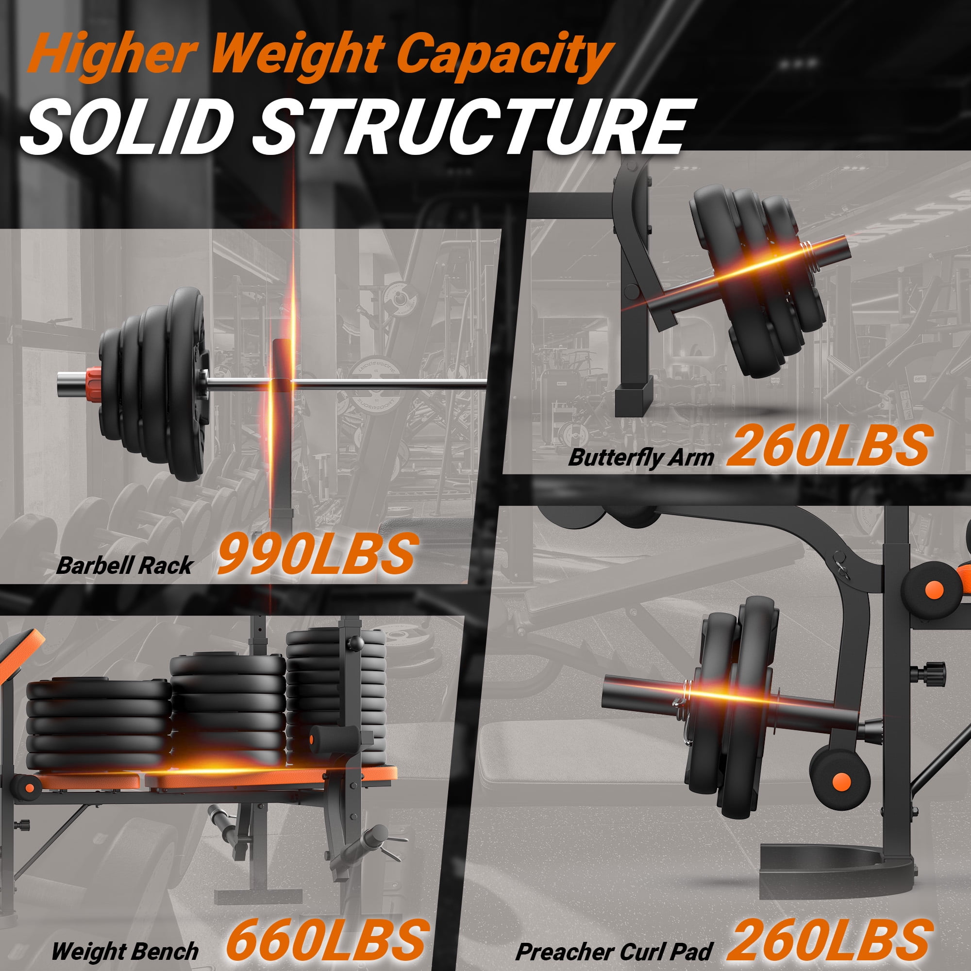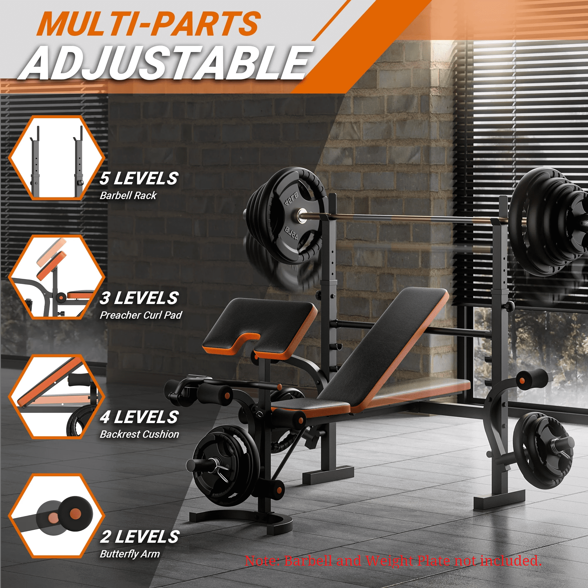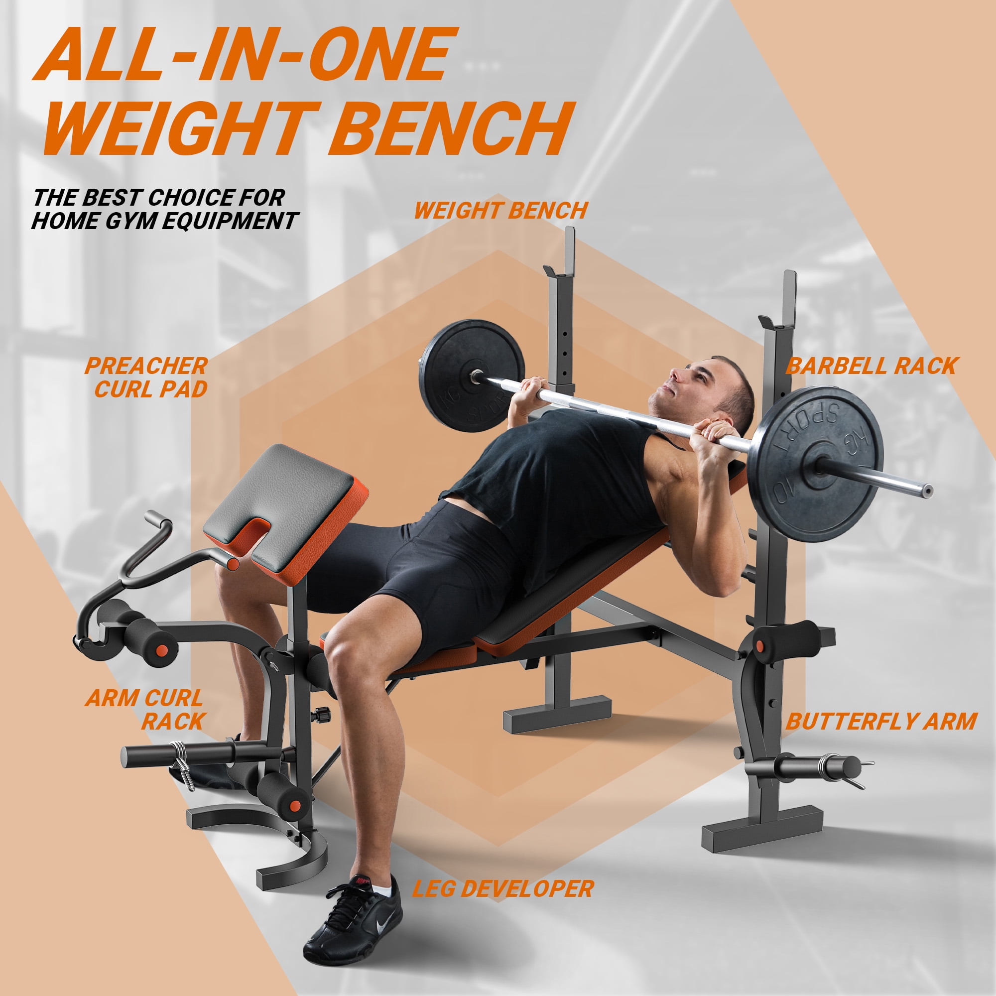 Features: ✅6-in-1 Multi-functional Fitness Equipment: A complete set of equipment including Weight Bench, Barbell Rack, Preacher Curl Pad, Butterfly Arm, and Leg Developer, catering to a wide range of muscle groups for full-body workouts and training. ✅Home Gym : perfect for beginners and professional athletes alike, offering a comprehensive solution to all fitness needs. It’s the best choice for home gym equipment. ✅Heavy Load : The GIKPAL Adjustable Weight Bench is constructed from high-quality Carbon Steel, providing stability and durability. The Weight Bench has a maximum weight capacity of 660 pounds, the Barbell Rack can support up to 990 pounds, while the Butterfly Arm and Preacher Curl Pad each have a maximum capacity of 260 pounds. ✅Exceptional material: Four adjustable components – Barbell Rack, Preacher Curl Pad, Backrest Cushion, and Butterfly Arm, allow you to customize the angle according to your specific workout requirements. ✅Enhanced User-Friendly Design: The seat cushion is made of PVC Soft Leather material, offering comfort and durability with anti-slip properties. Soft foot pads made of NBR material provide wear and heat resistance, ensuring a comfortable and effective workout. Product Specification: ✅Brand: GIKPAL ✅Materials: Carbon Steel, NBR, PVC Leather ✅Maximum Weight Capacity: 660 pounds ✅Assembled Product Dimensions: 68.8″x68.5″x(43.3″-44.4″) ✅Seat Cushion Dimensions: 12.1″x11.4″x1.57″ ✅Backrest Cushion Dimensions: 30.7″x10.1″x1.57″ ✅Preacher Curl Pad Dimensions: 17.9″x10.6″x1.96″ ✅Recommended User: Adults ✅Recommended Usage: Indoor Home Gym Package Contents: ✅1 x Screw Pack ✅1 x Product Manual ✅1 x Weight Bench (excluding barbell and weight plate)