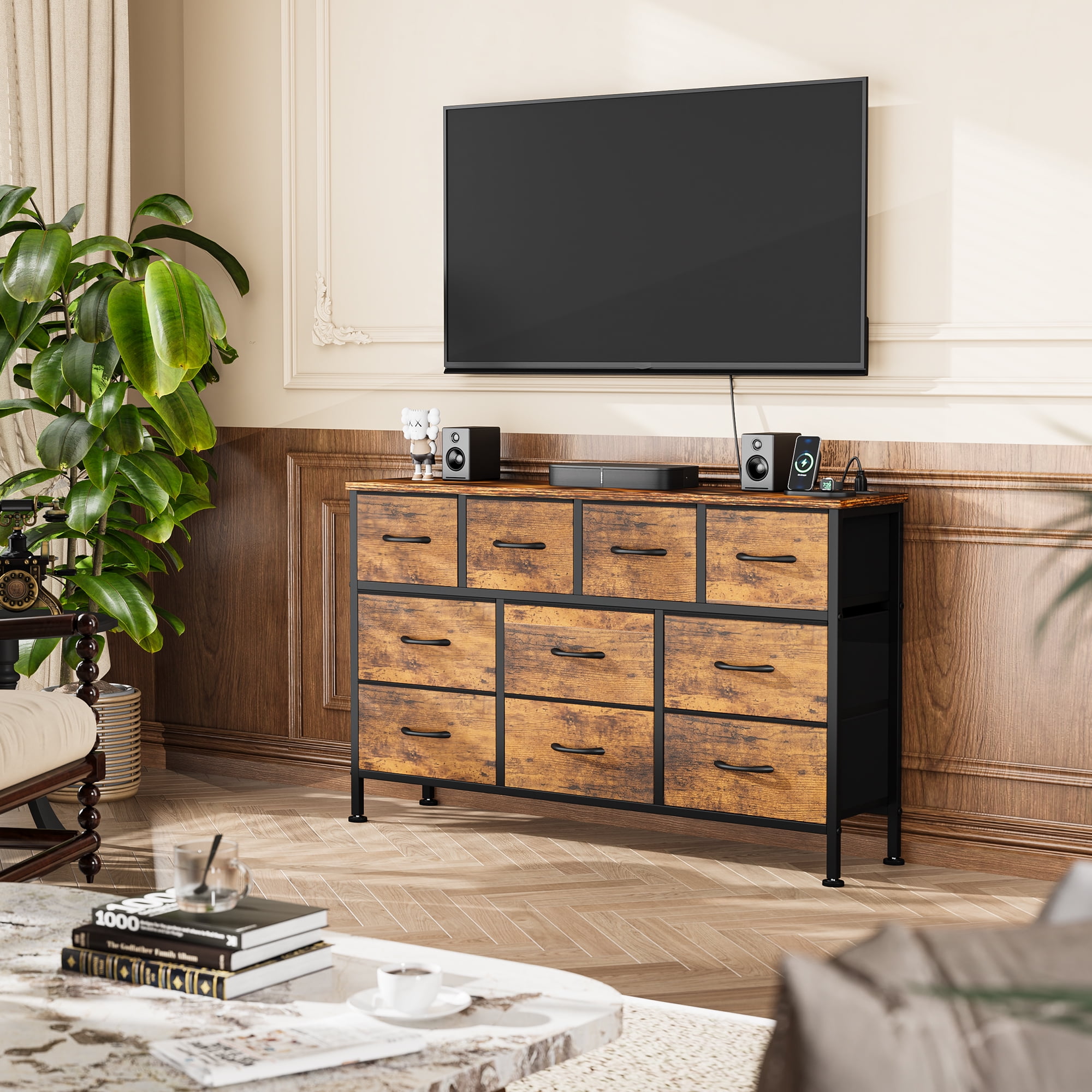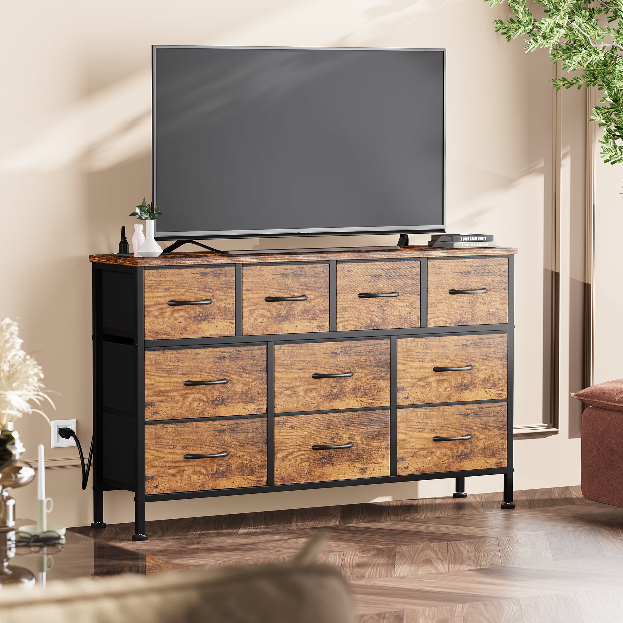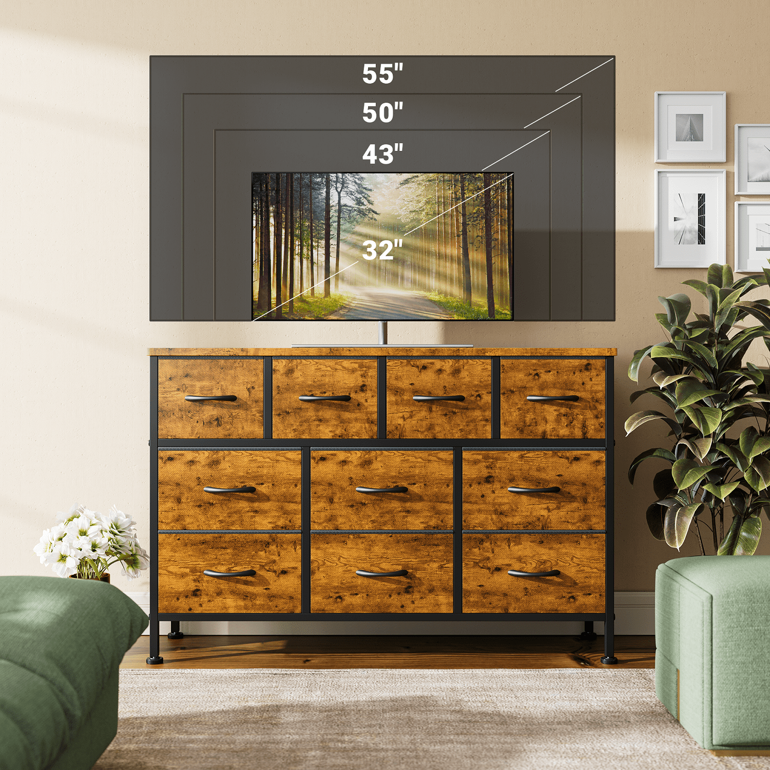 GIKPAL Dresser TV Stand, 10 Drawer Dresser for Bedroom with Power Outlet, Chest of Drawers for 55″ Long TV, Fabric Dresser for Storage and Organization, Brown
