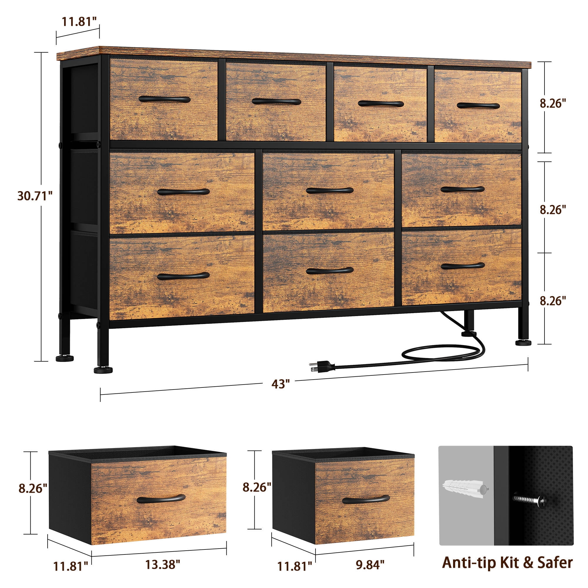 GIKPAL 10-Drawer Dresser TV Stand: GIKPAL dresser features 10 fabric drawers in a stylish black wood grain finish, making it a versatile storage solution for your bedroom, closet, living room, hallway or entryway. Spacious TV Stand: With a width of 43 inches, fabric storage dresser doubles as a TV stand, accommodating TVs up to 50 inches in size, making it a perfect addition to your living room or entertainment space. Convenient Power Outlet: Equipped with a built-in power outlet, 10-drawers dressers allows you to charge your electronic devices conveniently, keeping your gadgets organized and within reach. Freestanding Design: The freestanding design of GIKPAL dresser means you can easily place it in any room without the need for wall mounting, providing flexibility in your furniture arrangement. Sturdy and Easy Maintenance: The wooden top board and adjustable feet ensure stability and easy assembly. To keep it looking its best, simply wipe it down with a damp cloth. Plus, it comes with a one-year limited warranty for added peace of mind. Product Specification: Brand: GIKPAL Color: Brown Size: 43″W x 11″D x 30″H Item Weight: 31.96 lbs Mounting Type: Freestanding Room Type: Closet, Living Room, Bedroom, Hallway Furniture Finish: Wood & Metal Drawer Type: Fabric Drawers Product Care Instructions: Wipe with Damp Cloth Assembly Required: Yes Department: Unisex-adult