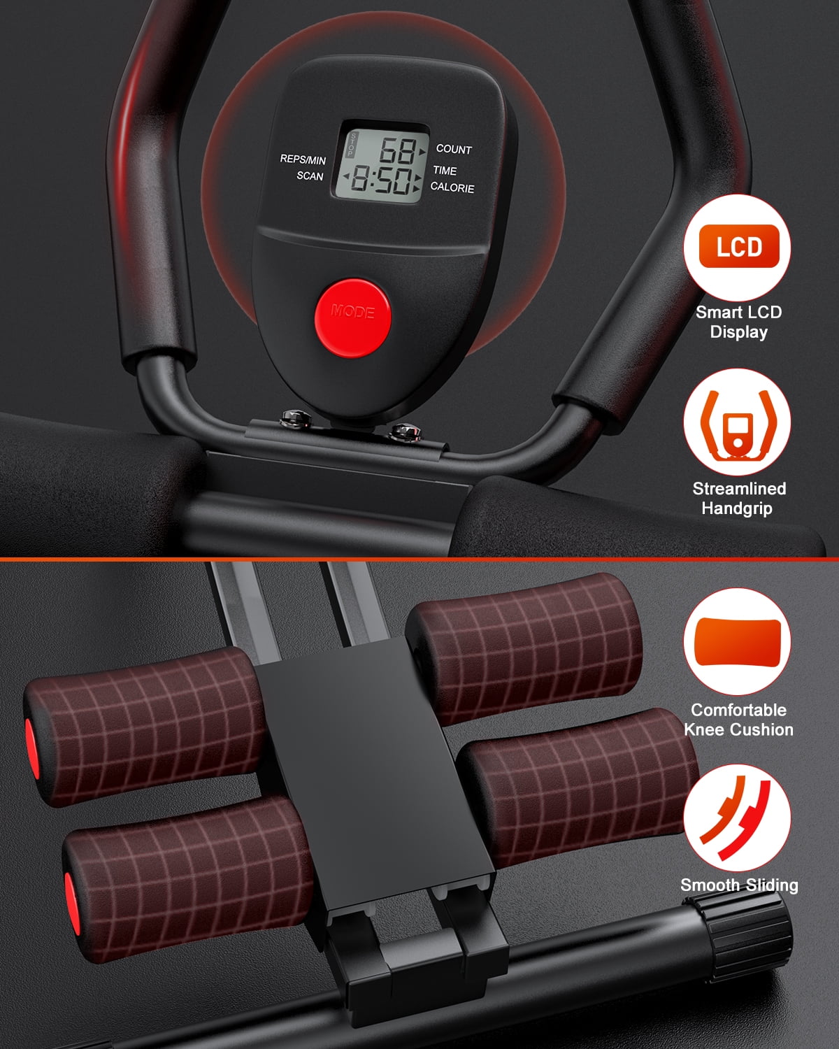 Feature: ✨Professional ab/core machine: Ergonomic Design, Effective Workouts. Our professional core machine is ergonomically designed for effective workouts. Its 120° dual-track bending strengthens abdominal muscles without straining the back or neck. The detachable slider engages multiple muscle groups, maximizing efficiency. It includes two resistance bands for added challenge. ✨Stable & Safe Construction: Upgraded heavy-duty steel frame, max weight capacity is up to 440 lbs. 0.99-inch thickened knee pads and foam-covered handgrips, ensure high durability and a comfortable workout. It comes with a pair of straps to protect the wrist. ✨Easy to Assemble & Space-saving: Just need 5 mins to assemble the ab machine. It is easily folded and stored in the corner when not used, taking up less space! A compact ab workout equipment for a home gym or office use. ✨Smart LCD Display: Easy-to-read digital workout counter conveniently keeps track of the calories burnt, workout time, and workout reps, Know your workout progress in real-time and set your workout goals. ✨4 Adjustable Resistance Levels: The height can be adjusted to meet different training intensities, not only for fitness beginners but professional fitness trainers. The more inclined the ab machine is the more challenging abdominal exercise you will get. ✨Product Specification ✨Material: Alloy Steel, Foam ✨Weight: 19 Lbs ✨Max Weight Capacity: 440 Lbs ✨Fold Dimension: 47.3×16.5×9.5 inches ✨Product Dimension in Use: 35.5x 34.5 x 15.7 inches ✨LCD Monitor functions: Scan, Calories Burnt, Time, Count Package Included ✨1xAb Machine ✨1xLCD Monitor (NO battery, fit in 1xAA battery) ✨1xManual