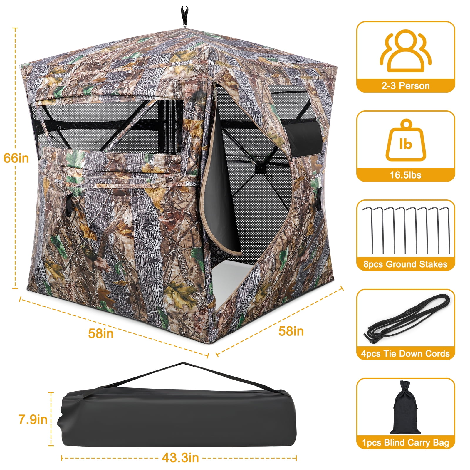 - Ample Space: Hunting blind size 58” x 58” x 66” (L x W x H), can accommodate 2-3 people, perfect for bow and gun hunting.