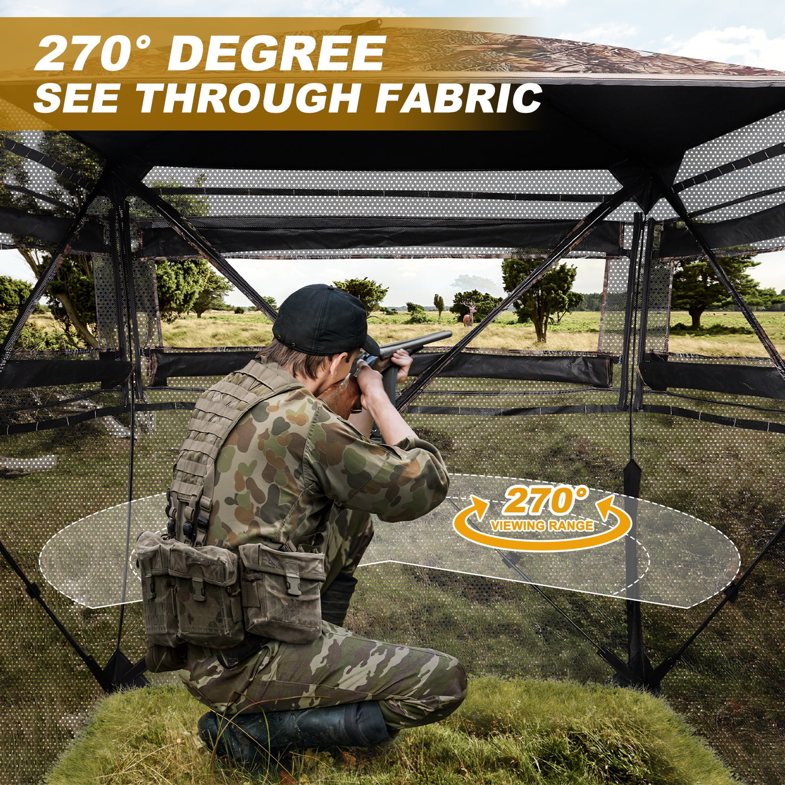 - Unique Stealth Design: GIKPAL hunting blind features 3 full-panel one-way perspective grids that provide a 270-degree unobstructed wide field of view. The realistic camouflage pattern seamlessly blends the shelter with the surrounding habitat to enhance concealment and achieve perfect camouflage.