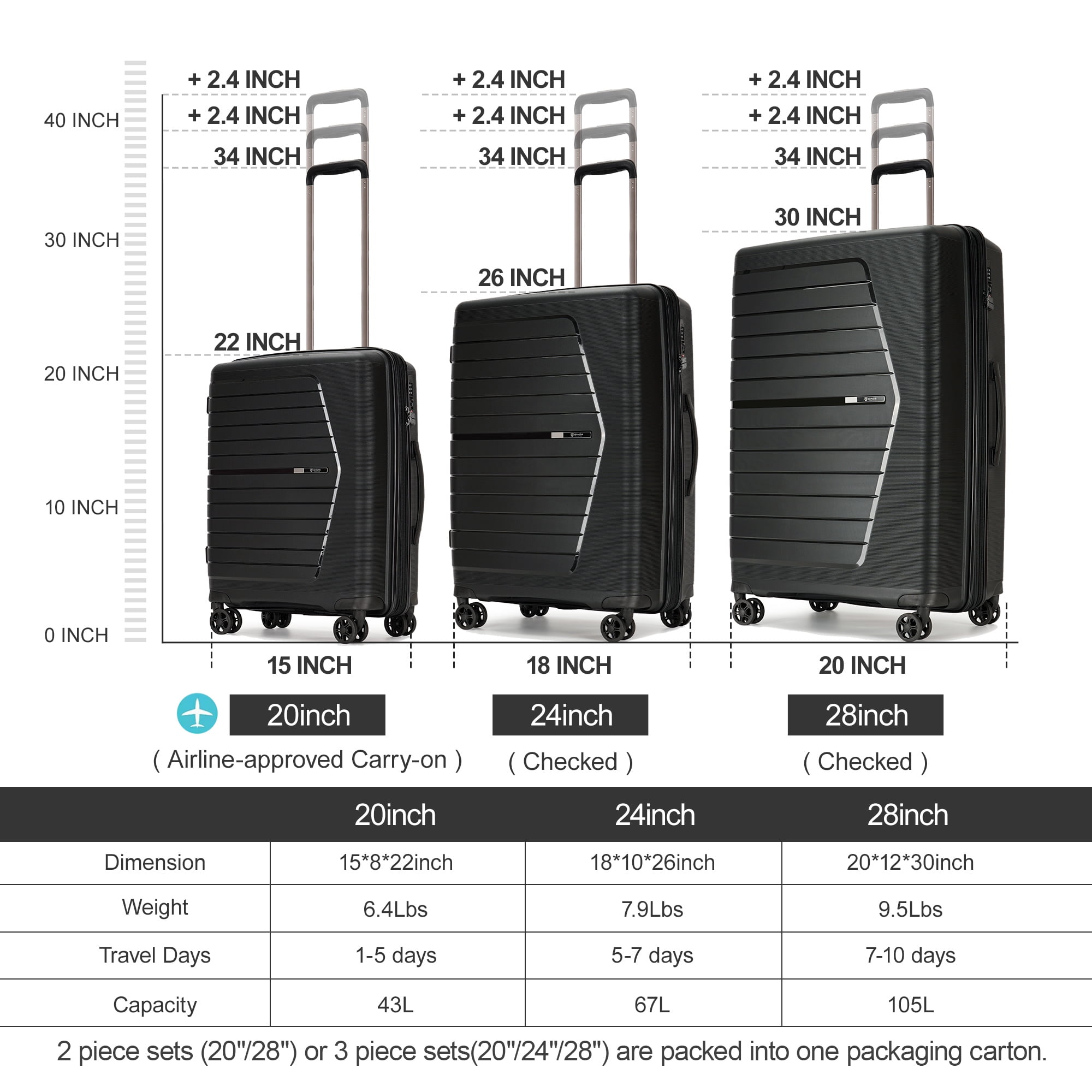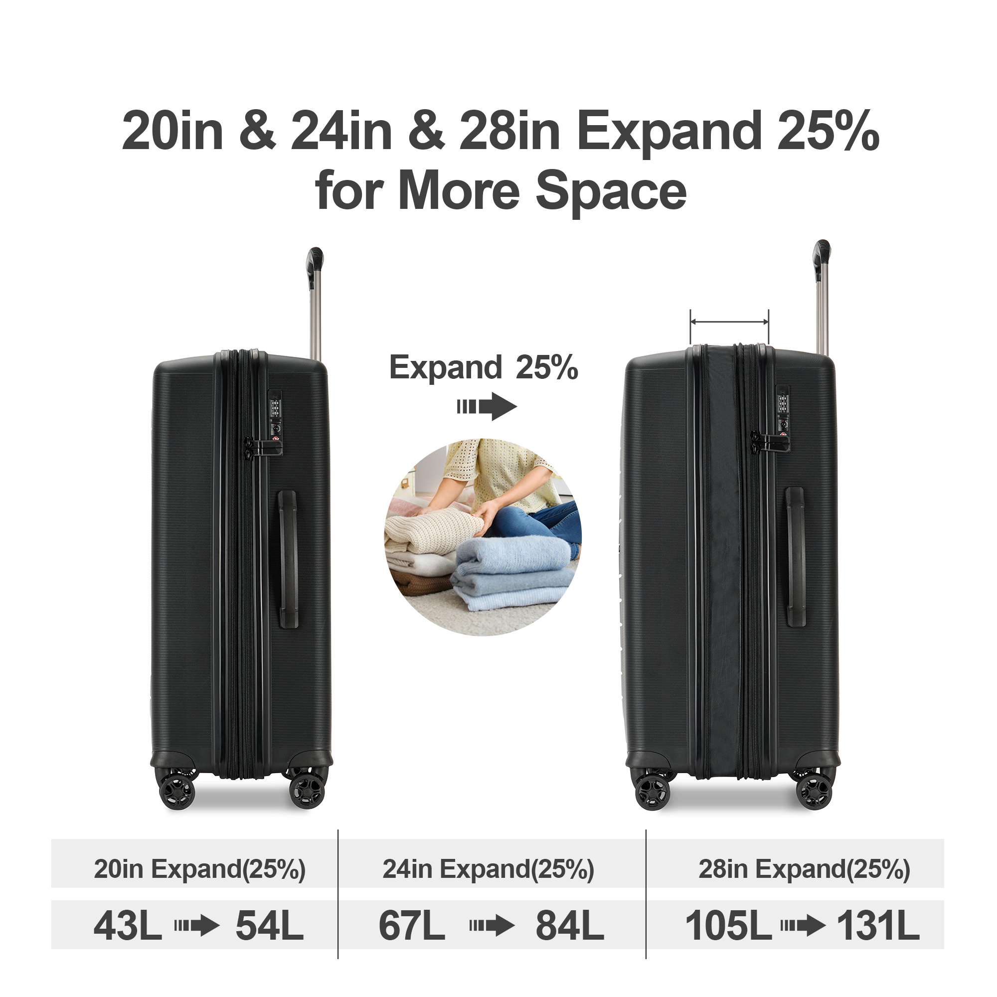 [Expandable Luggage Dimensions & Volume] Hard shell expandable suitcase with spinner wheels measures: 20 inch Carry On Luggage:15(L)* 8(W)* 22 (H)Inch,Weight:6.4 Lbs,Capacity:43 L(can expand to 54 L),meets carry-on size restrictions, catering to travelers embarking on domestic journeys while prioritizing a lightweight travel experience. 24 inch Checked Luggage:18(L)* 10(W)* 26 (H)Inch,Weight:7.9 Lbs,Capacity:67 L(can expand to 85 L) 28 inch Checked Luggage:20(L)* 12(W)* 30 (H)Inch,Weight:9.5 Lbs,Capacity:105 L(can expand to 131 L) [Hard Shell Lugagge] Made of brand new extra-thick PP materials for hard shell, which make the luggage more durable, lightweight and impact-resistant. Features textured finish to prevent against scratches after a trip. 20in is the best carry on luggage for airplane,20in & 24in & 28in can expand for more spaces. [Large space, small details] Unzip to reveal 2 spacious lined compartments, one with elasticated cross straps and the other with a zip divider mesh pocket and organizational pockets. You can pack all your suitcase with the wise organization. Small pouch between hardshell can store toothbrush, wallet, makeups, etc. [Mute Multi directional Rotating Wheel] Thanks to the brand new soft TPU and the lubricating balls inside the wheels, luggage moves very quietly and smoothly under the 360 ° rotating dual wheels. The luggage passed the 100% drop test. The luggage also passed the walking test (professional luggage quality test: the luggage can load 15 kilograms and walk 40 kilometers at a speed of 10 kilometers/hour). The best choice for long-term travel and business travel. [Intimate Design] Adjustable and sturdy aluminum 3-step telescoping handle allows you to maneuver in narrow spaces and provide effortless movement. Smooth undulations provide a more comfortable carrying.