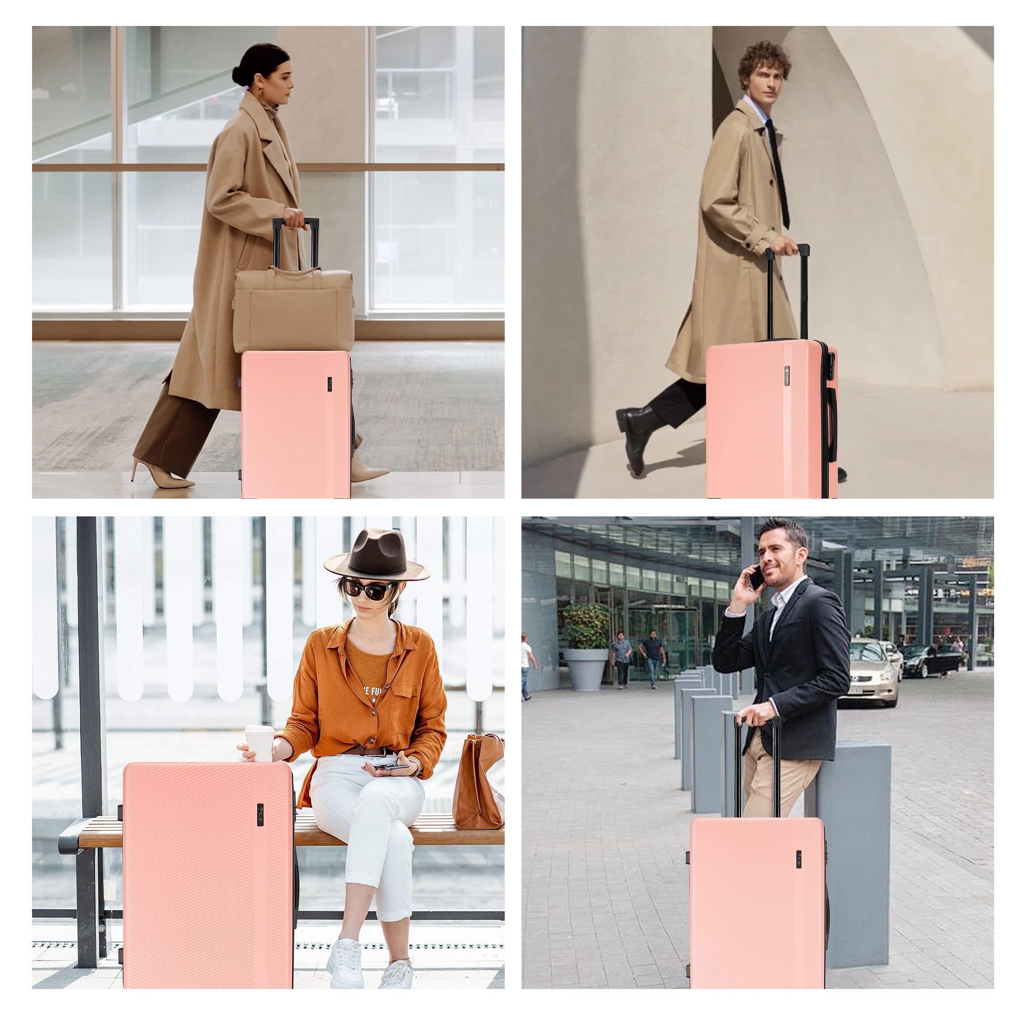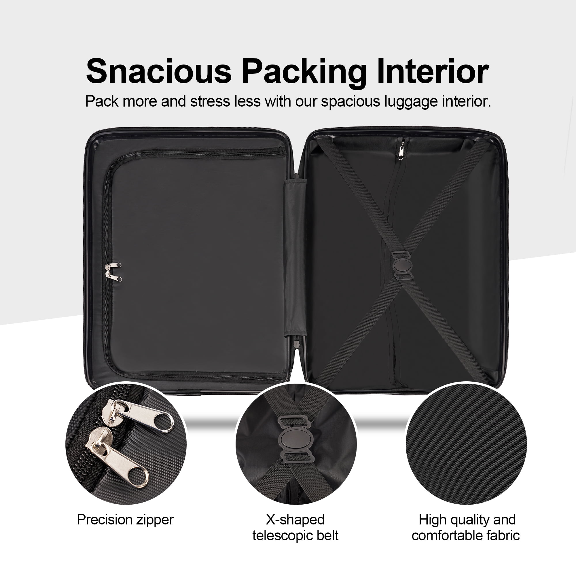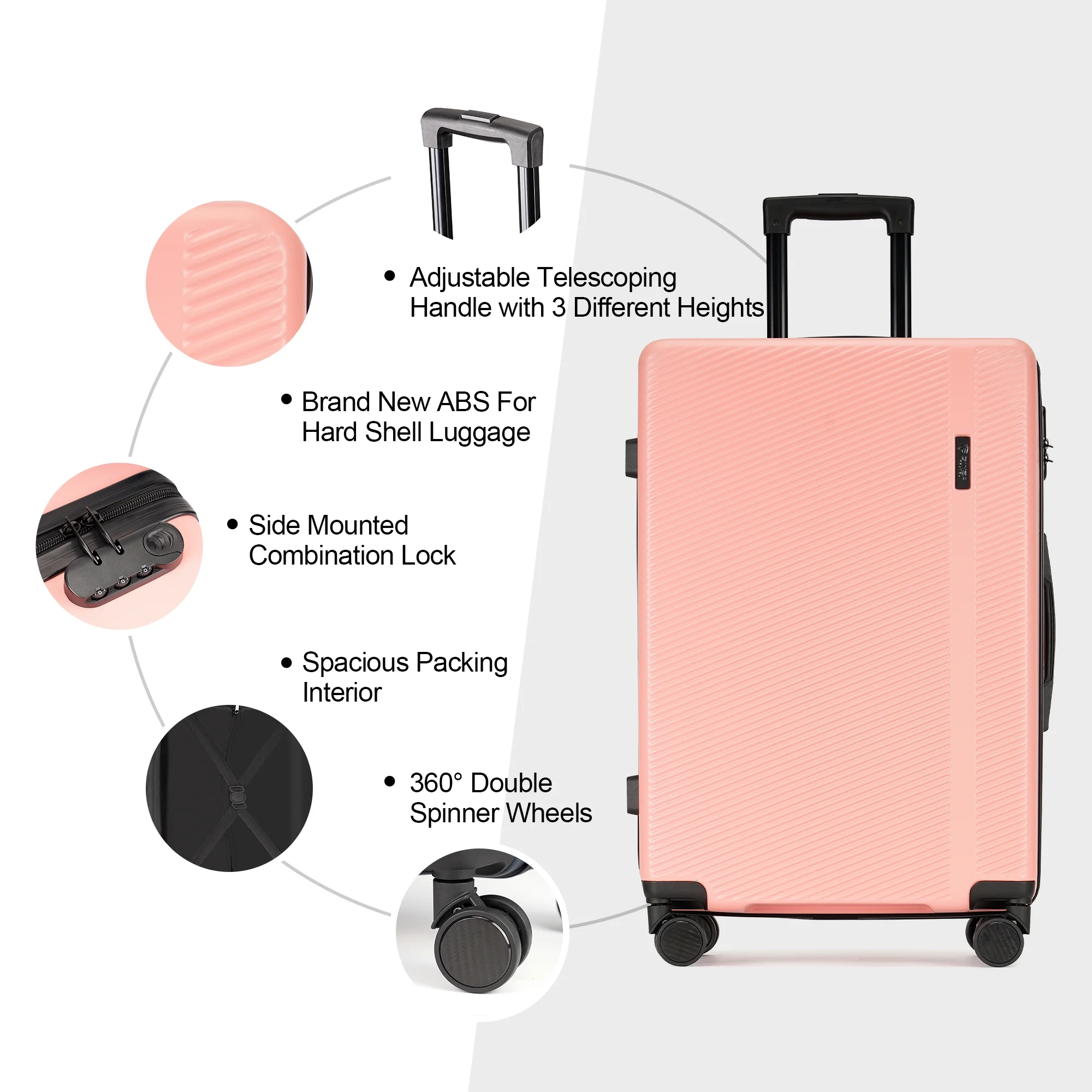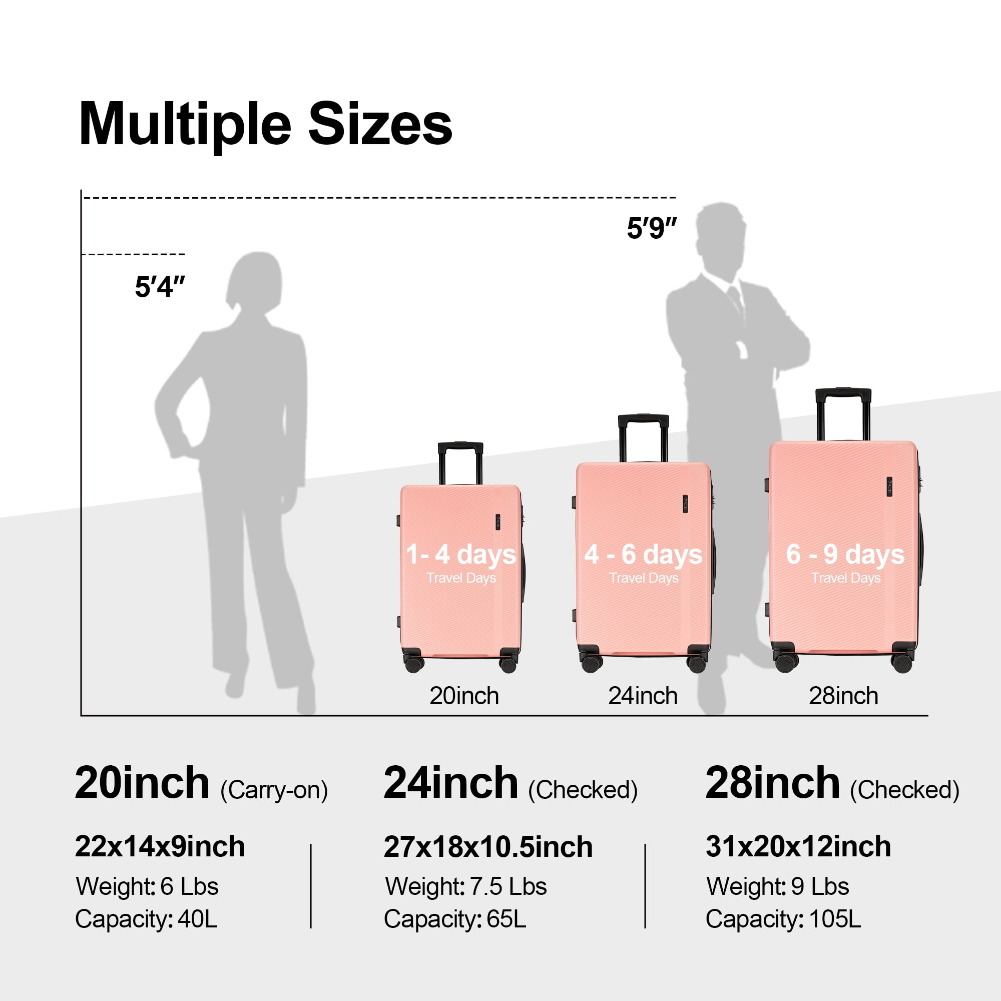 【3 PIECE LUGGAGE SETS SIZE-INCLUDING WHEELS】: 20″ Carry On Luggage : 23(H) * 15(L) * 10(W) INCH( meets all standard requirements for carry-ons on both international and U.S. based flights),Weight:6 Lbs,Capacity:40 L ; 24″ Checked Medium Luggage : 27(H) * 18(L) * 10.5(W) INCH,Weight:7.5 Lbs,Capacity:65 L ; 28″ Checked Large Luggage : 31(H) * 20(L) * 12(W) INCH,Weight:9 Lbs,Capacity:105 L 【100% ABS HARD SHELL MATERIAL LUGGAGE SETS】: Made of extra-thick ABS materials for hard shell, which make the luggage more durable, lighter and impact-resistant.Features textured finish to prevent against scratches, keeping luggage set beautiful trip after long time use.20in is best carry on luggage for airplane, 24in & 28in is checked suitcase. 【SILENT & SMOOTH 360 °SPINNER WHEELS】: Benefit from brand new wheels, luggage moves very silent and smoothly with 360°double spinner wheels.Four multi-directional super large dual wheels for an effortless movement experience, built with great weight.Spinner wheels increase stability for a confident ride while on the go with loaded items during your journey. 【SAFE LOCK】: With build in lock, it’s easy and convenient to lock and unlock your suitcase during travel for customers of all ages, and the simple method of use can make your tedious journey easier. (The original number is 0-0-0), you can freely set the luggage code (the manual is in the luggage compartment, or you can contact us); 【DETAILED INTERIOR 】: The Interior of the suitcase are covered with two layers of materials. Polyester fabric and a thin layer of foam, to increase elastic buffer and add comfort for our dear customers. Also with Interior mesh zip pocket and elasticated, squared full capacity design.