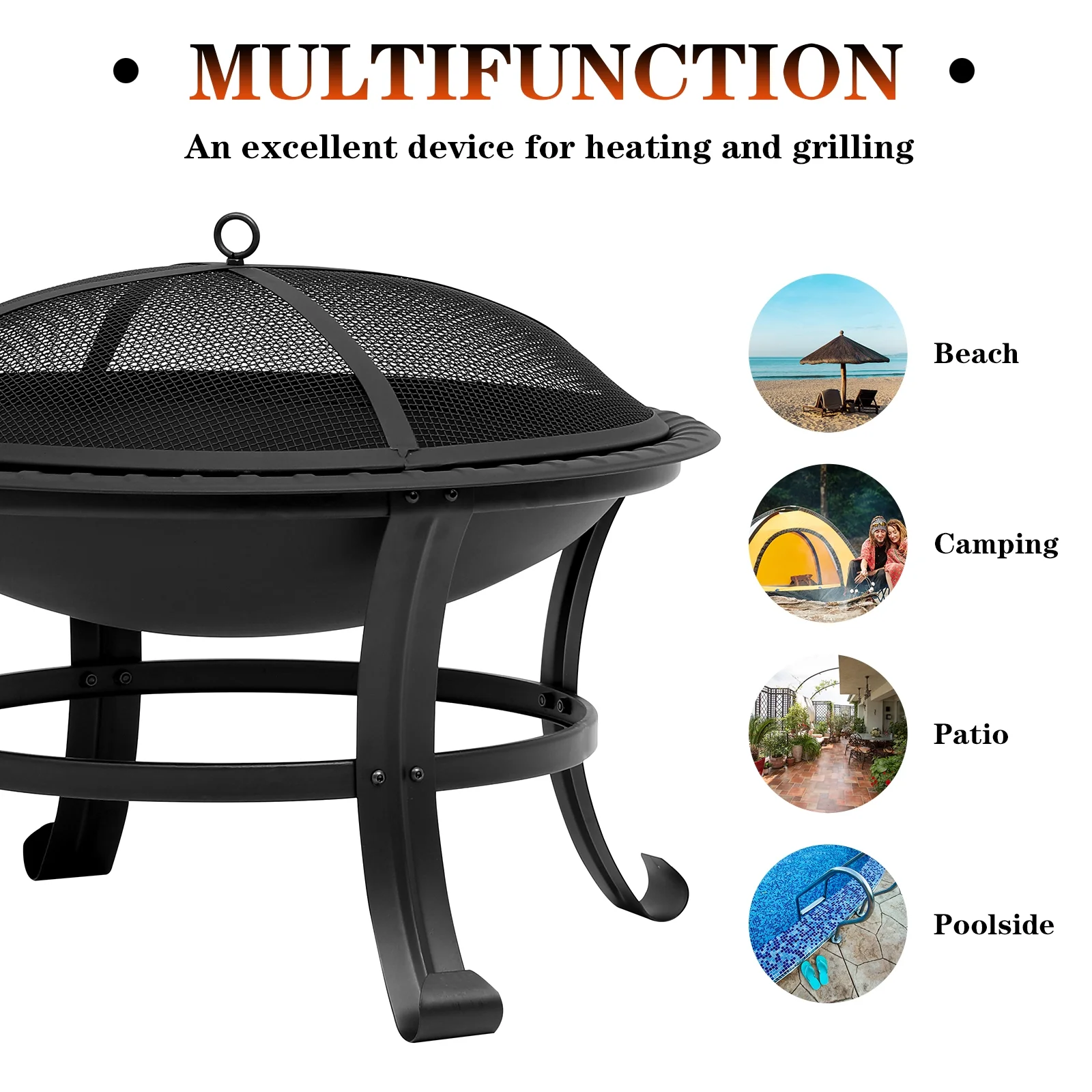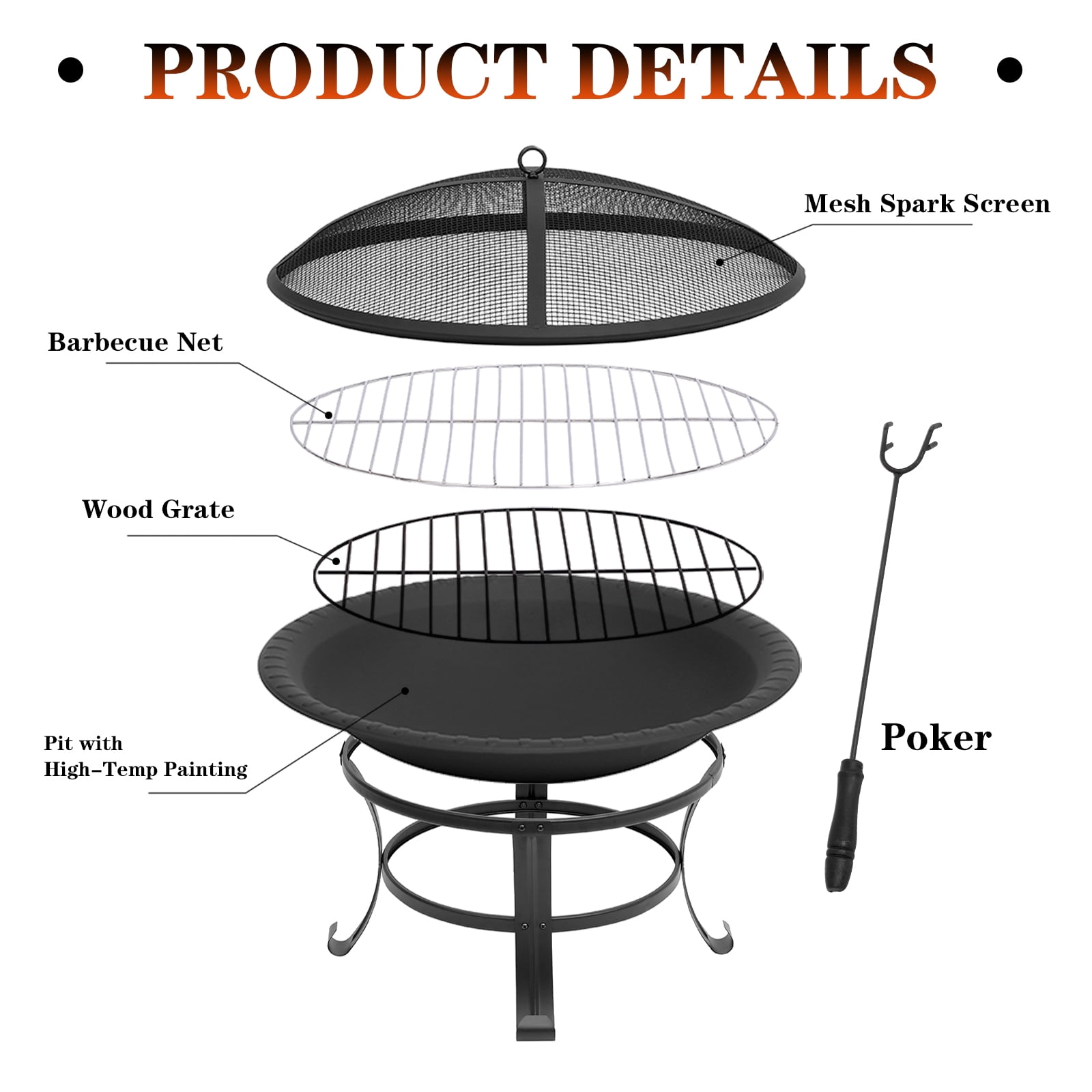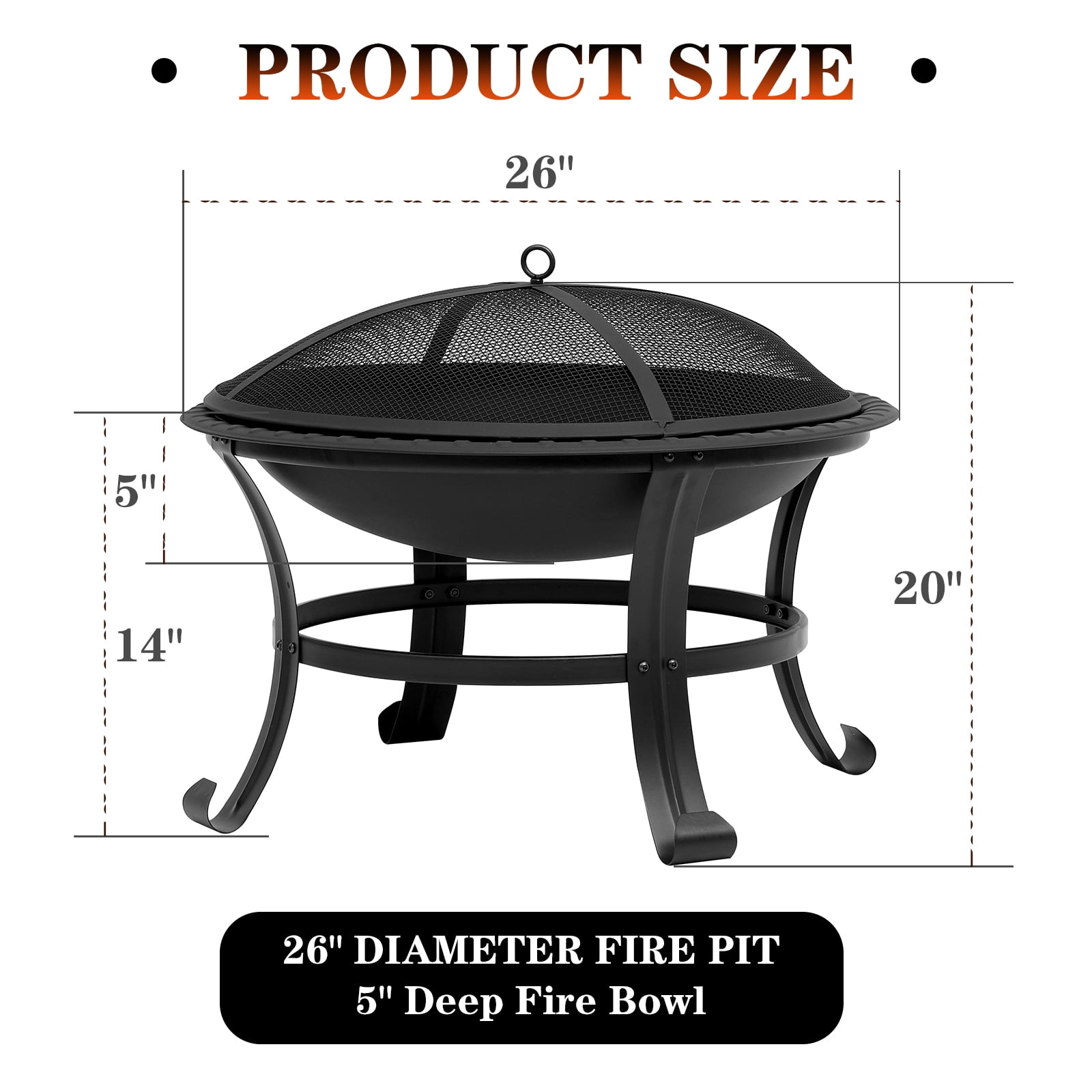 About this item. Multi-Purpose: The fire pit is suitable for multiple uses such as campfire, bonfire, or BBQ on the patio, by the pool, in the backyard, or carry it around with you. It can also be used as a gift for your family and friends to provide them with better services and products. Stable and Durable: The four-legged design makes the fire pit stable and safe, so that the fire pit is not easy to shake during use. This fire pit is made of durable steel with good weather resistance for long-term use. Safe to Use: The spark screen of the fire pit protects you from stray sparks and ashes. There is also a long poker for moving firewood and lifting the lid for safety. When not in use, we recommend storing it indoors. Great Design: Easy to Assemble. Folding design saves space. Compact size and light weight for burning, easy to carry when hiking and camping outdoors. Weather Resistant: This folding fire pit can be used in backyard, garden, camping, picnic and party, suitable for all seasons. Enjoy a cozy campfire with family and friends and create lasting and happy memories. If you have any questions or concerns, please feel free to contact us. Specification: Overall Dimension: D26″ * H20″ Weight:14.5 pounds Material: Steel Fuel Type: Wood Burning Package include: Steel Bowl*1 Fire Poker *1 Wood Grate *1 Mesh Spark Screen *1 Barbecue Net *1 Notice: For Safe Operation, Please Read All Assembly and Operating Instructions Before Use. Keep mesh spark cover on the fire pit while in use. Use a poker when remove the cover. The outdoor fire pit must be completely cooled off and all embers must be extinguished before any cover can be used.