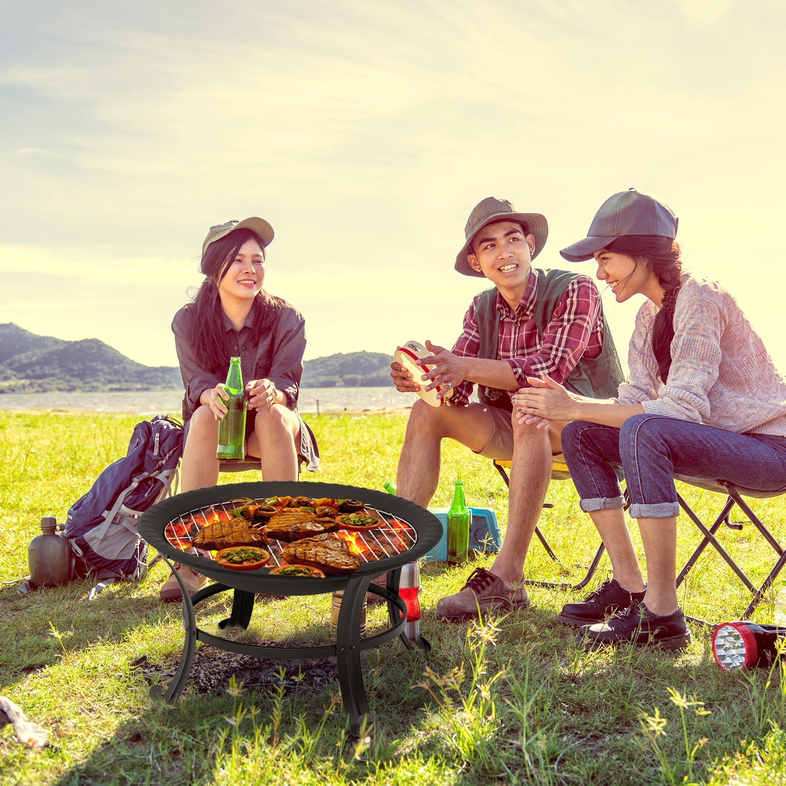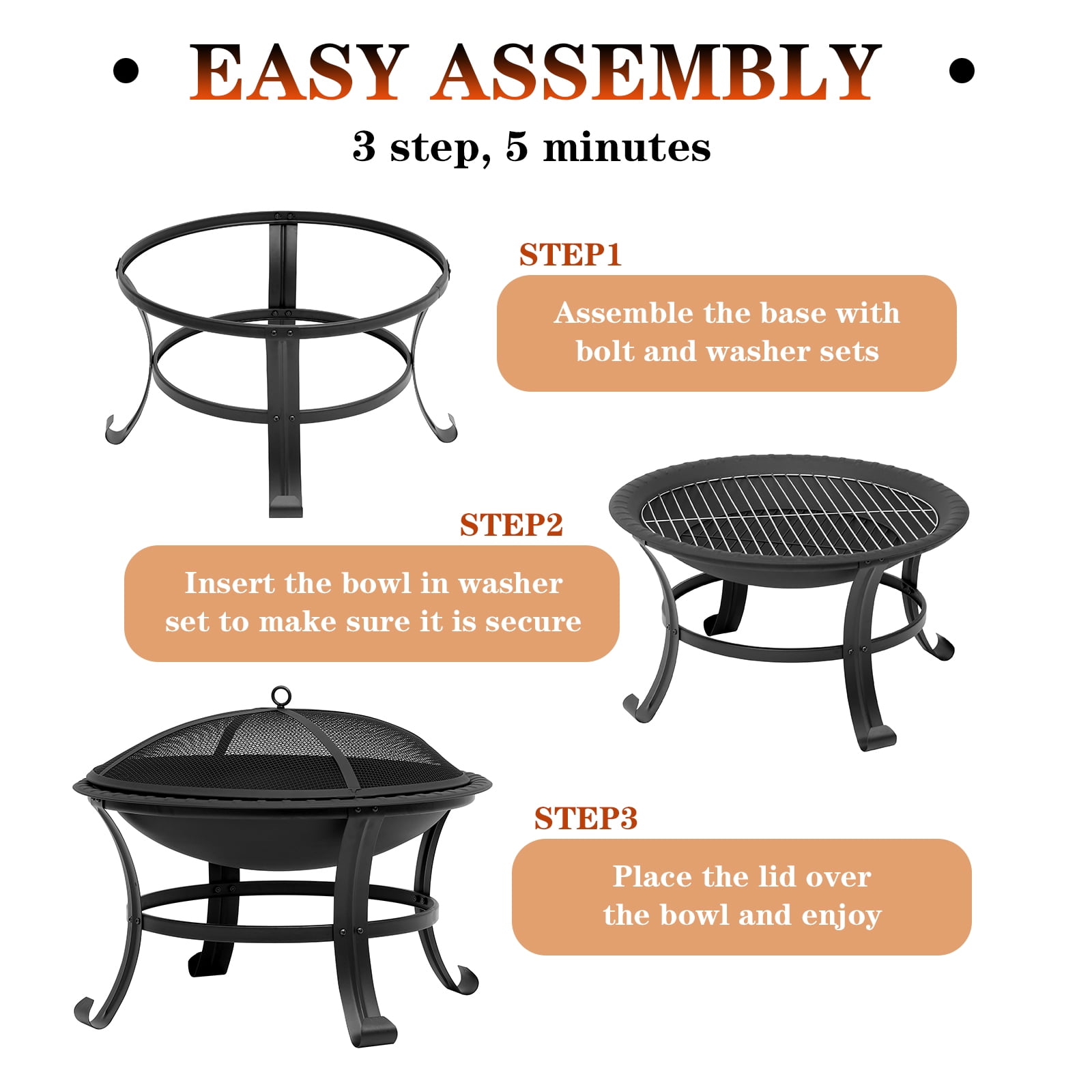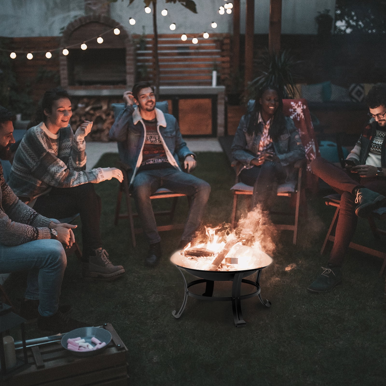 About this item. Multi-Purpose: The fire pit is suitable for multiple uses such as campfire, bonfire, or BBQ on the patio, by the pool, in the backyard, or carry it around with you. It can also be used as a gift for your family and friends to provide them with better services and products. Stable and Durable: The four-legged design makes the fire pit stable and safe, so that the fire pit is not easy to shake during use. This fire pit is made of durable steel with good weather resistance for long-term use. Safe to Use: The spark screen of the fire pit protects you from stray sparks and ashes. There is also a long poker for moving firewood and lifting the lid for safety. When not in use, we recommend storing it indoors. Great Design: Easy to Assemble. Folding design saves space. Compact size and light weight for burning, easy to carry when hiking and camping outdoors. Weather Resistant: This folding fire pit can be used in backyard, garden, camping, picnic and party, suitable for all seasons. Enjoy a cozy campfire with family and friends and create lasting and happy memories. If you have any questions or concerns, please feel free to contact us. Specification: Overall Dimension: D26″ * H20″ Weight:14.5 pounds Material: Steel Fuel Type: Wood Burning Package include: Steel Bowl*1 Fire Poker *1 Wood Grate *1 Mesh Spark Screen *1 Barbecue Net *1 Notice: For Safe Operation, Please Read All Assembly and Operating Instructions Before Use. Keep mesh spark cover on the fire pit while in use. Use a poker when remove the cover. The outdoor fire pit must be completely cooled off and all embers must be extinguished before any cover can be used.