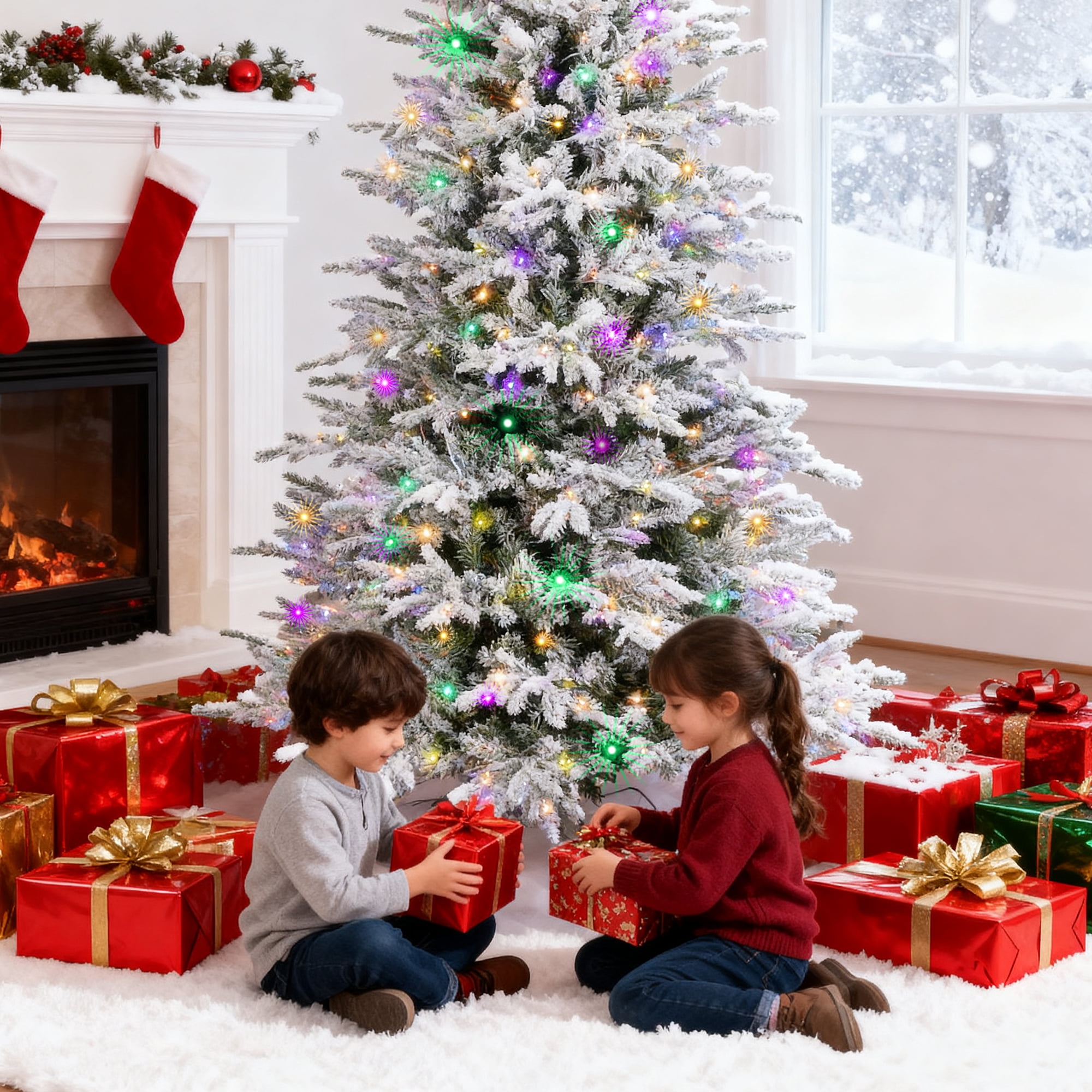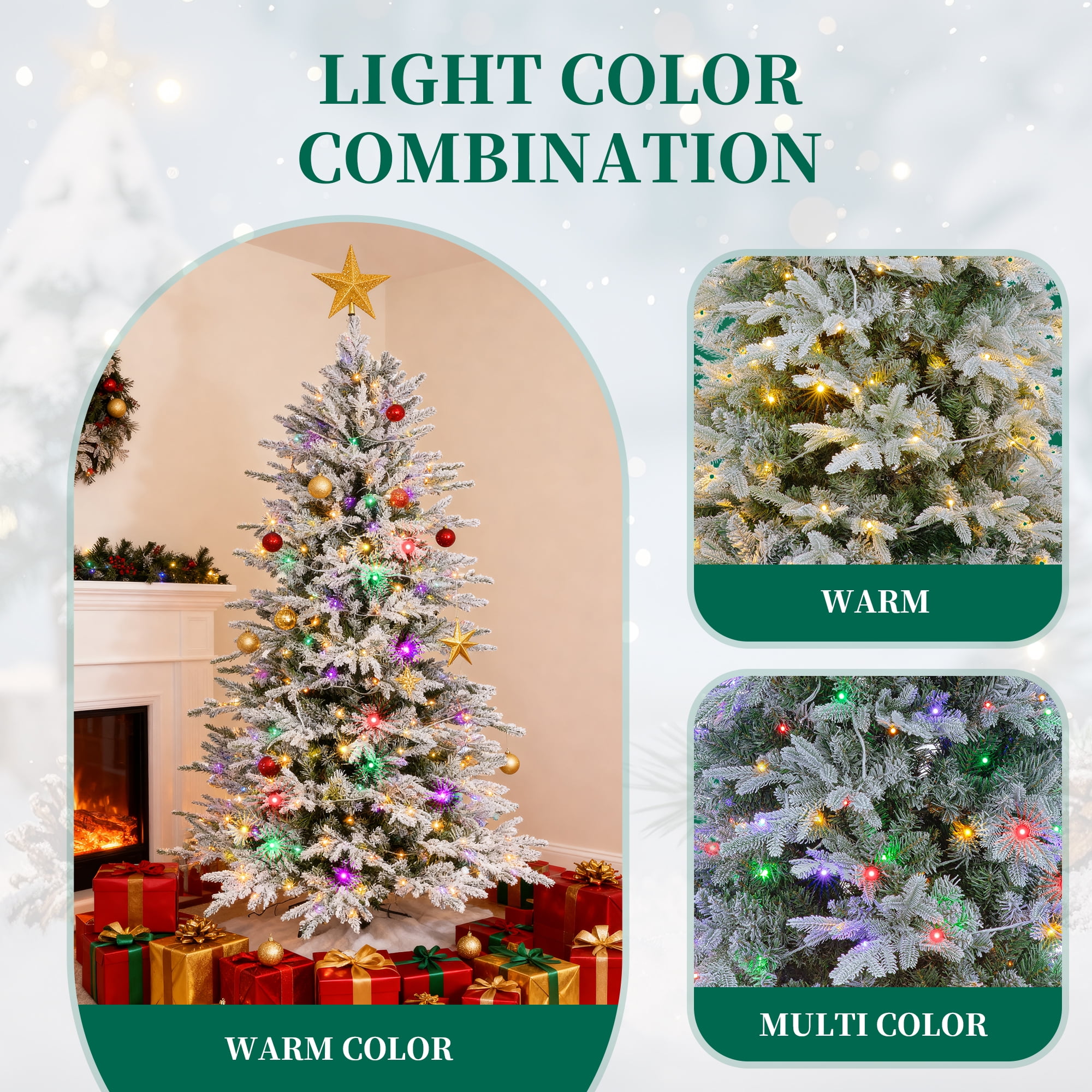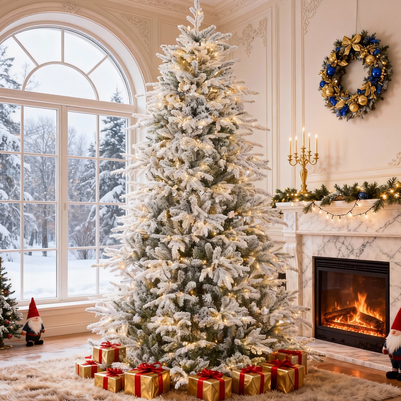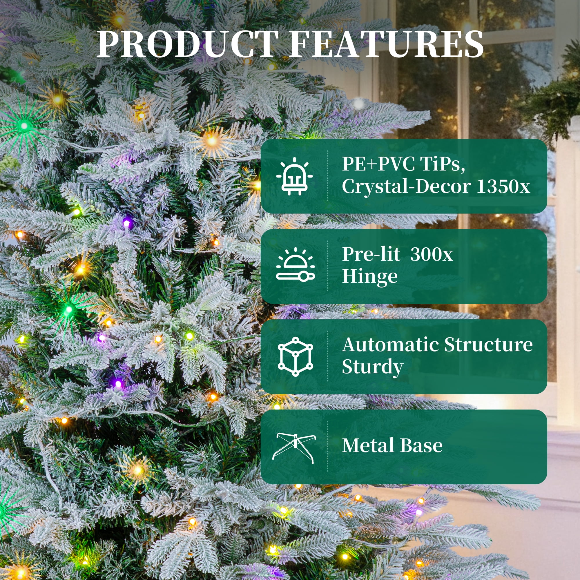 Vebreda 6ft Pre-Lit Flocked Artificial Aspen Noble Fir Christmas Tree with 1,350 Branch Tips & 300 LED Lights, Hinged Artificial Holiday Tree with Metal Stand