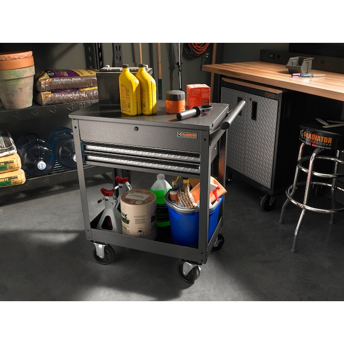 The 2-Drawer Utility Cart is easy to move, so you can bring your tools right to your latest project. Four heavy-duty 5″ swivel casters are welded to the bottom tray for structural durability and smooth mobility. Keep frequently used tools within easy reach in the upper locking tray, in either of the two drawers, or in the large lower tray. Cushioned liners help keep contents from sliding and protect the bottom of each tray and drawer. The cart offers rugged durability, steel construction with a hammered granite finish, and a hassle-free 10-year limited warranty.