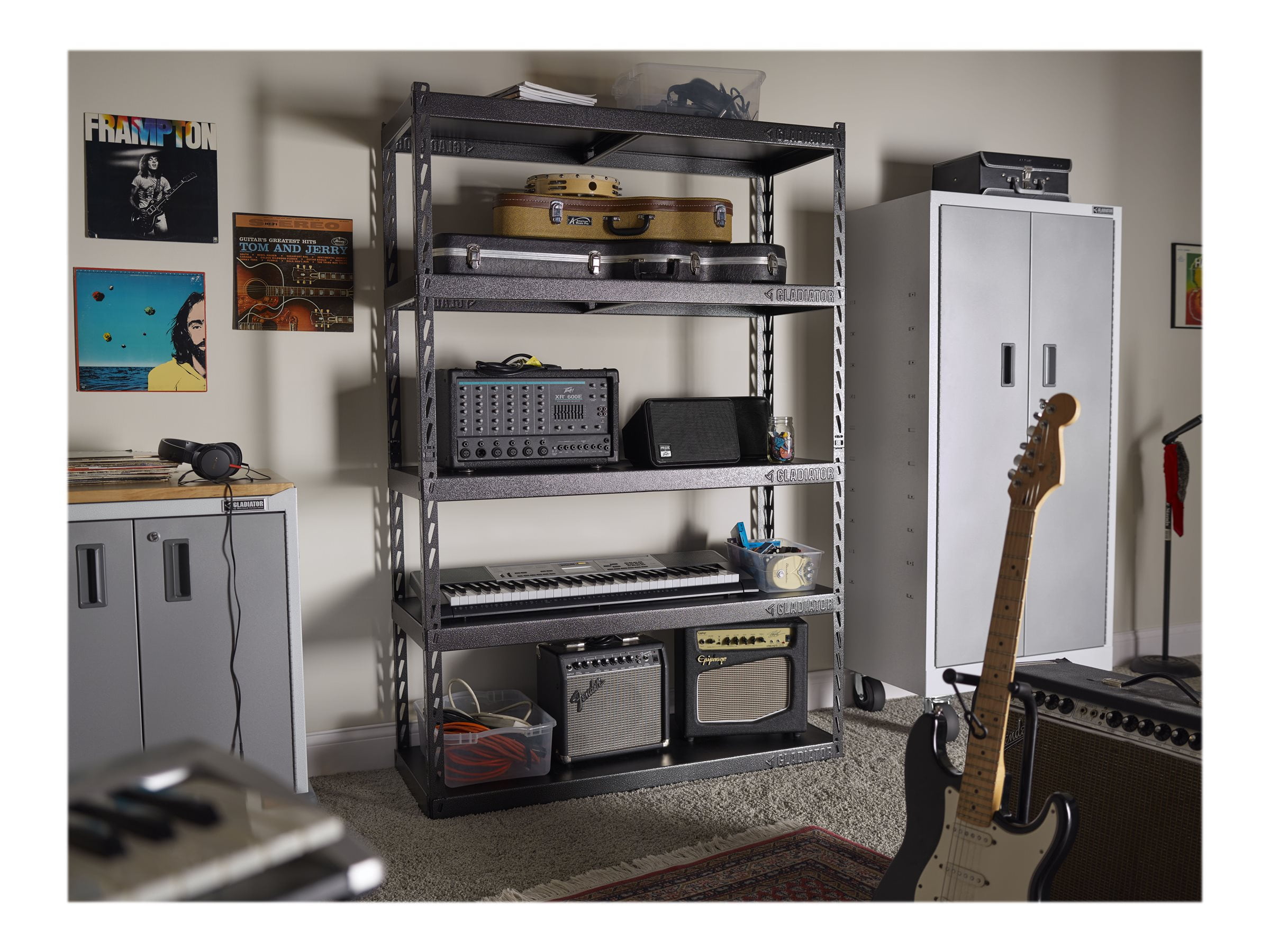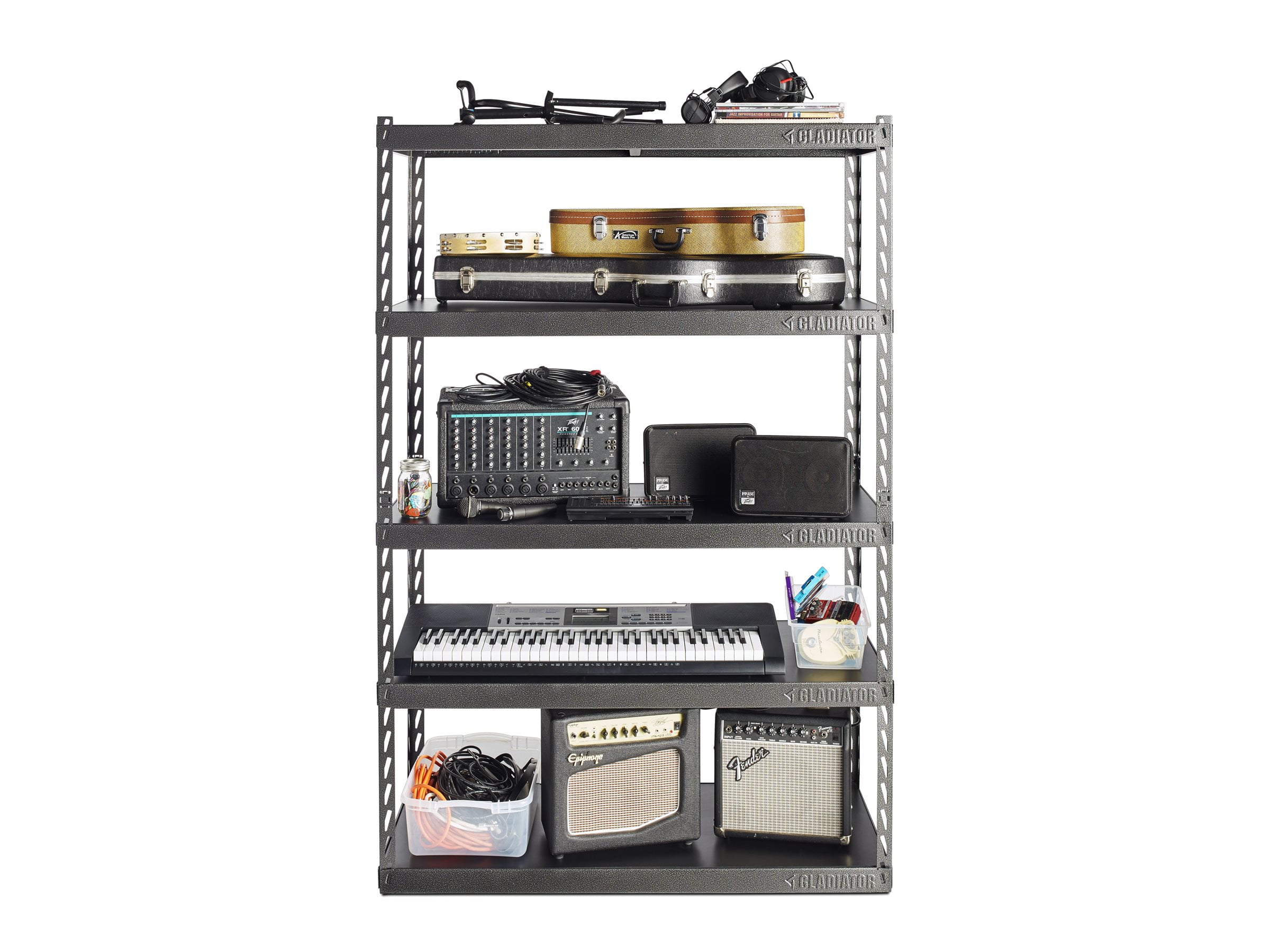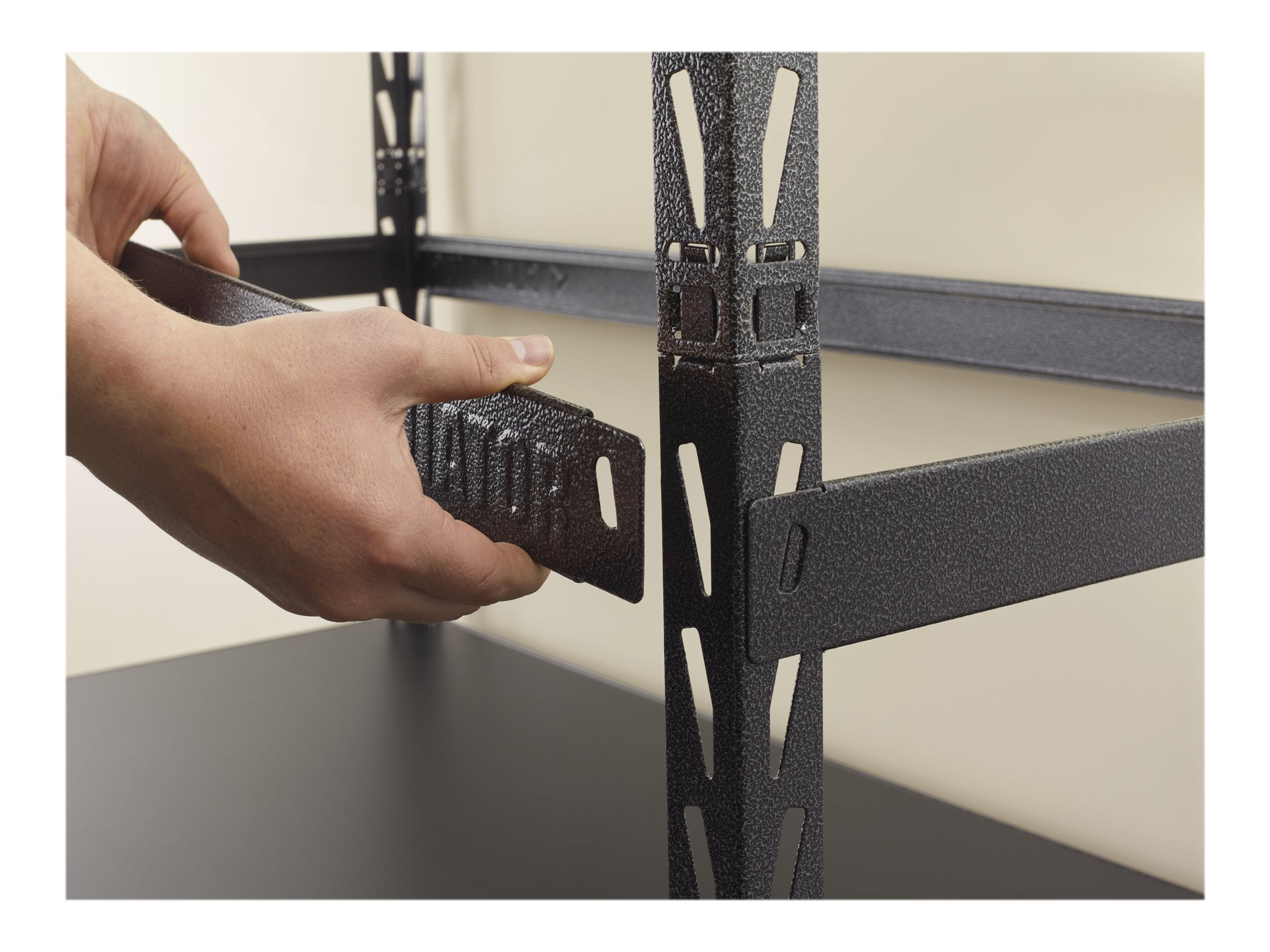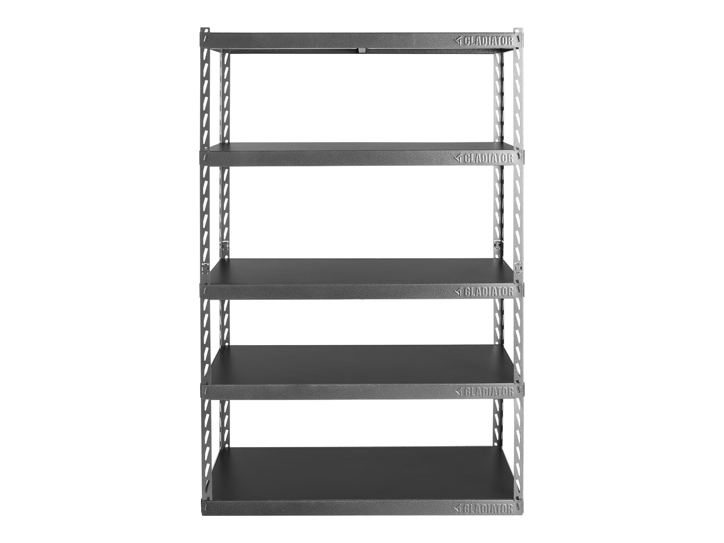 Five full-width laminate shelves each hold up to 1,000 lb Innovative click-and-lock system for easy assembly Steel frame Open-concept design 48″ wide x 72″ high x 18″ deep 10-year limited warranty
