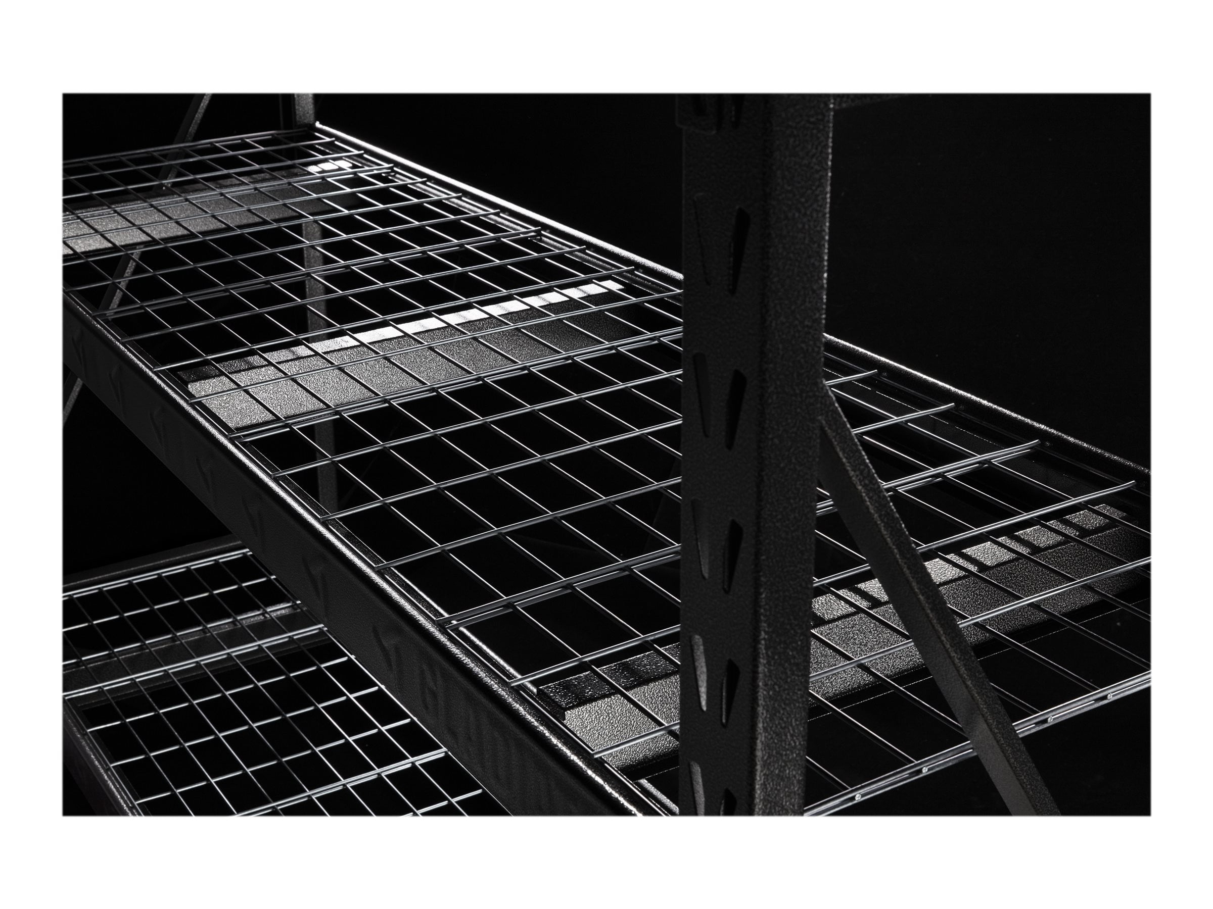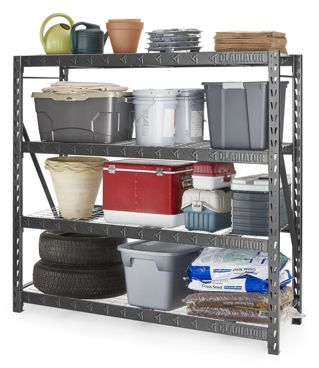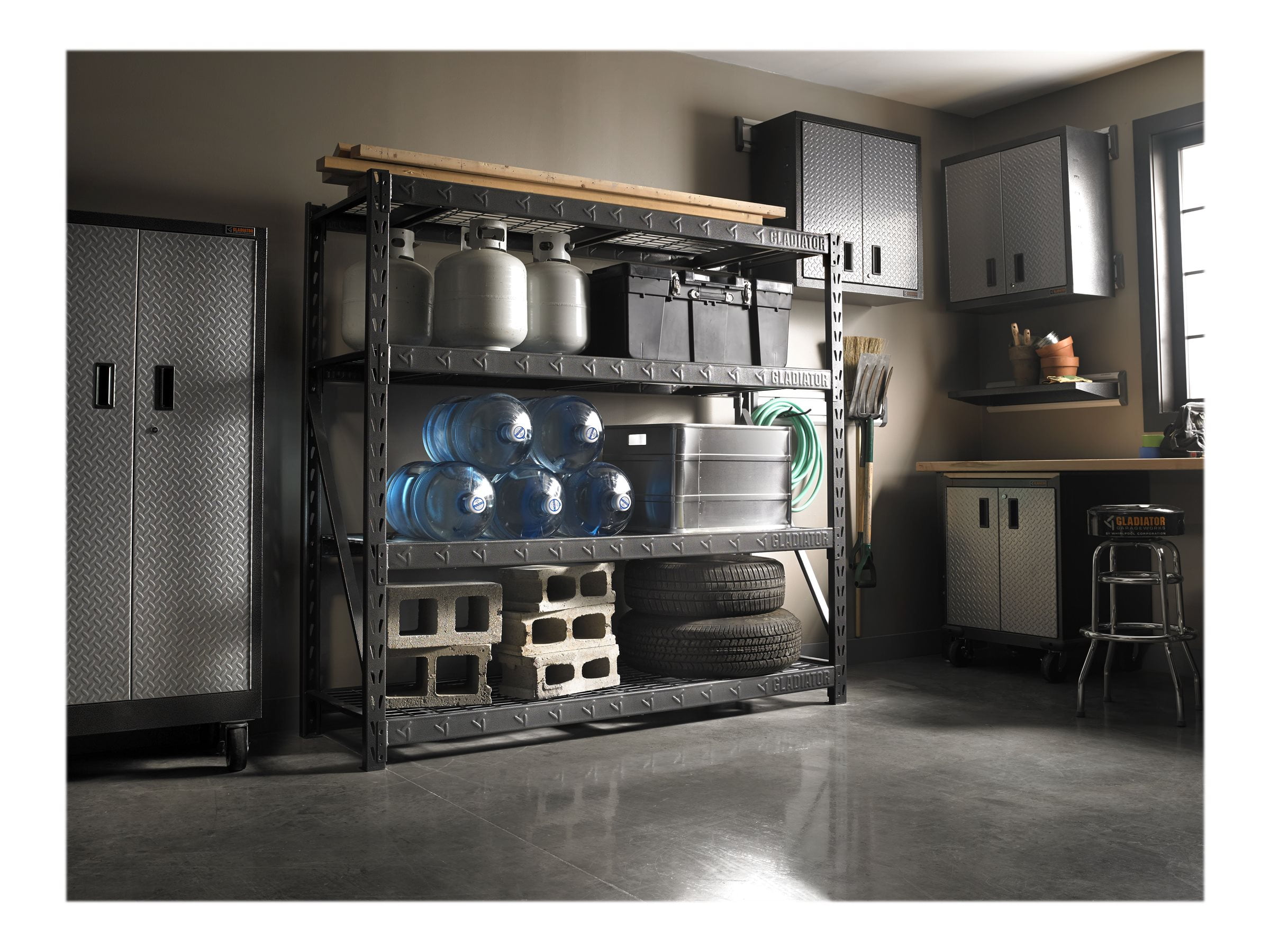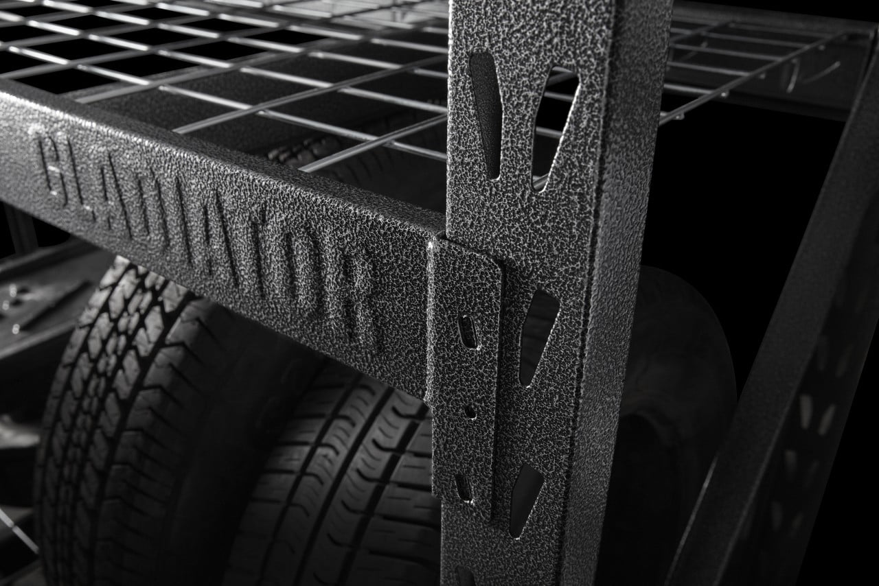 Store large and bulky items on the Gladiator® Rack Shelving unit. This storage unit is fast and easy to assemble at home, and does not require tools. The welded steel frame features four metal shelves that can support up to 2,000 lbs each, and the dual slot profile allows for additional supports and shelves. Also available in 60″ wide x 18″ deep and 48″ wide x 18″ deep configurations. Product Literature