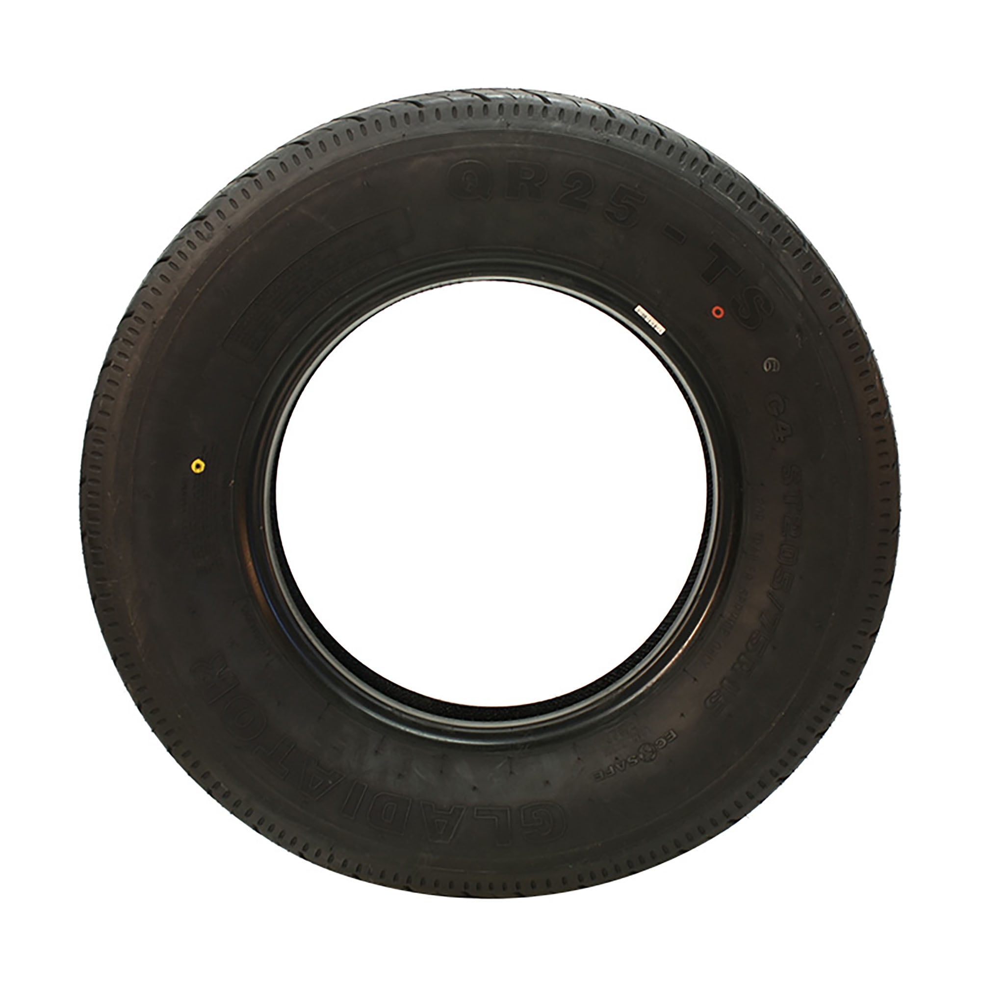 Gladiator QR25-TS Trailer ST205/75R14 105/101N D OVERVIEW Designed for use in light industrial application and on recreational vehicles, the Gladiator QR25-TS Trailer tire features a special rubber compound and sturdy bias construction that not only helps in adding extra strength and durability but also aid in resisting weather cracking and lowering rolling resistance for improved fuel efficiency. While the reinforced sidewall of the QR25-TS Trailer makes it perfect for trailers as it resists punctures, the stone ejectors found within grooves protect casing the casing from damage by avoiding any kind of stone drilling.