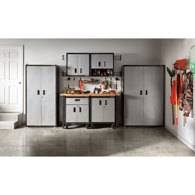 This heavy-duty steel cabinet is as tough as it looks. The Ready to Assemble Full Door Modular GearBox offers accessible storage for a variety of tools and garage gear. For even more versatility, add the optional Ready to Assemble Caster Kit or 28″ Hardwood Work Top. Like many Gladiator® products, this cabinet is backed by a 10-year limited warranty.