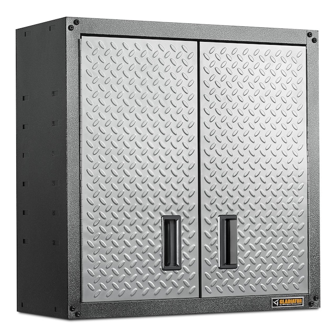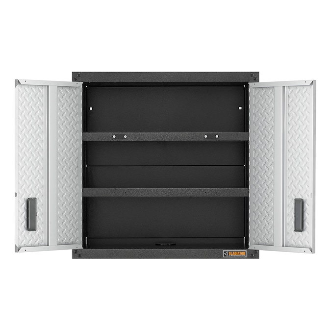 Ideal for smaller automotive or gardening gear, the Ready-To-Assemble Full-Door Wall GearBox easily mounts and repositions on Gladiator® GearWall® Panels or GearTrack® Channels with the included brackets. This heavy-duty steel cabinet with hammered granite finish and matching doors is as tough as it looks and is backed by a 10-year limited warranty.