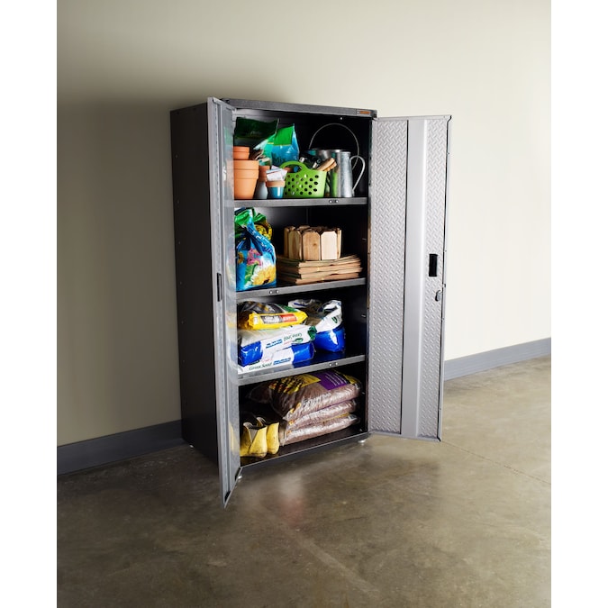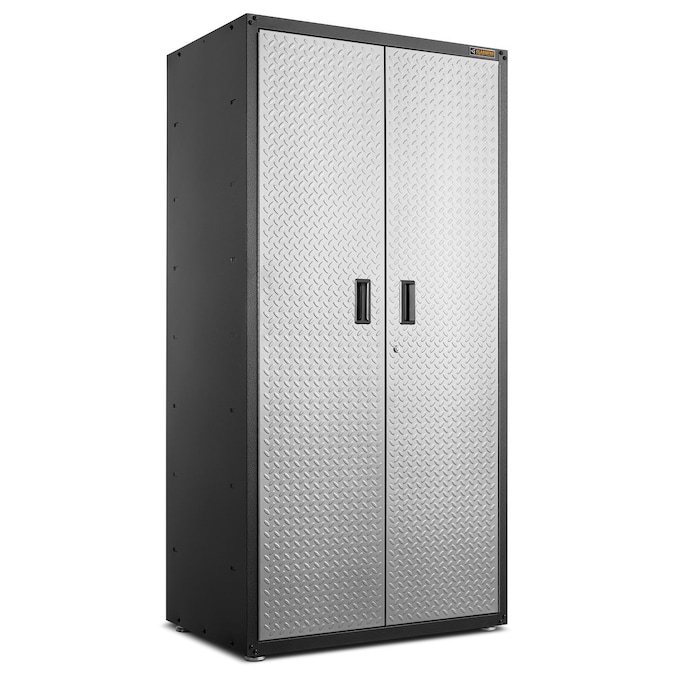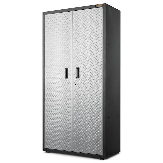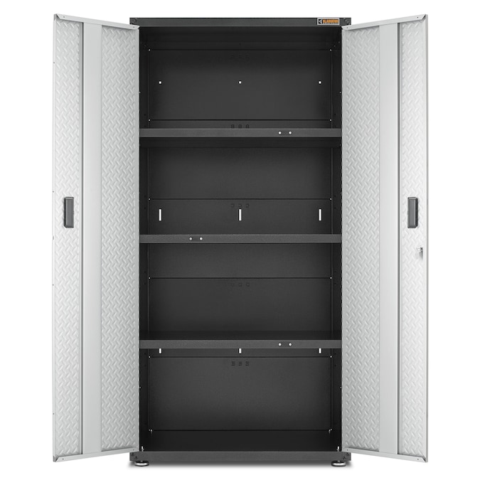 The Gladiator Jumbo GearBox stands six feet tall and two feet deep to easily hold your larger items. Three full-width shelves provide exceptional storage space for everything from camping gear to sports equipment. Locking tread-plate doors with large recessed handles ensure that your gear stays safely stored. A wall bracket kit is included to make this storage cabinet easy to hang and reposition on Gladiator wall systems. Not compatible with caster kit.