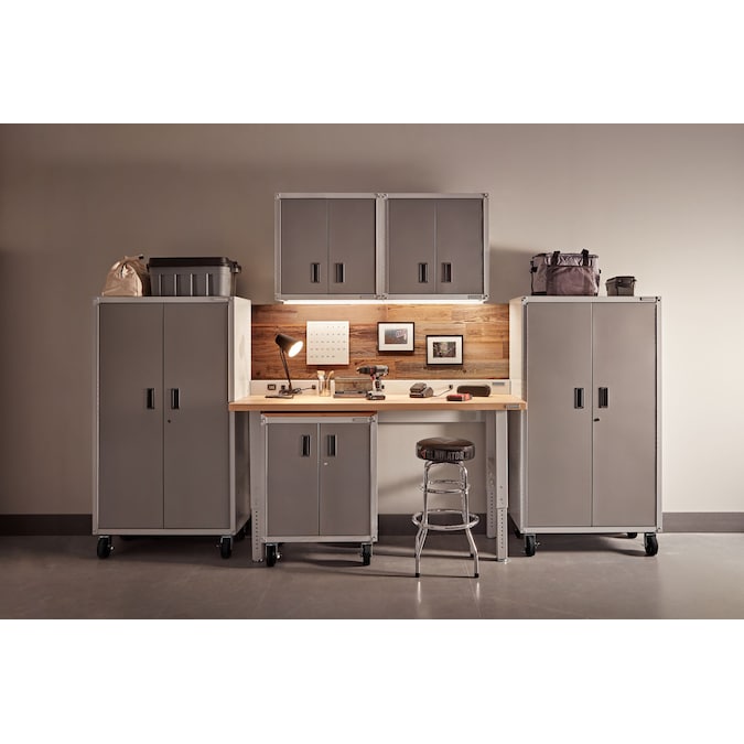 - Wall bracket kit included to move the cabinet up off the floor and onto any Gladiator® wall system, increasing wall storage capacity and freeing up floor space