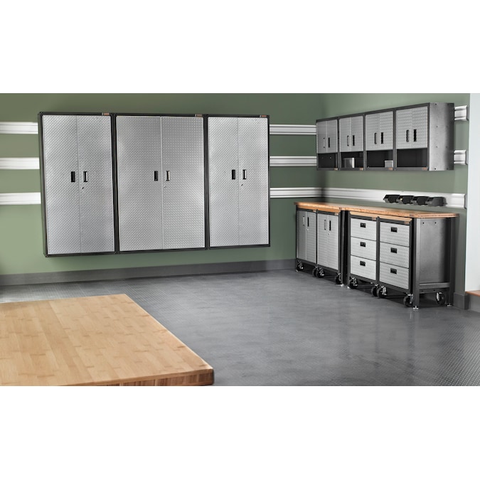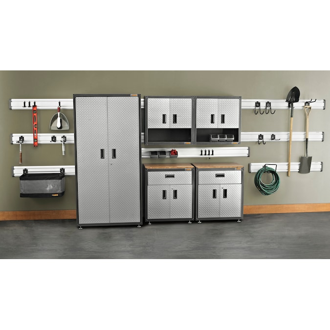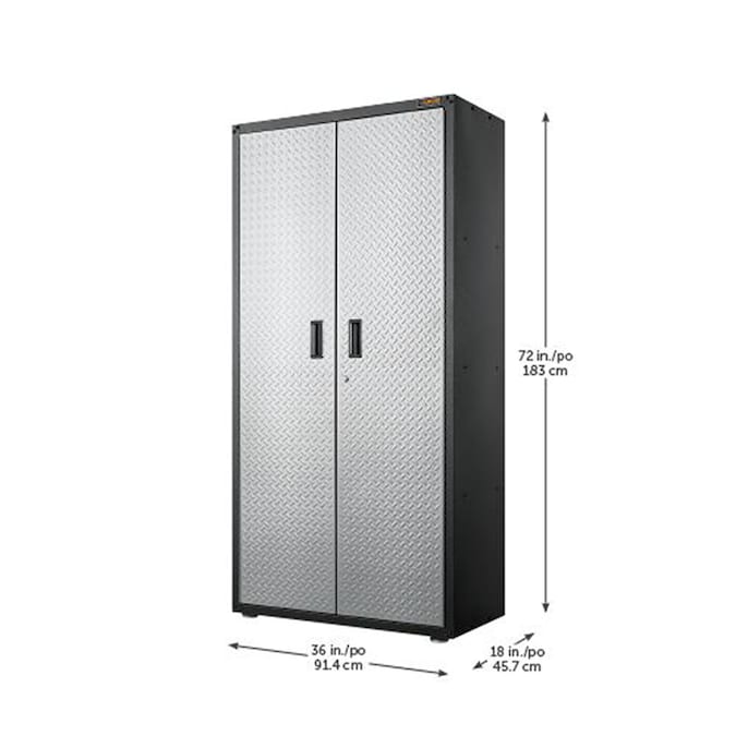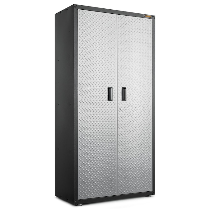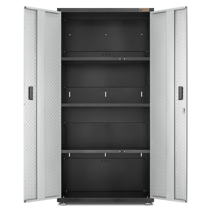 This heavy-duty steel cabinet with hammered granite finish and silver tread doors is as tough as it looks. At six feet tall and one-and-a-half feet deep, the Ready-to-Assemble Large GearBox has four levels of storage to accommodate gardening tools, paint supplies, and automotive gear. Like many Gladiator® products, this cabinet is backed by a 10-year limited warranty. Not compatible with caster kit.