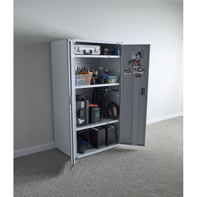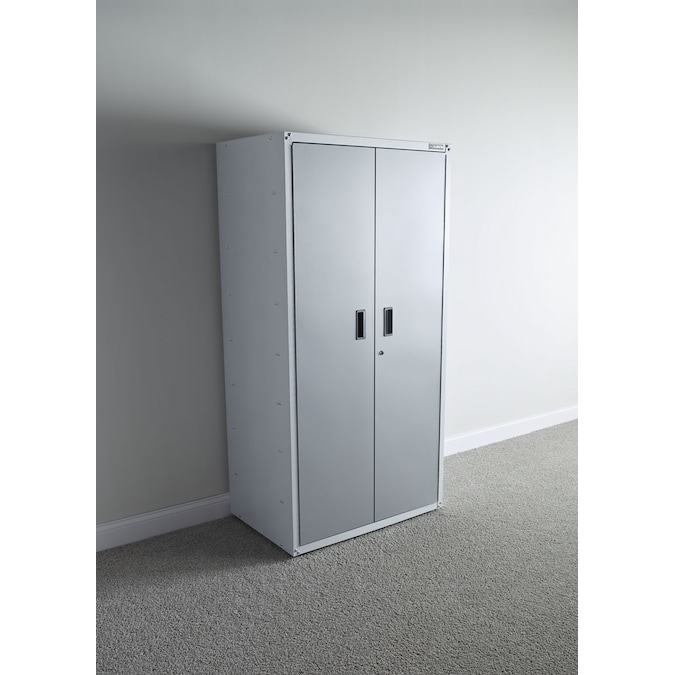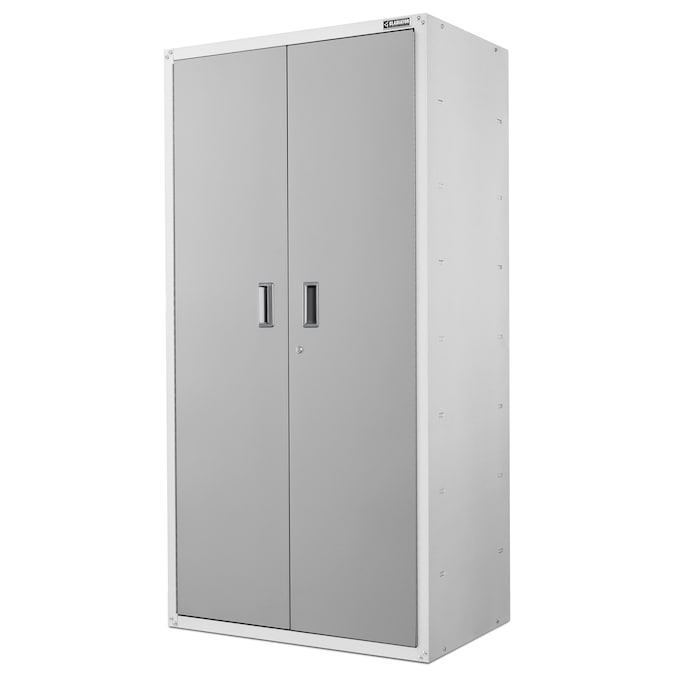 This heavy-duty steel cabinet with hammered white finish and matching doors is as tough as it looks. At six feet tall and one and a half feet deep, the Ready-to-Assemble Large GearBox has four levels of storage to accommodate gardening tools, paint supplies and automotive gear. Like many Gladiator® products, this cabinet is backed by a 10-year limited warranty. Not compatible with caster kit.