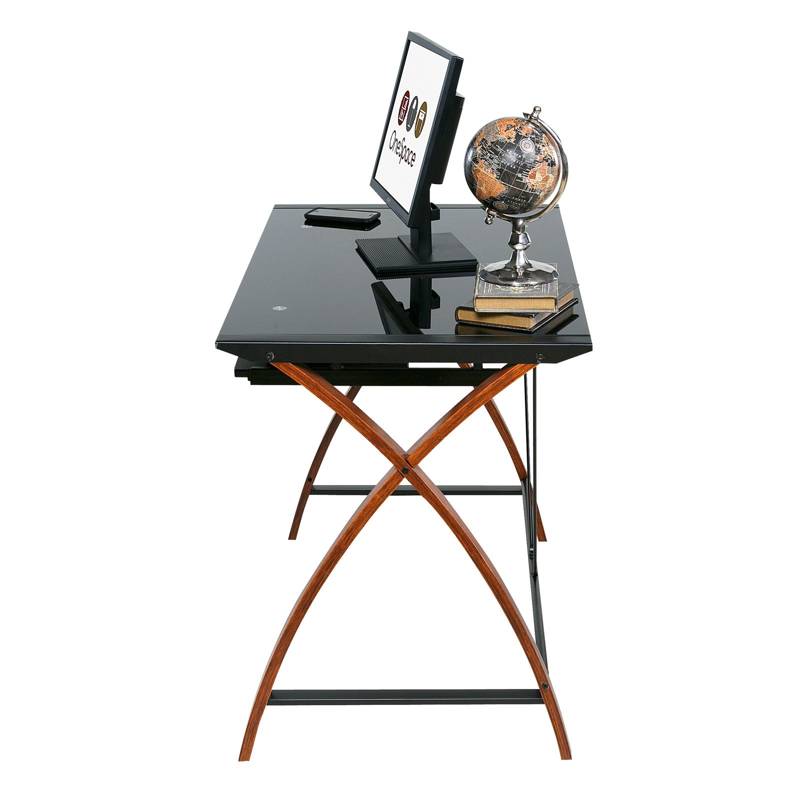 Dimensions: 39.37 W x 23.62 D x 29.13 H in. Wooden and metal base with tempered glass top Pull-out keyboard shelf Natural brown finish with smoked glass top Elegantly slim form Perfect for work or gaming