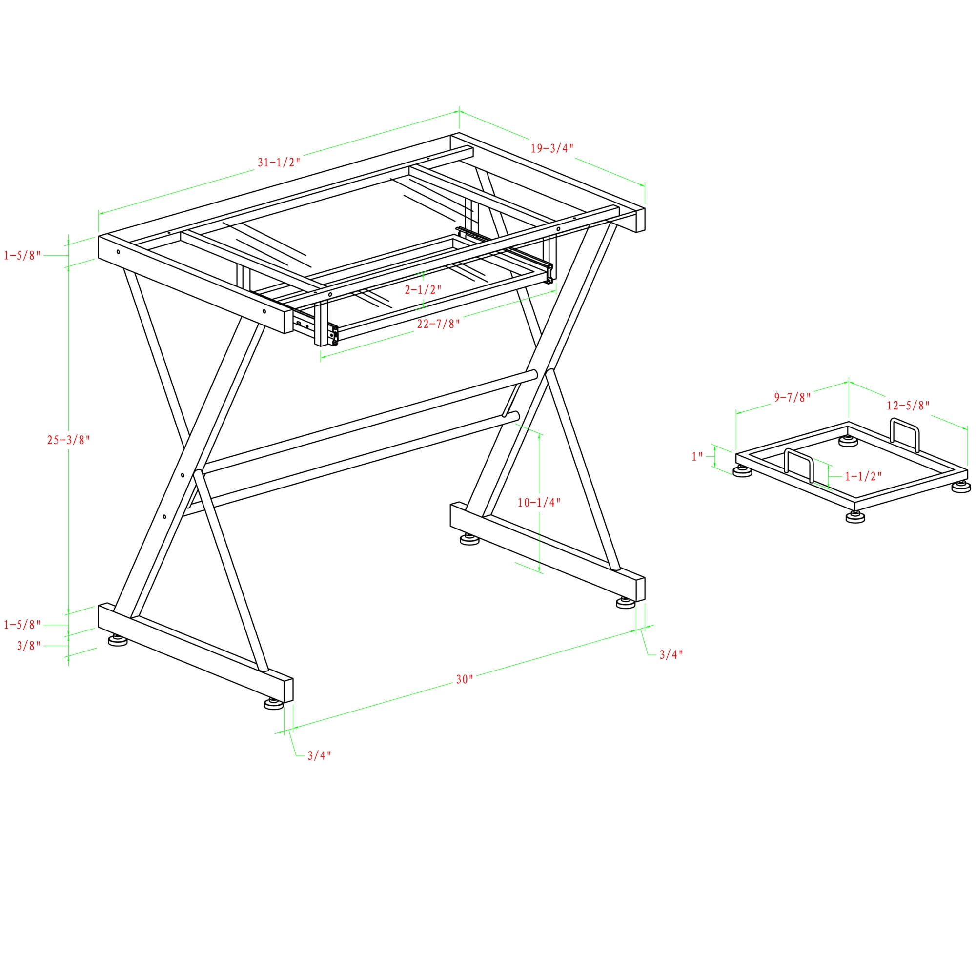 Glass Top Black Computer Desk with Pull-Out Keyboard Tray by Manor Park Packaged Dimensions: 6” H x 34” L x 24” W Assembled Dimensions: 29″ H x 31″ L x 18″ W Materials: Tempered safety glass and powder-coated steel Assembly: Some assembly required Black finish Modern computer desk Angular frame Rectangle, beveled-glass tabletop Sliding keyboard tray Supports up to 100 lbs.