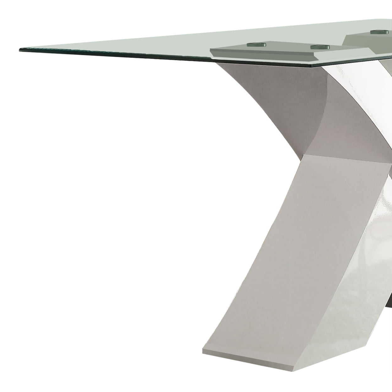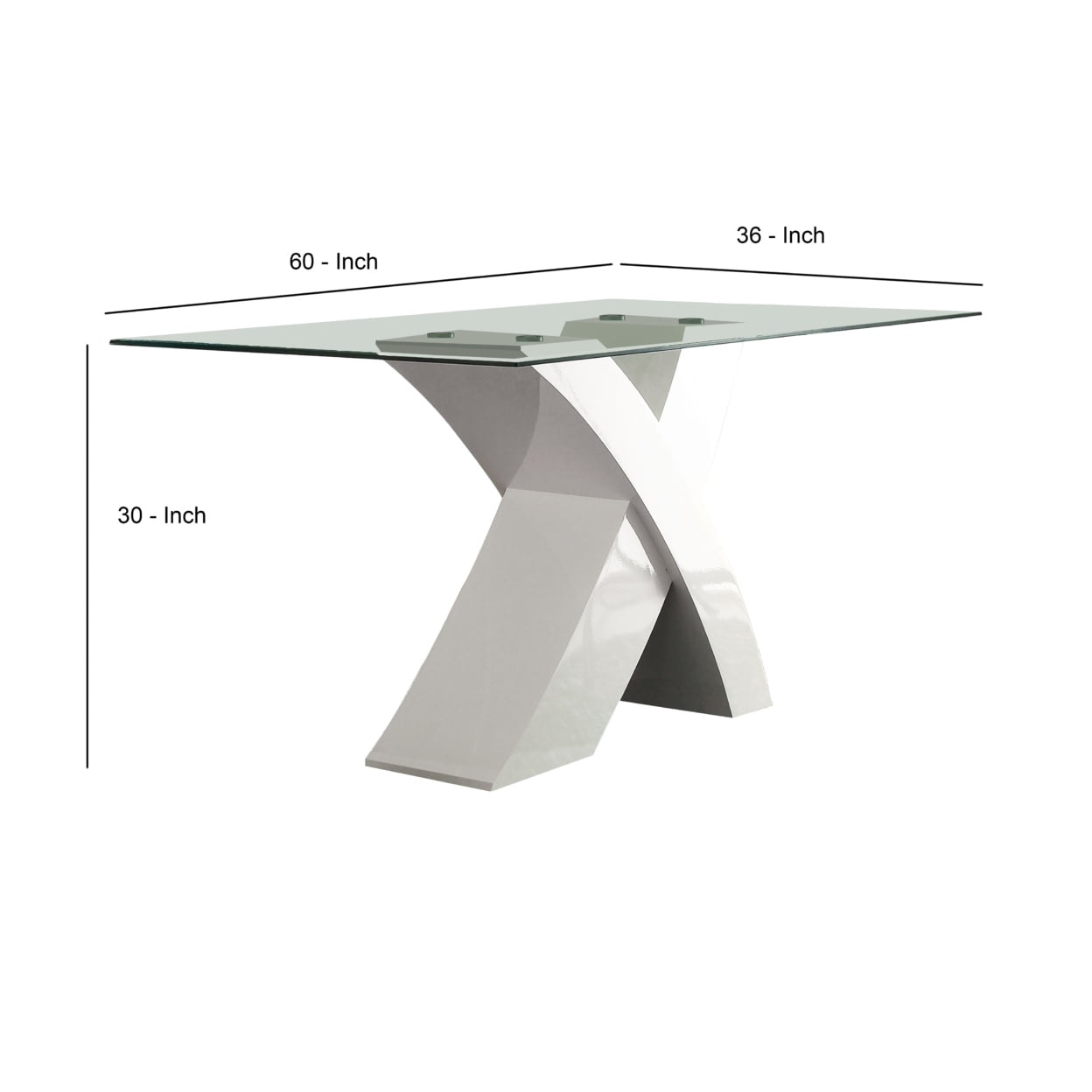 Glass Top Dining Table With X Shape Wooden Base White and Clear – Saltoro Sherpi Bring this designer dining table home it goes well with your existing decor. This dining table features a smooth clear tempered glass top with beveled edge and supported on X shaped wooden pedestal base in white finish providing a unique design and strength. Perfect furniture piece for your modern dining setting and can easily accommodate four diners. Specifications: It consists of one dining table only It features 10mm clear tempered glass top in rectangular shape with 25mm beveled edge. Designer X shaped pedestal base is constructed from an engineered wood that offers lasting durability. Overall Dimensions: 60 inches in Length x 36 inches in Width x 30 inches in Height Can easily accommodate four people for dining.