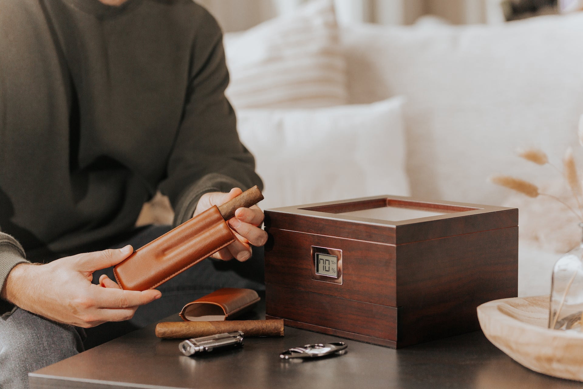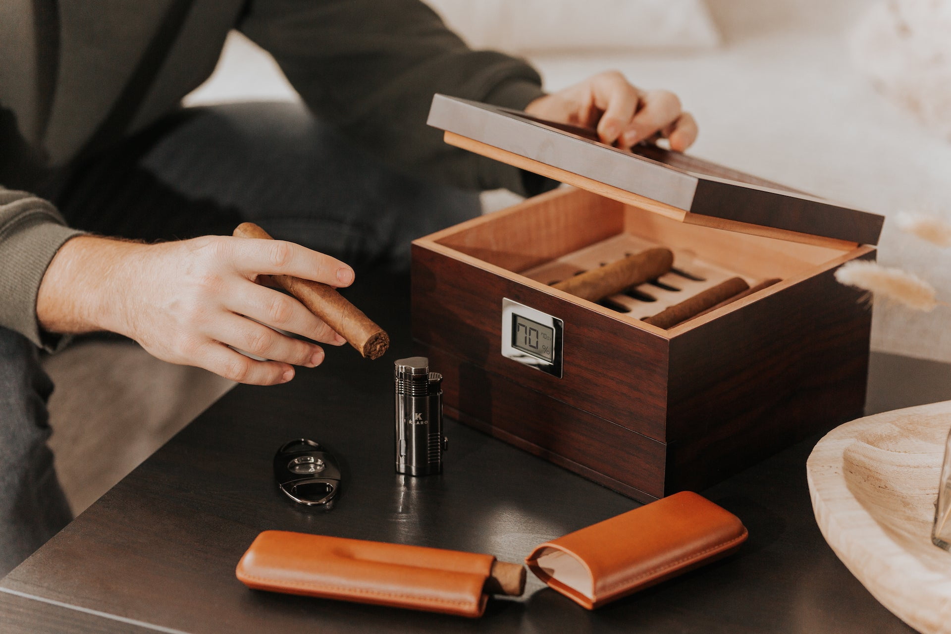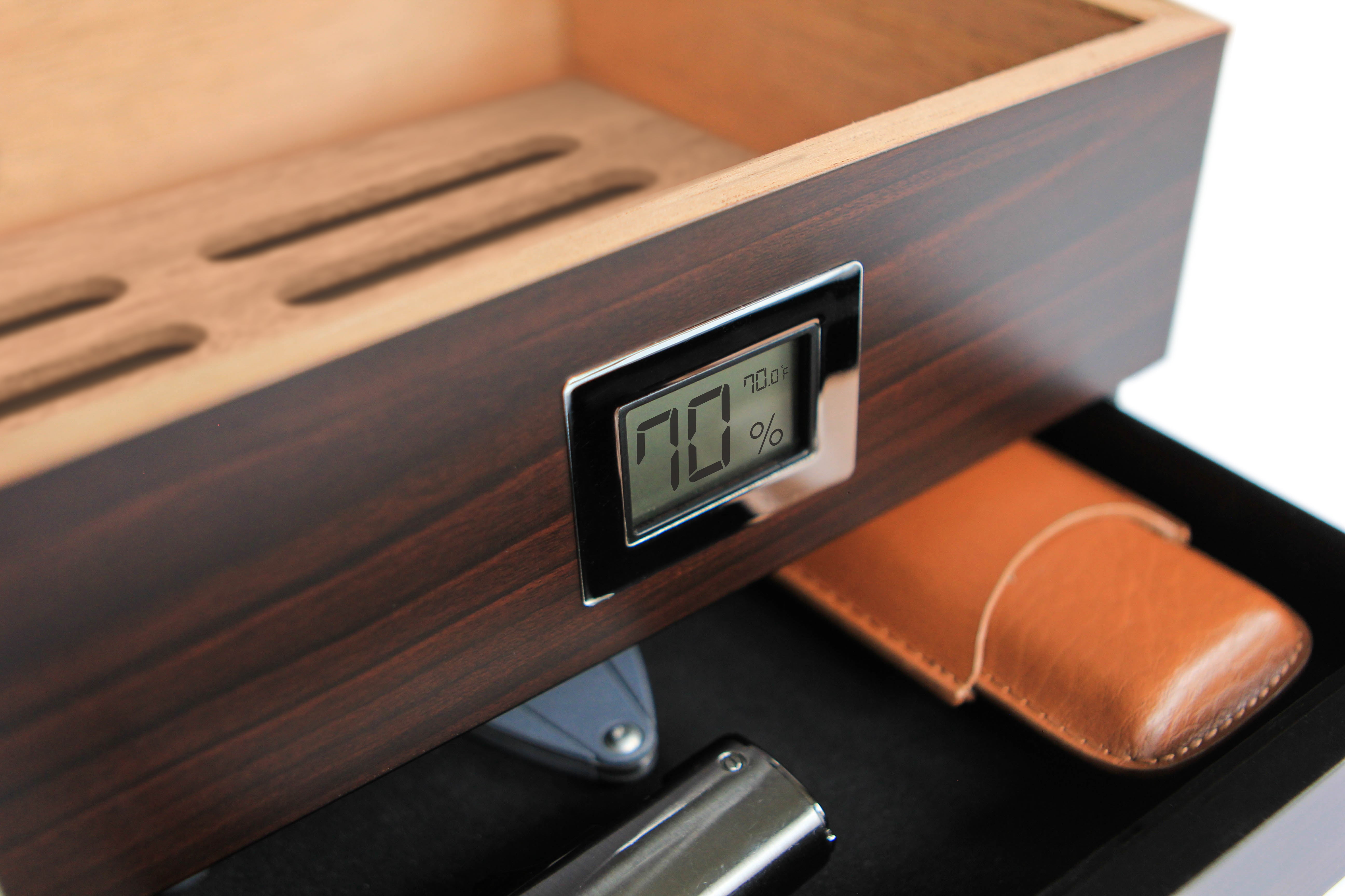 DIGITAL HYGROMETER- The Renzo Humidor comes with an embedded pre-calibrated digital hygrometer that accurately reads the humidity levels. Create the ideal environment for your cigars. ACCESSORY STORAGE – Properly store your lighter, cigar cutters, and even a travel case in the large bottom slide-out accessory storage drawer. The minimal design tastefully sits flush against the humidor when closed. (Accessories Not Included) HYDRO SYSTEM – an accurate and low maintenance cigar humidification system that regulates your CE humidor to 65-70% relative humidity. This patent-pending design evenly distributes the humidity from edge to edge while eliminating that awkward space taken up by a humidification jar. GLASS DISPLAY TOP – The top lid boasts a large stunning tempered glass display properly showing off your collection of fine smokes. SPANISH CEDAR – Real Spanish cedar coaming and inlay makes this humidor a moisture-holding machine. Keep those smokes just how you like them. If it’s not MAGNETICALLY SEALED it’s not a Case Elegance humidor. The magnetic enclosure creates an amazingly tight seal and easily passes the dollar bill test.