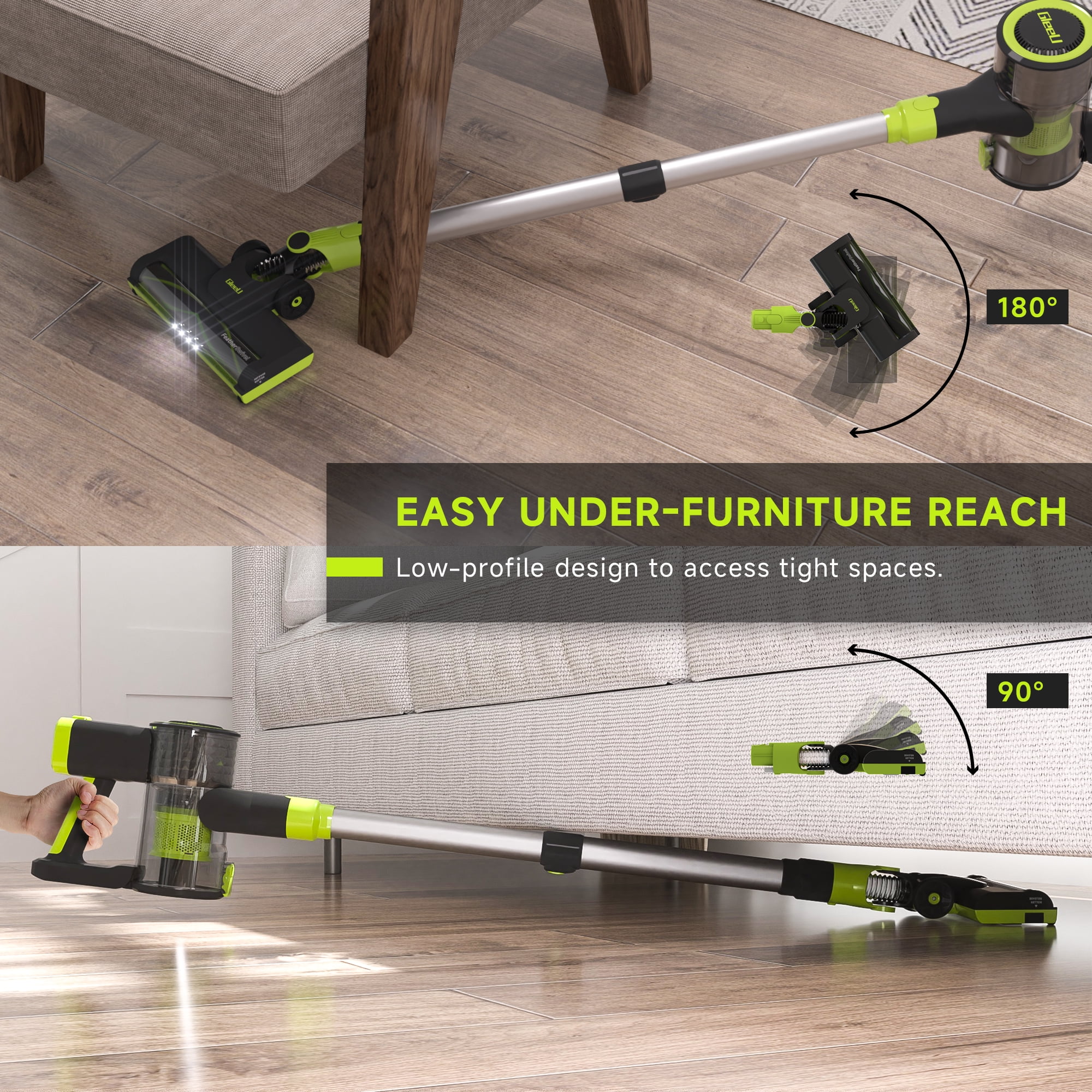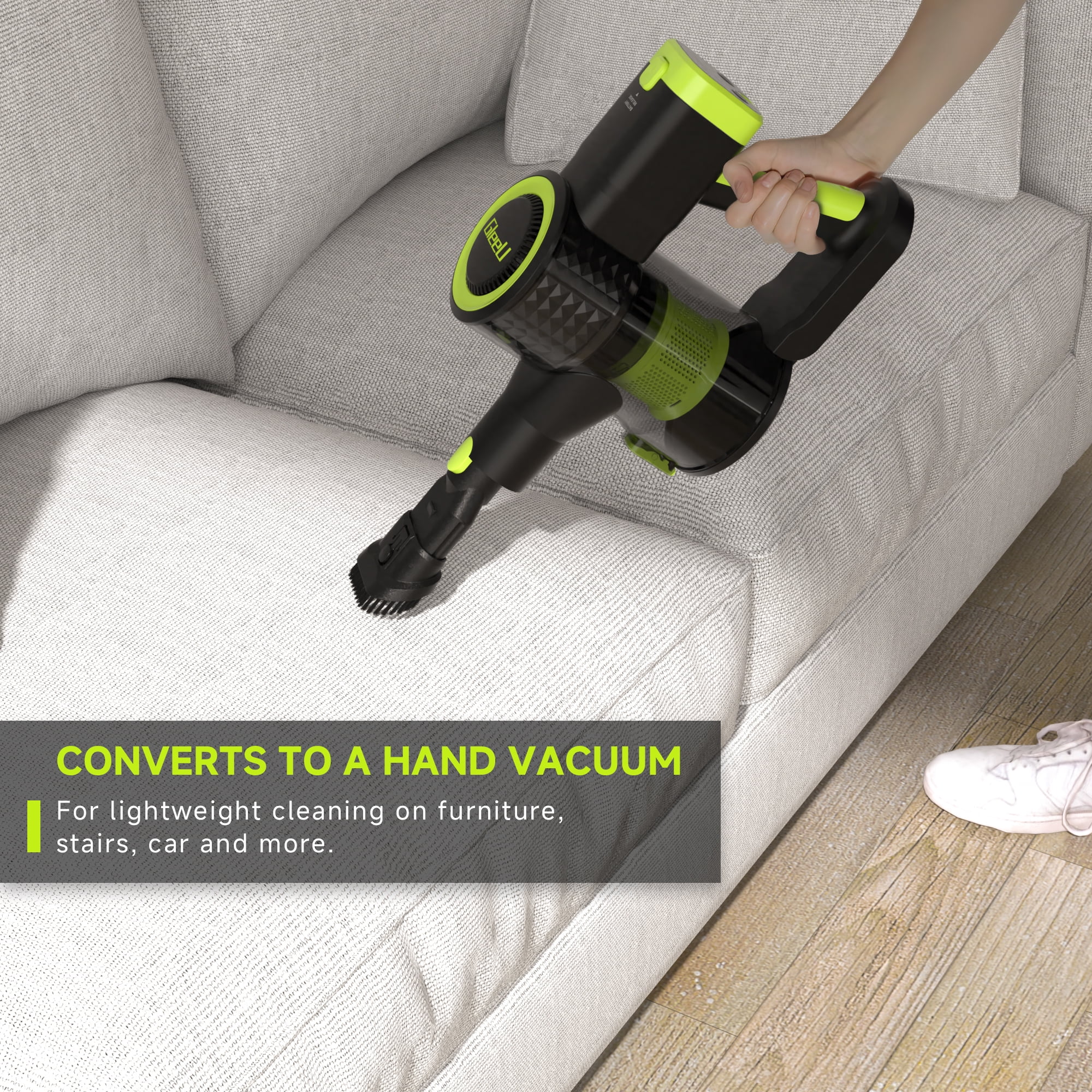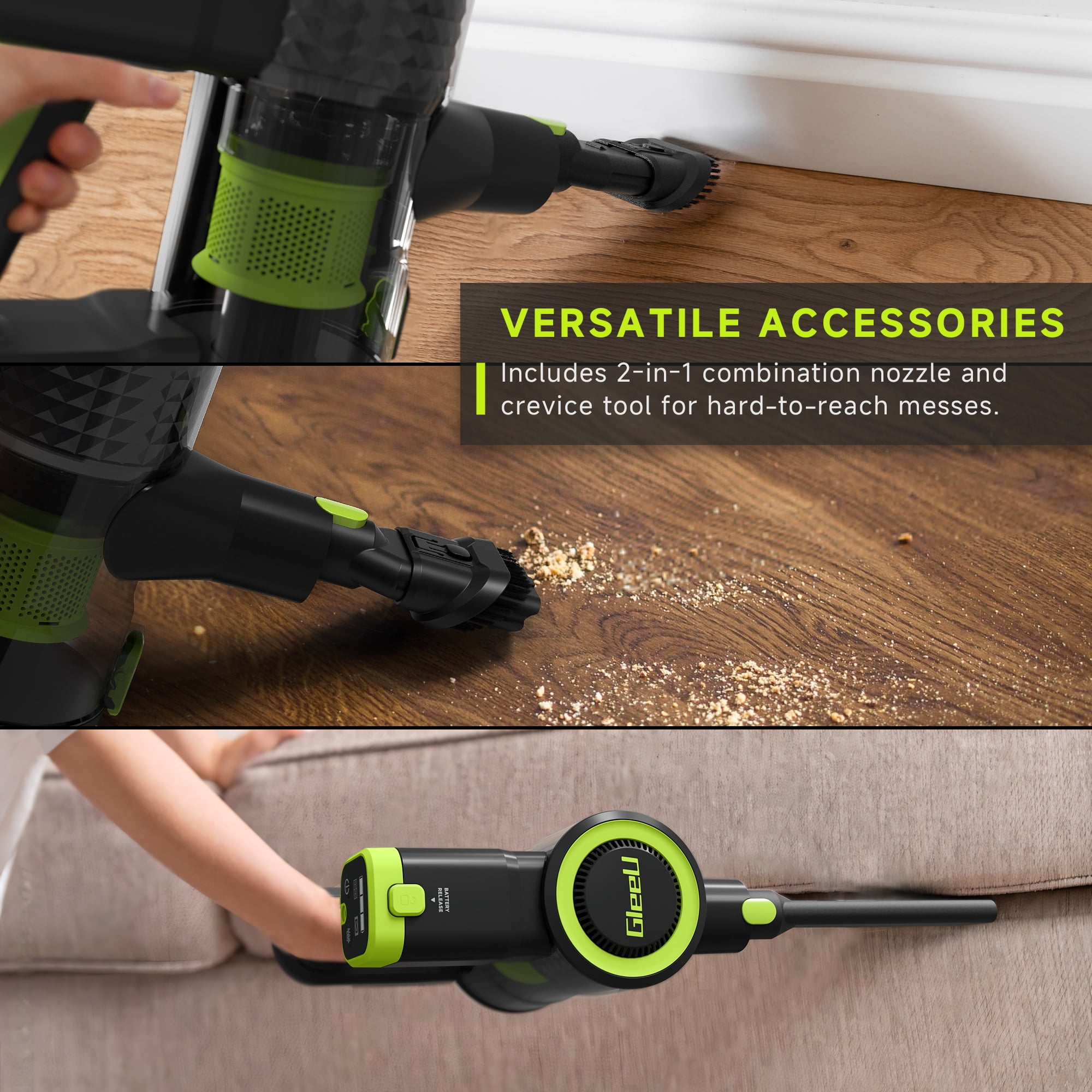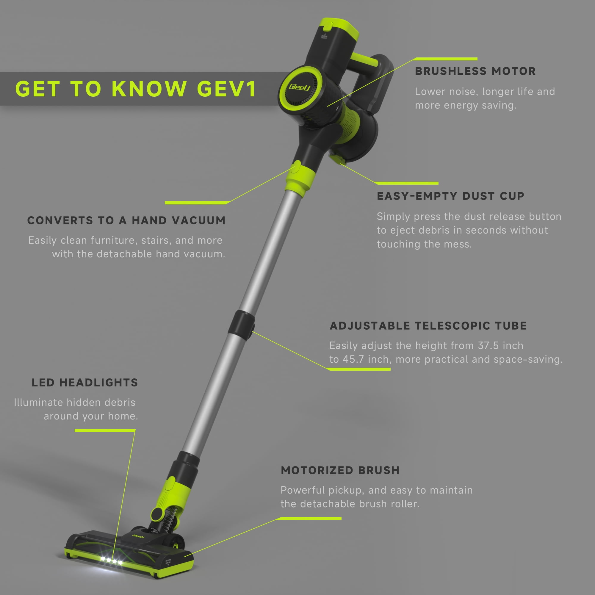 Meet the GleeU Cordless Stick Vacuum GEV1 and clean up messes from floor to ceiling. It has the power and lightweight design for versatile cleaning. With long-lasting brushless motor, this cordless vacuum deep-cleans floors and carpets, capturing dirt, debris, and pet hair. This powerful cleaner comes with a removable lithium-ion battery with two powerful cleaning modes to make storage and charging a breeze. With up to 35 minutes of runtime in Hard Floor Mode & 18 minutes in Carpet Mode you’ll be able to clean more effectively. This vacuum easily converts into a handheld vacuum and comes with a dusting brush and crevice tool designed to clean the small areas where dirt accumulates. Remove the floor nozzle to use the stick vac as an extension wand to tackle messes high and low throughout your home. It features LED headlights to illuminate pet hair and hidden debris around your home, and also clear display to monitor battery, and cleaning mode. HEPA Filtration system captures and traps over 99.9% of dust, allergens, and odor, keeping them out of the air you breathe.