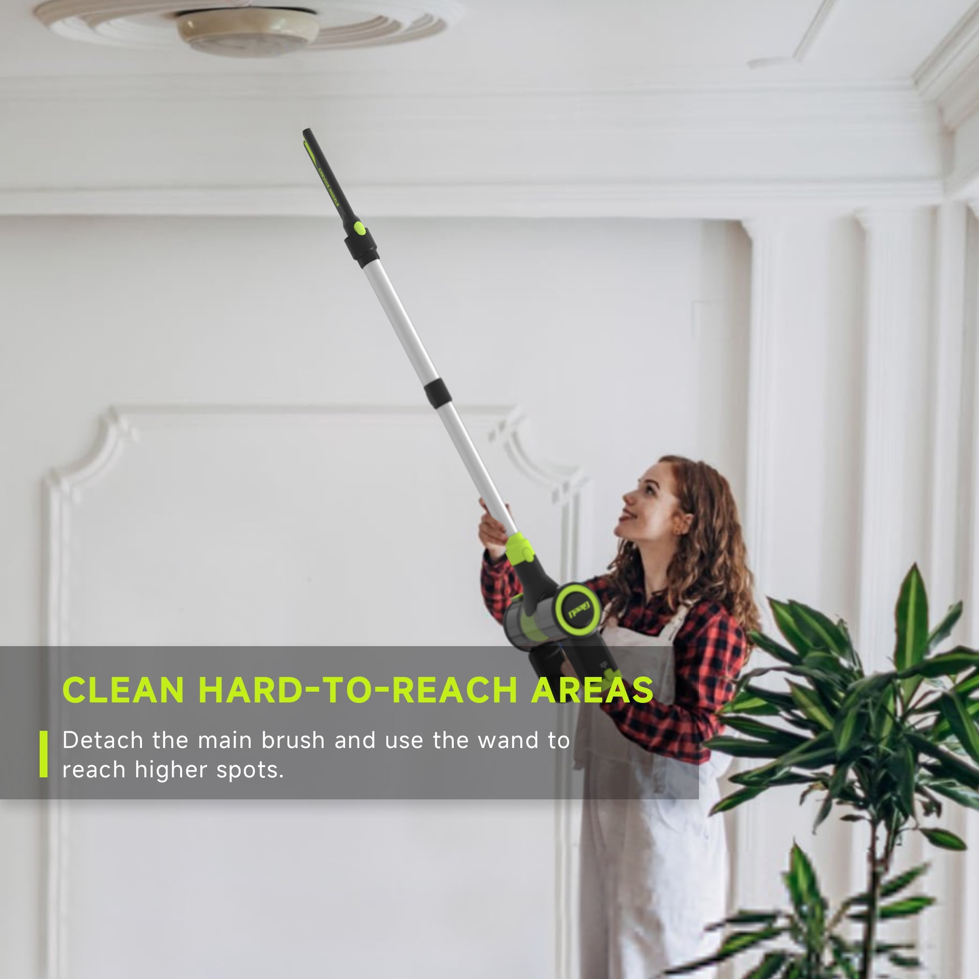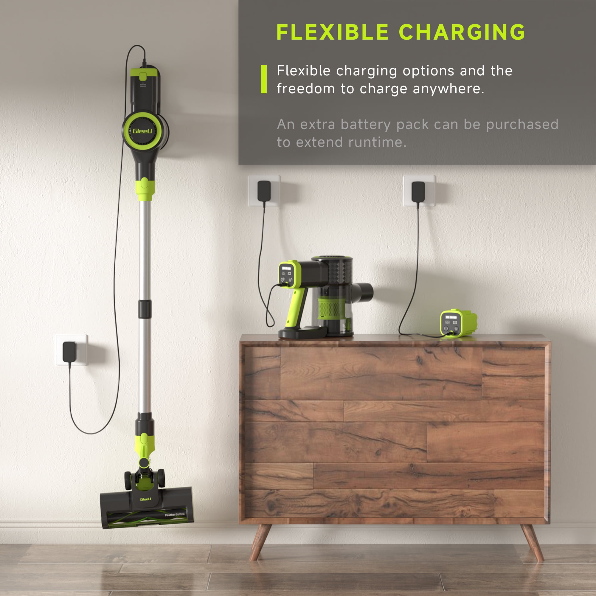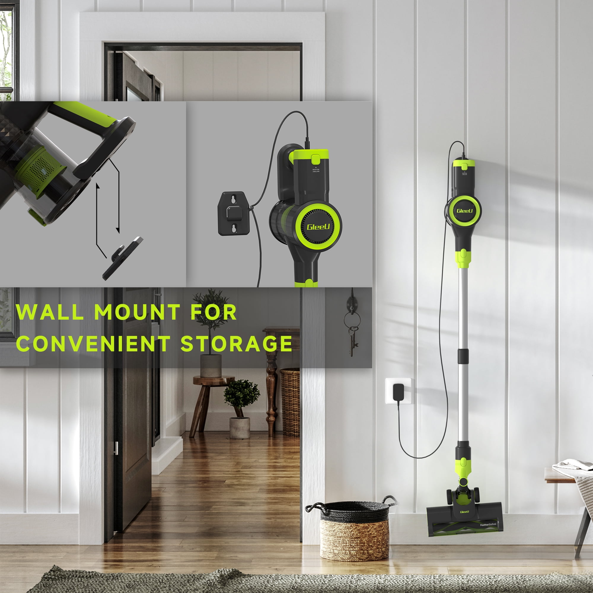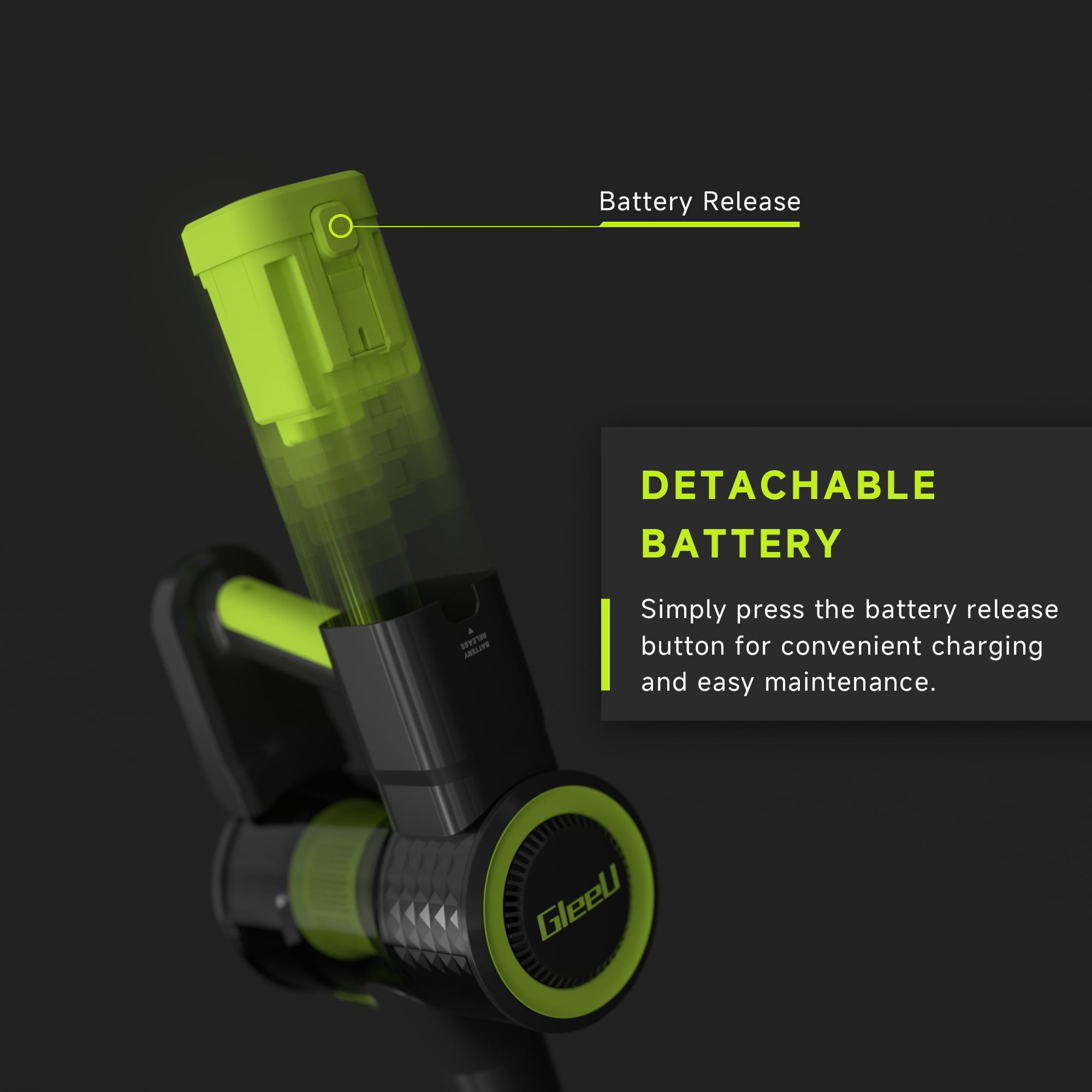 Meet the GleeU Cordless Stick Vacuum GEV1 and clean up messes from floor to ceiling. It has the power and lightweight design for versatile cleaning. With long-lasting brushless motor, this cordless vacuum deep-cleans floors and carpets, capturing dirt, debris, and pet hair. This powerful cleaner comes with a removable lithium-ion battery with two powerful cleaning modes to make storage and charging a breeze. With up to 35 minutes of runtime in Hard Floor Mode & 18 minutes in Carpet Mode you’ll be able to clean more effectively. This vacuum easily converts into a handheld vacuum and comes with a dusting brush and crevice tool designed to clean the small areas where dirt accumulates. Remove the floor nozzle to use the stick vac as an extension wand to tackle messes high and low throughout your home. It features LED headlights to illuminate pet hair and hidden debris around your home, and also clear display to monitor battery, and cleaning mode. HEPA Filtration system captures and traps over 99.9% of dust, allergens, and odor, keeping them out of the air you breathe.