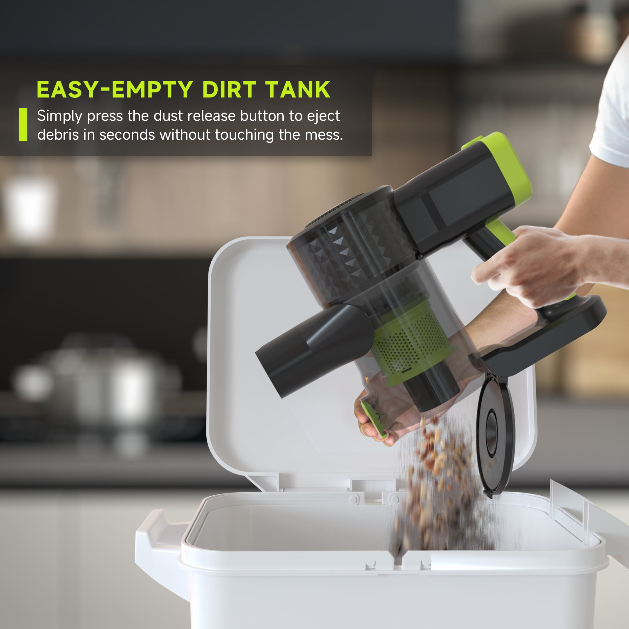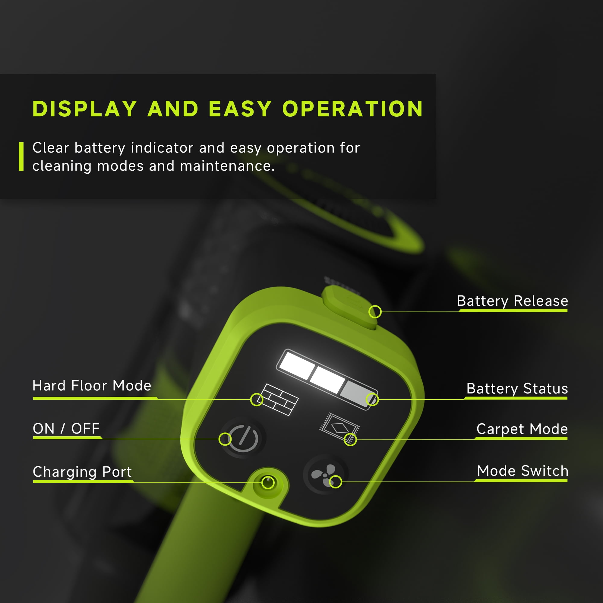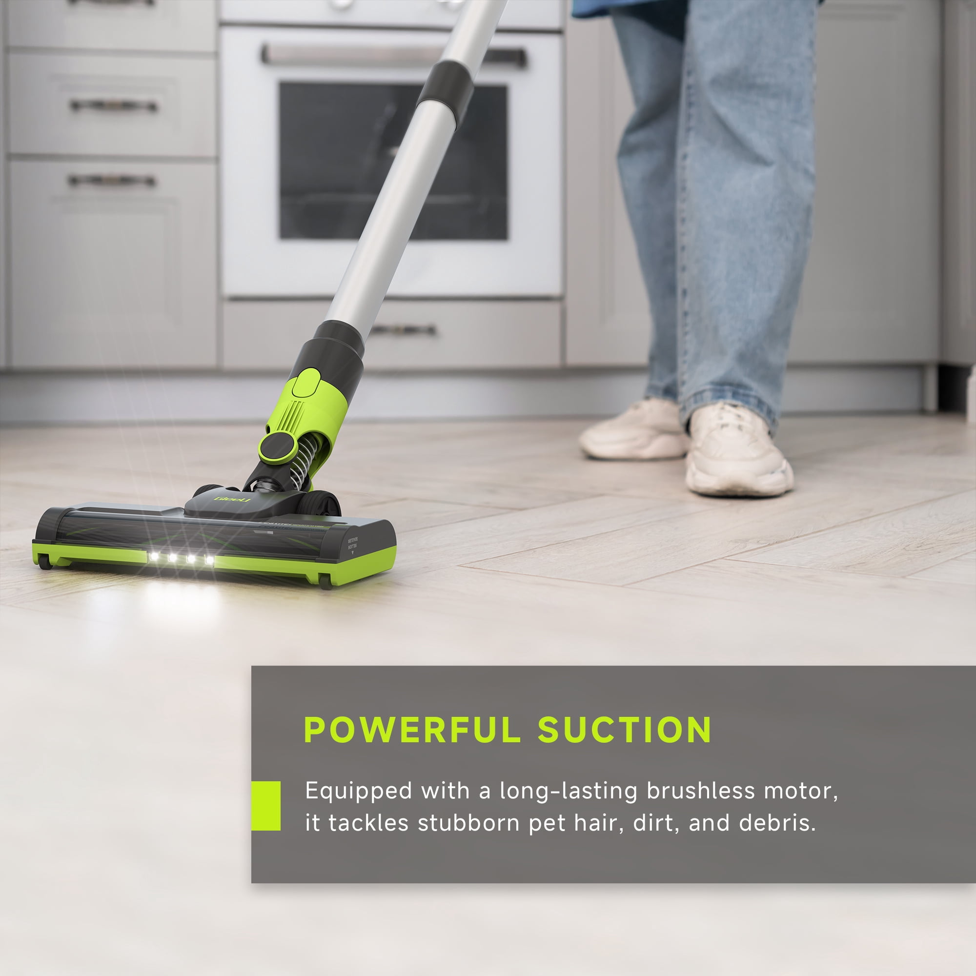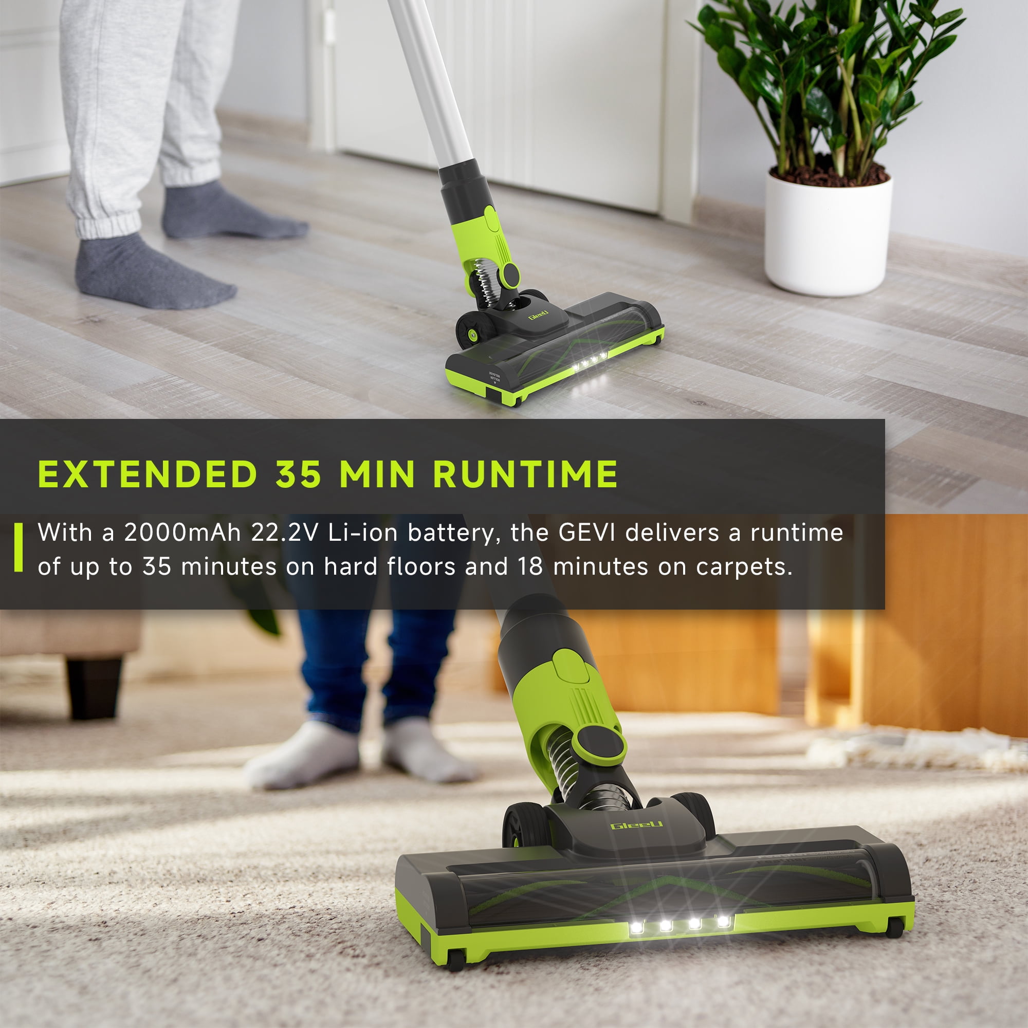 POWERFUL SUCTION: Equipped with a long-lasting brushless motor, it tackles stubborn pet hair, dirt, and debris. THOROUGH CLEANING ON ALL TYPES OF FLOORS: Deep cleaning on carpets and incredible pickup on bare floors. LED HEADLIGHTS: Illuminate pet hair and hidden debris around your home. EASY UNDER-FURNITURE REACH: Low-profile design to access tight spaces. CLEAN HARD-TO-REACH AREAS: Detach the main brush and use the wand to reach higher spots. CONVERTS TO A HAND VACUUM: For lightweight cleaning on furniture, stairs, car and more. VERSATILE ACCESSORIES: Includes 2-in-1 combination nozzle and crevice tool for hard-to-reach messes. EXTENDED 35 MIN RUNTIME: With a 2000mAh 22.2V Li-ion battery, the GEVI delivers a runtime of up to 35 minutes on hard floors and 18 minutes on carpets. DISPLAY AND EASY OPERATION: Clear battery indicator and easy operation for cleaning modes and maintenance. DETACHABLE BATTERY: Simply press the battery release button for convenient charging and easy maintenance. FLEXIBLE CHARGING: Flexible charging options and the freedom to charge anywhere.*An extra battery pack can be purchased to extend runtime. EASY-EMPTY DIRT TANK: Simply press the dust release button to eject debris in seconds without touching the mess. WALL MOUNT FOR CONVENIENT STORAGE: The wall-mounted bracket, combined with a user-friendly cable wrap hook, offers an organized storage solution.