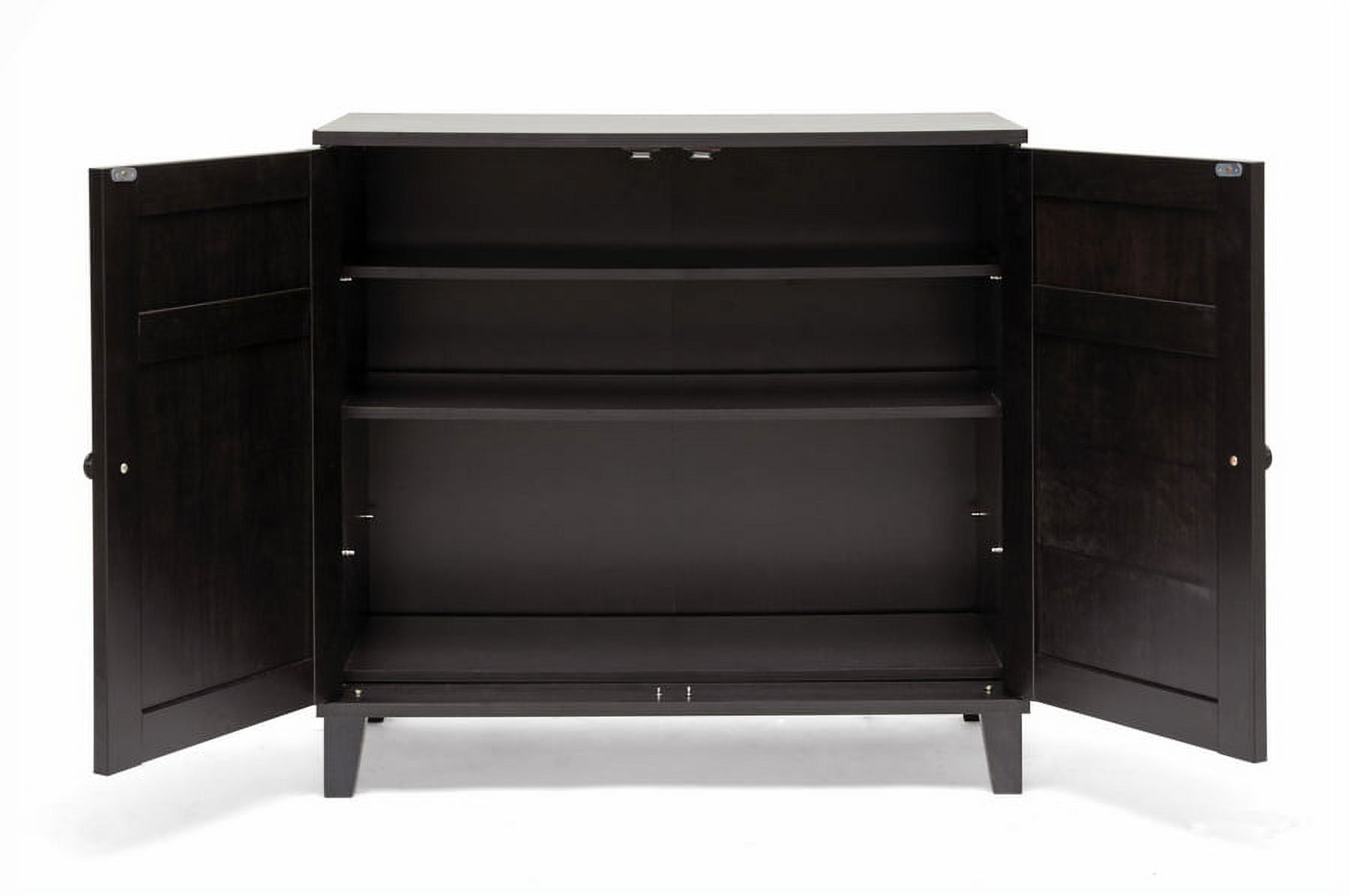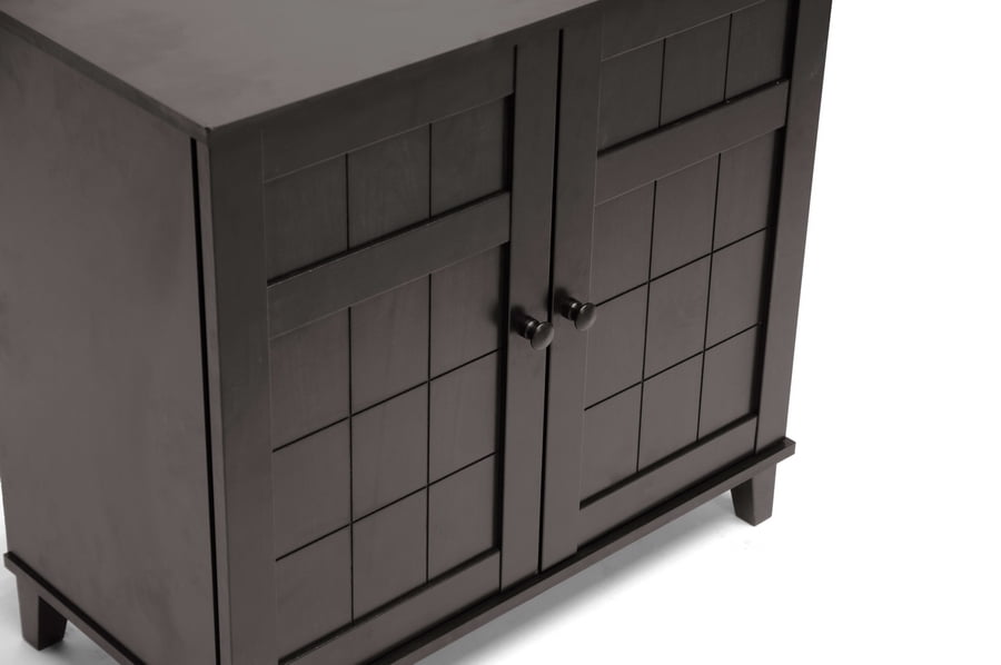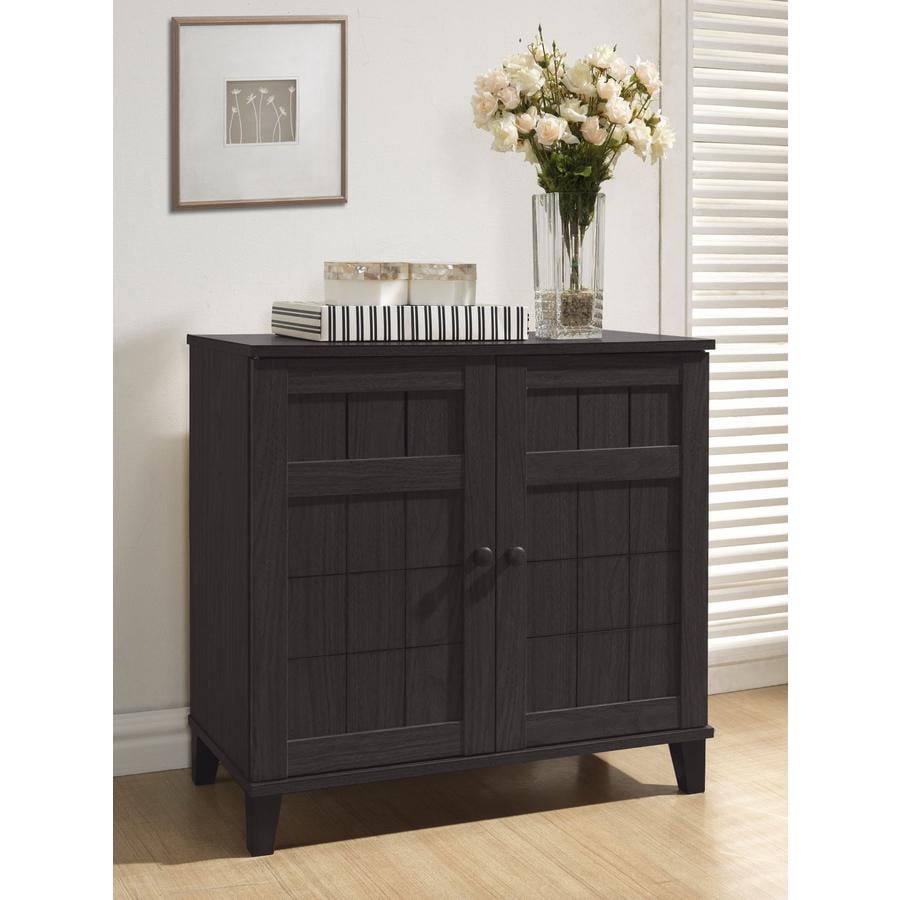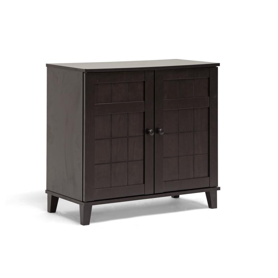Combining modern and classic elements, our Glidden Designer Shoe Cabinet unobtrusively tucks away shoes yet keeps them close at hand for a quick walk with the dog or trip to the office. This contemporary shoe storage option is made of MDF and engineered wood with dark brown faux wood grain paper veneer: it’s so stylish you’d never guess shoes are inside. Four fixed-height horizontal shelves behind the cabinet doors are ideal for adult and children’s shoes alike, though boots are not recommended. Malaysian-made, this designer shoe cabinet requires assembly and should be wiped clean with a dry cloth. For those with more storage needs, a taller version of the Glidden Shoe Cabinet is also available (sold separately). Overall Dimensions: 28 inches high x 29.1 inches wide x 15.1 inches deep