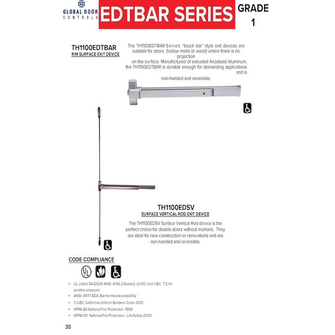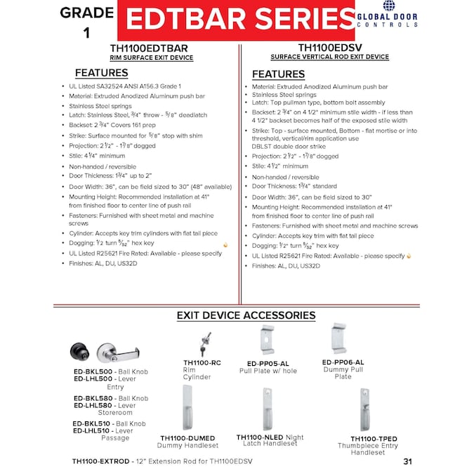 The Global Door Controls EDTBAR series “Touch Bar” style exit device is suitable for hollow metal or wood doors where there is no projection on the surface. Its’ appropriate for commercial and industrial applications where heavy duty usage is anticipated. Moreover, it fist with doors up to 36 in. wide. It comes with a roller latch, strike plate, and mounting hardware. However, the exterior lever trim is sold separately. These series meet the performance standards of Grade 1 and ADA compliant exit devices. Item is available in Aluminum, Duronodic and Stainless Steel finishes.