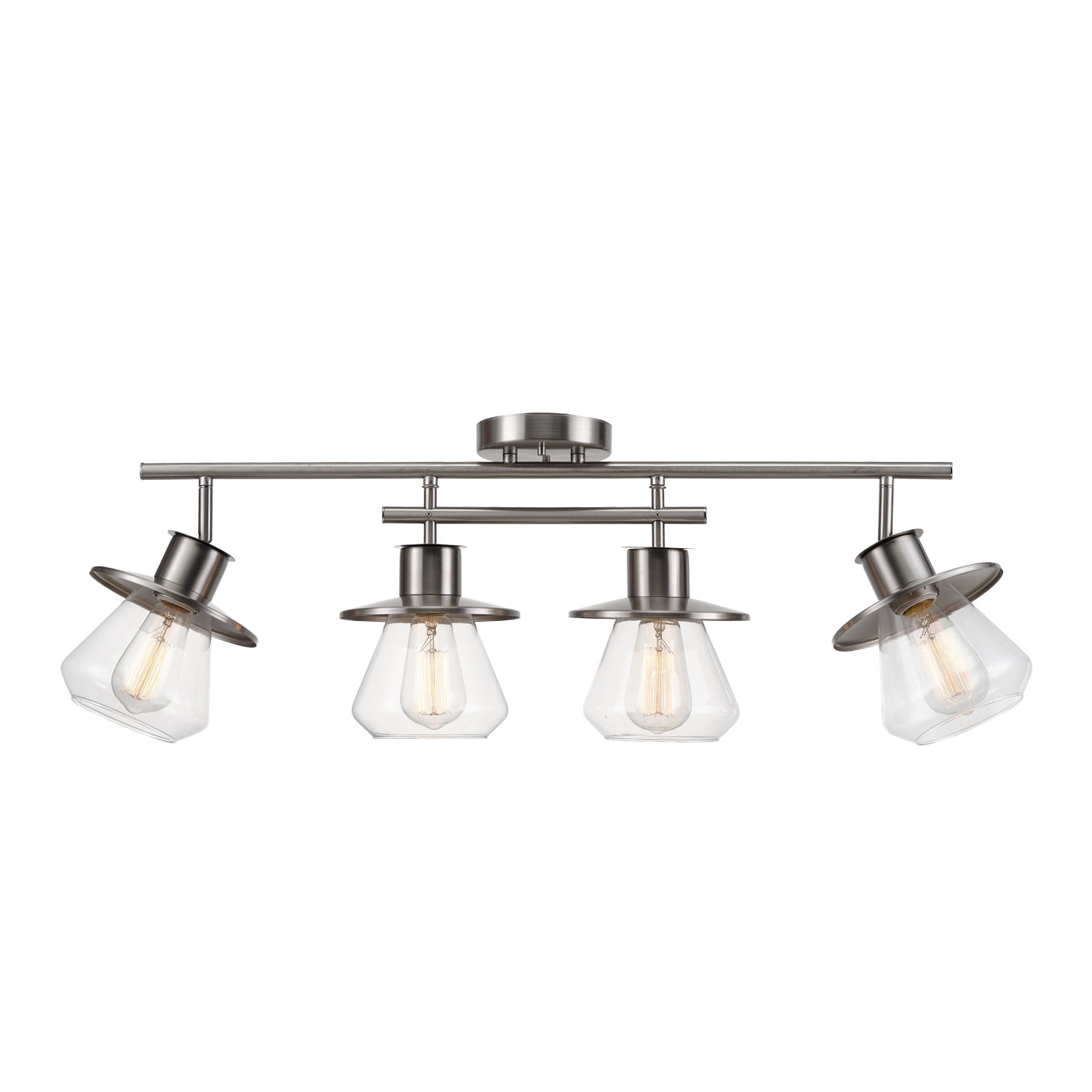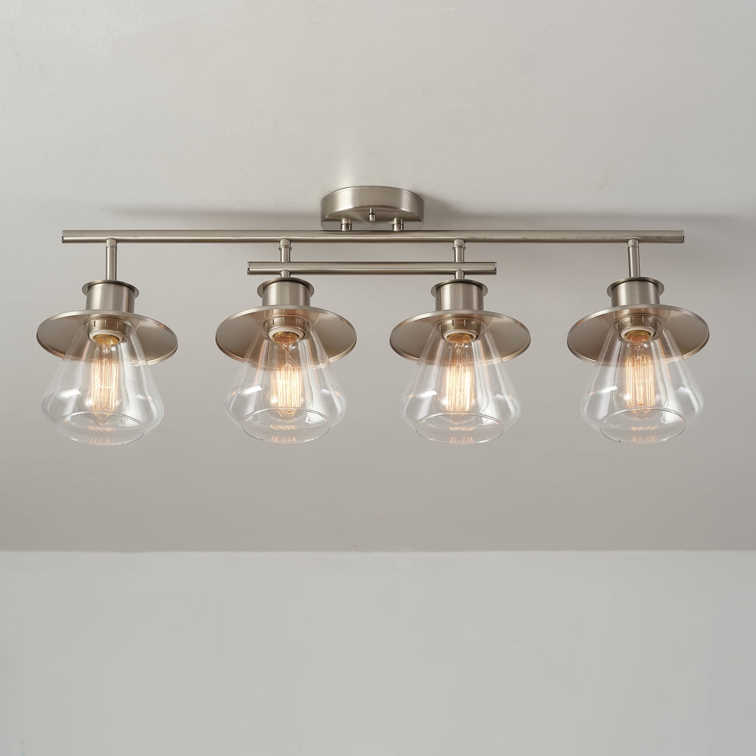 The Nate Collection by Globe Electric offers stylish lighting to enhance any room. The Nate 4-Light Track Light blends modern industrial and farmhouse design. Clear glass shades with wide metal brims add character, while the double bar design gives an industrial touch. The brushed nickel finish adds a hint of luxury, and the light creates warm, ambient lighting. Versatile and unique, it brings both industrial and farmhouse style to your space. Product Net Content UOM: 1 Each.
