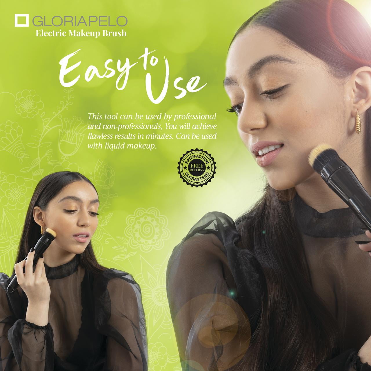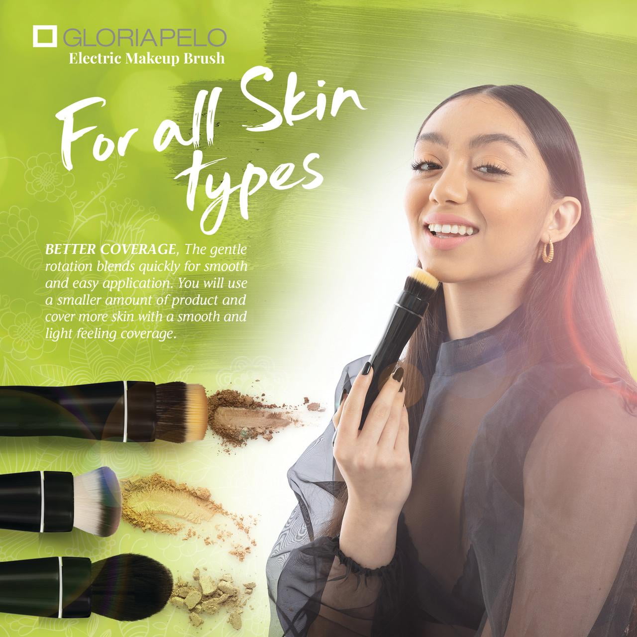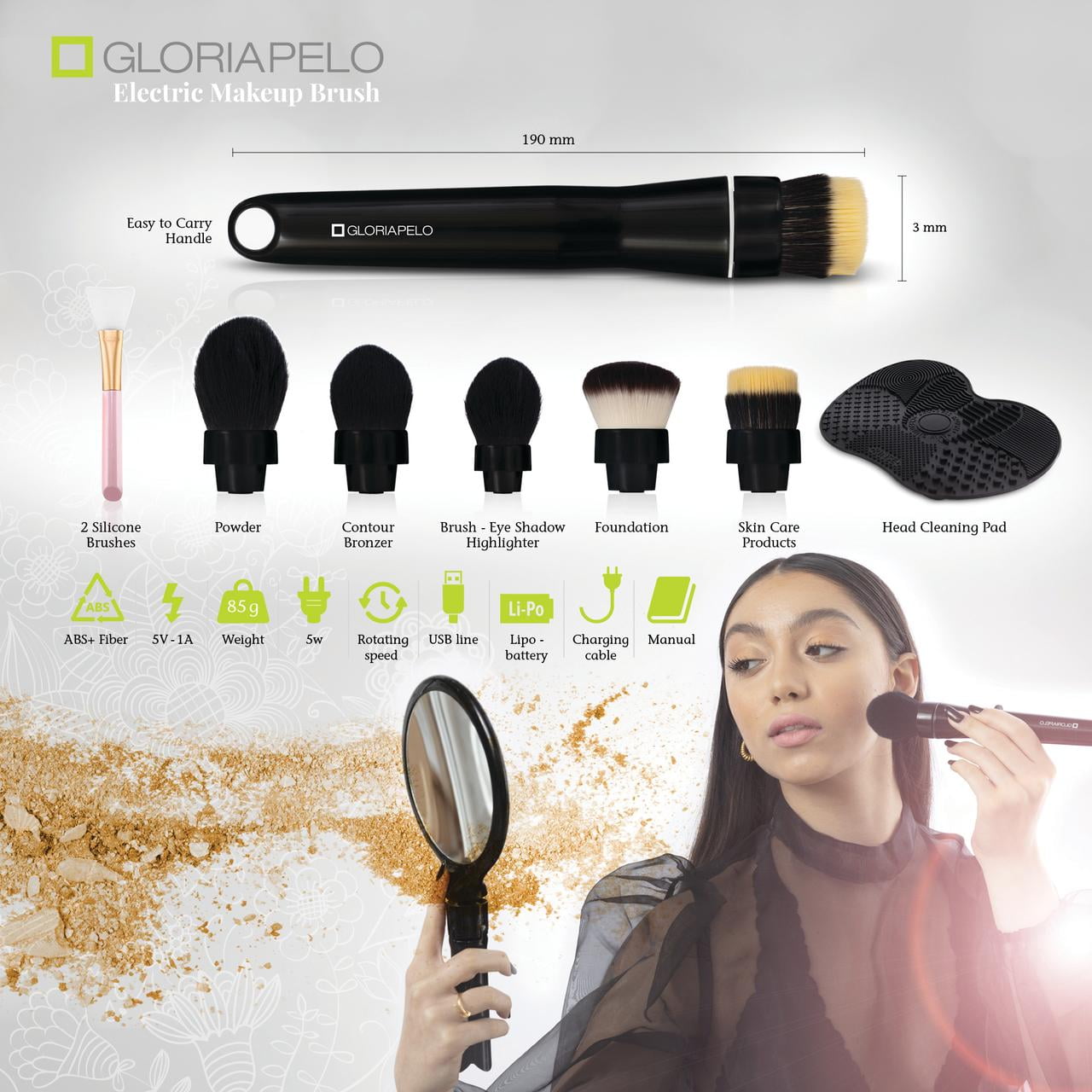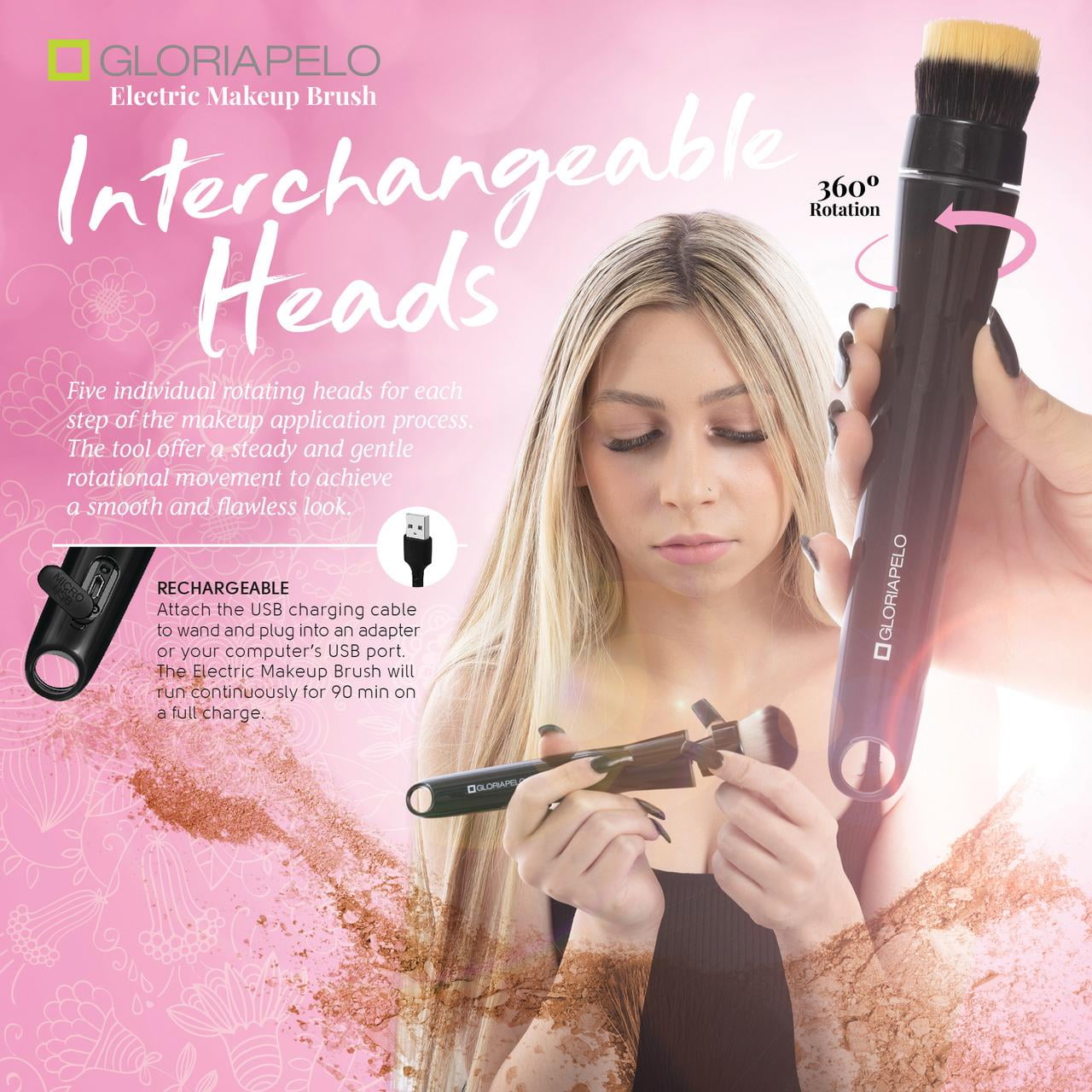 The GLORIAPELO rotating brush is definitely a must in your everyday makeup tool bag, giving you a smooth, even, and natural finish in seconds on any makeup look. Using less amount of makeup product (Powder, compact, or liquid) you do your look in less time and your skin is left with an airbrushed finish! A professional-grade daily makeup that you can do yourself with this rotating electric brush and its 5 heads! Interchangeable for various functions in the process of your makeup.