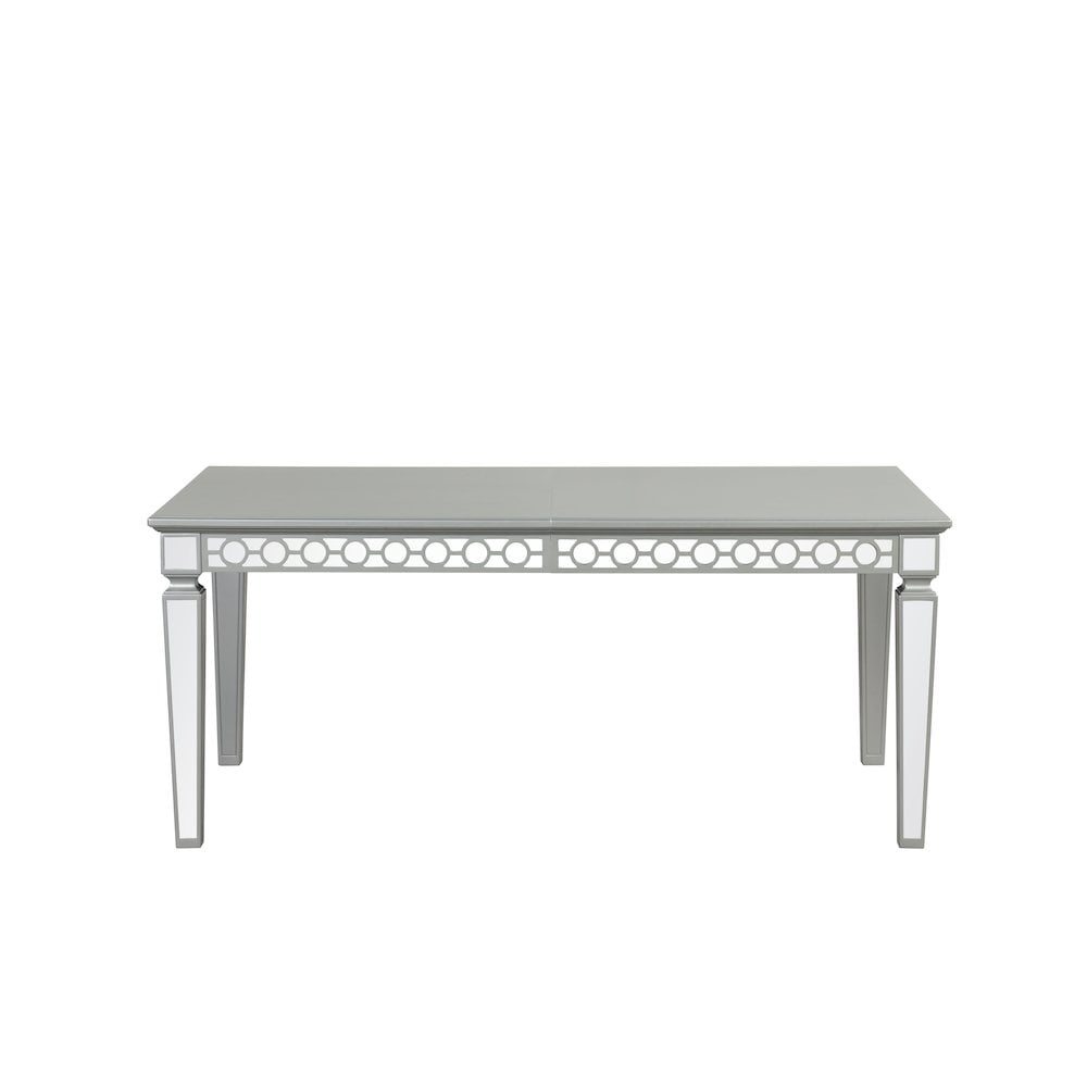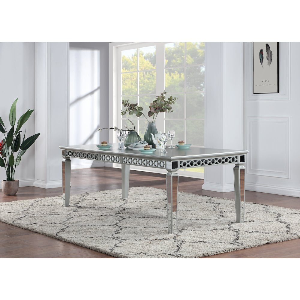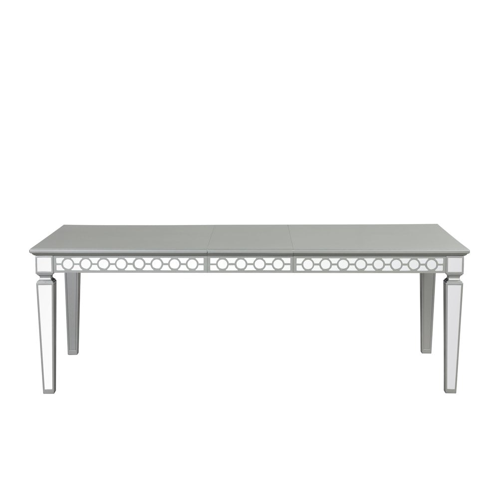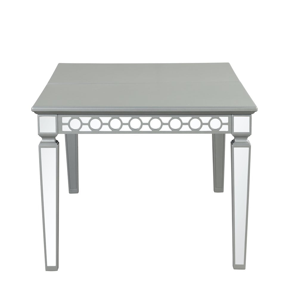 Glory Furniture Geneva Table in Color This captivating dining table combines functionality and modern appeal, serving as a focal point for all your meals and gatherings. Its impressive silver finish is complemented by stylish mirror accents on the apron and legs, creating a striking design that blends well with various decor themes. The table features a robust painted wood top, ensuring both durability and aesthetic allure, making it a desirable addition to your dining area. Measuring 30 inches in height, 90 inches in width, and 40 inches in depth, this table offers ample space for dining while maintaining a sleek profile. An 18-inch leaf provides the flexibility to accommodate extra guests, making it ideal for both small family dinners and larger celebrations. This dining table not only meets your functional needs but also elevates the aesthetic of your dining space with its sophisticated charm, allowing for memorable moments shared with family and friends. With overall dimensions of 30″H x 90″W x 40″D, this table suits various dining spaces perfectly. The stunning silver finish beautifully complements the mirror accents on the edges of the table. A painted wood top with an 18-inch leaf makes it versatile for both small and large gatherings. Strong and durable construction ensures this table stands up to daily dining activities and use. – Number of Pieces: 1 – Style: Glam – Collection: Geneva – Item Depth: 90 – Item Height: 30 – Item Width: 40 – Item Weight: 159 – Outdoor (Y/N): Yes