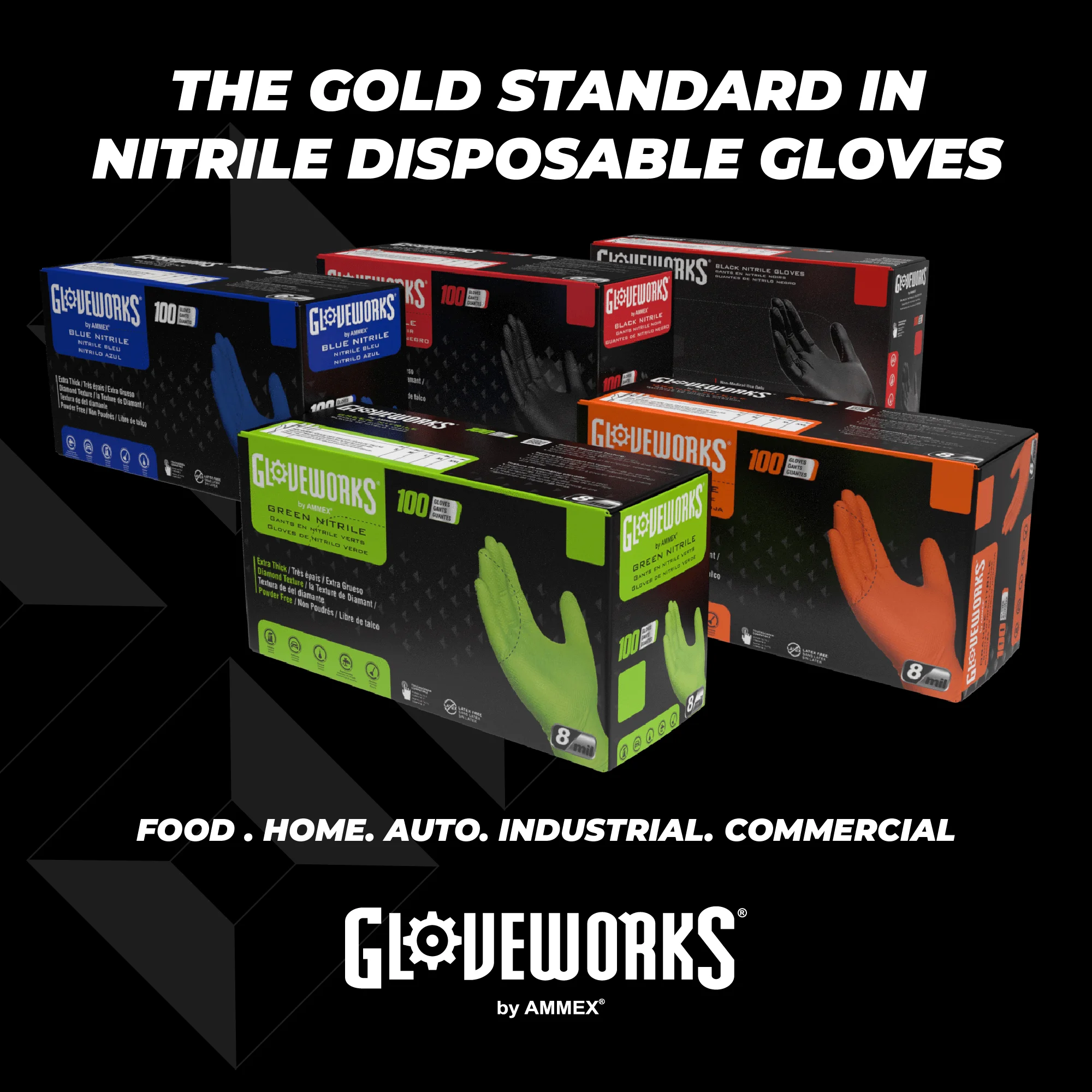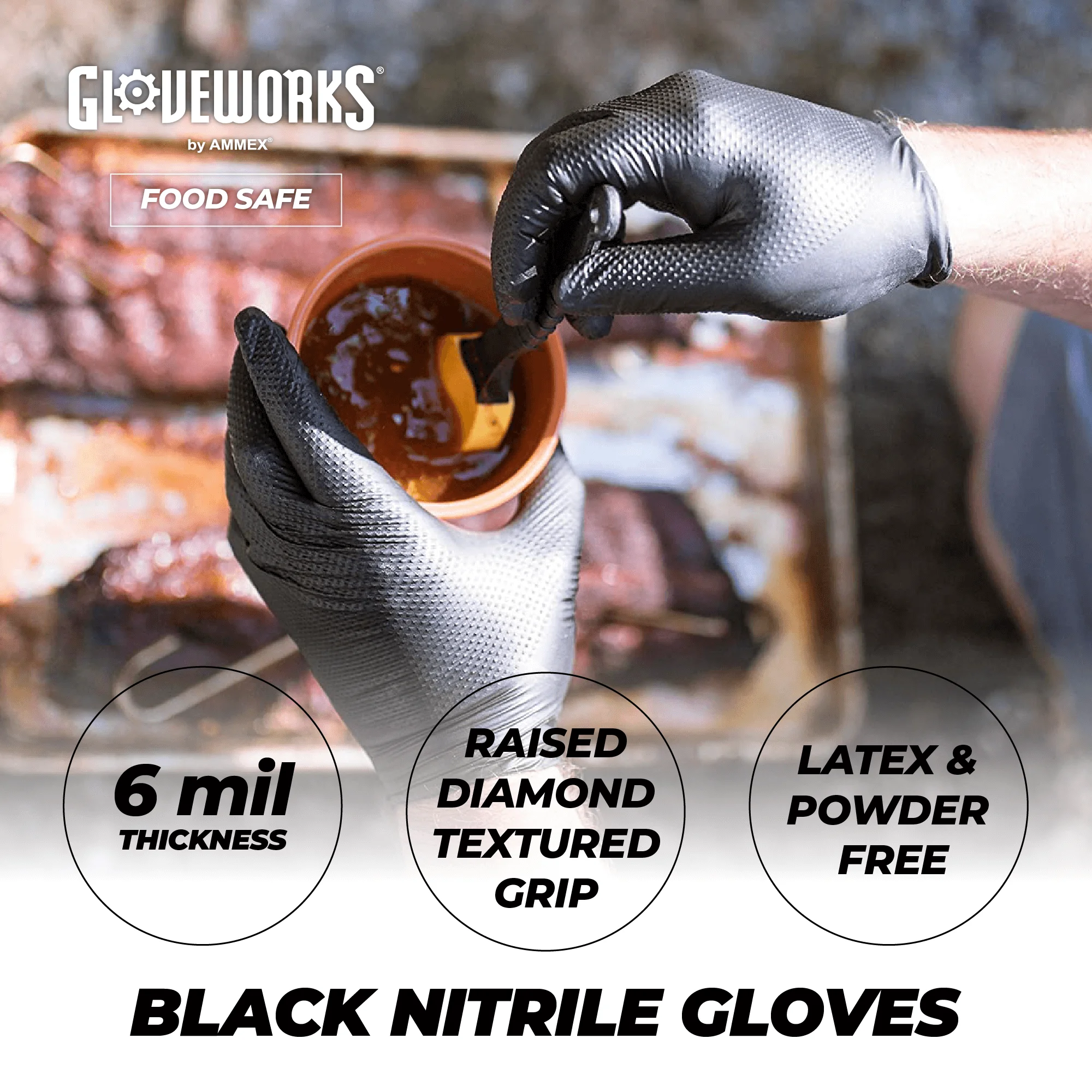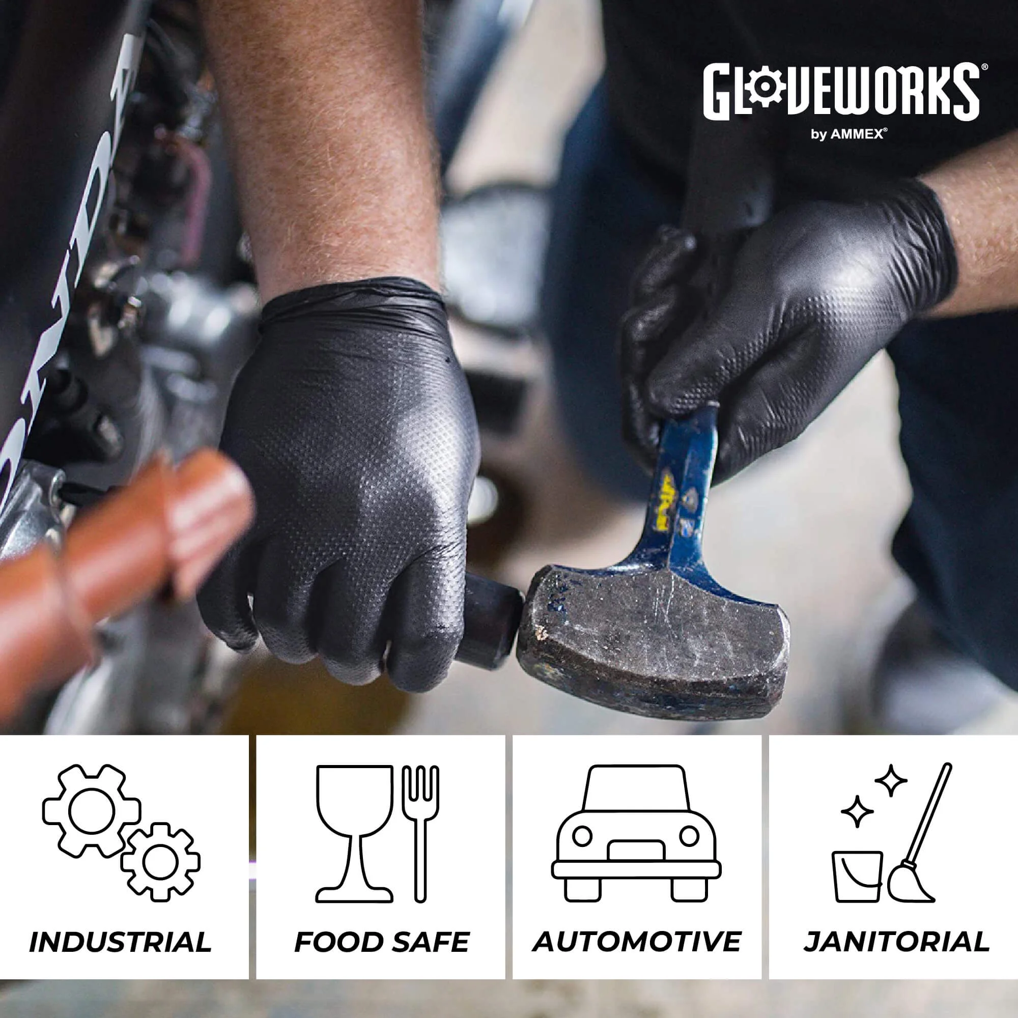 Black Gloves: Easily conceal dirt, grease & grime for a professional appearance GLOVEWORKS Brand: A trusted industry favorite for reliable hand protection Medium-Duty: 6 mils thick, great for auto repair & oil changes, cooking & more Latex-Free Gloves: Ideal for those sensitive to natural rubber latex Diamond Texture: Provides 60% more surface area for a better grip even when wet Comfort: Feel rivals that of latex gloves with touchscreen compatibility Commonly Used for: Household cleaning, car washing, mechanics, gardening, & more Reliably Protects Against: Most household cleaners and petroleum-based products Industrial-Grade & Food-Safe: Suitable for extended duration use Extended Glove Size Range: Available in Medium, Large, X-Large, and XX-Large