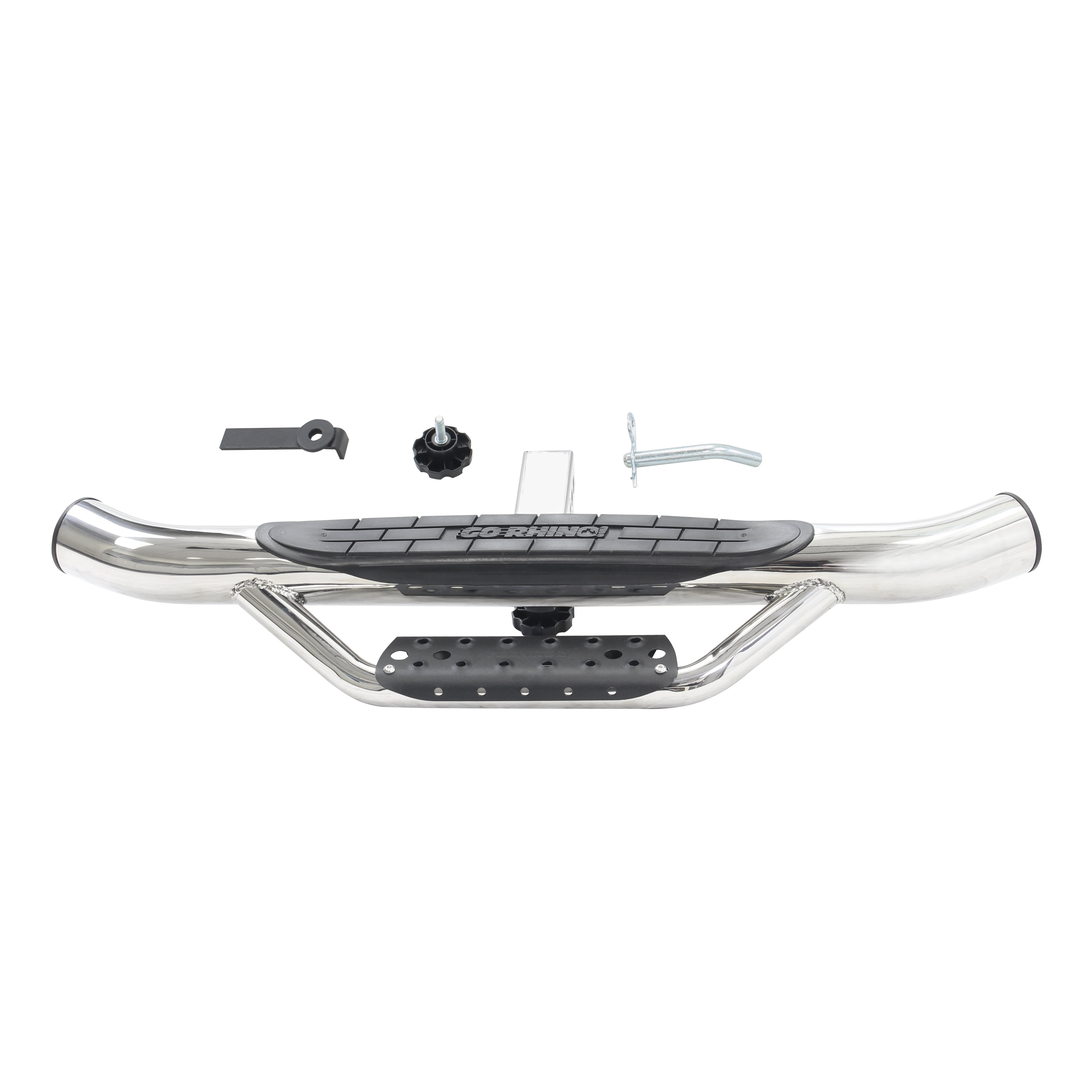 Go Rhino D360PS Dominator Hitch Step, Stainless Steel, Hitch Step, Class 3 _x000D__x000D_ _x000D_ Easily access your truck bed or SUV roof rack with this 2-step tow hitch step bar _x000D_ Fits 2-inch receivers and installs in minutes _x000D_ Features 2 steps, providing extra height for tall trailers or hard-to-reach storage areas _x000D_ Constructed from durable 1-piece stainless steel with a polished finish that withstands the elements _x000D_ Includes a storage bag and an anti-rattle device for added convenience _x000D_ Measures 36 inches long overall, offering ample space to step and maneuver _x000D_ Rubberized tread ensures secure footing in slick conditions _x000D_ Original Dominator hoop step pad provides additional room in the hoop _x000D_ Material: Stainless steel _x000D_ Finish: Polished _x000D_ Color: Silver _x000D_ Dimensions (L): 36 inches _x000D_