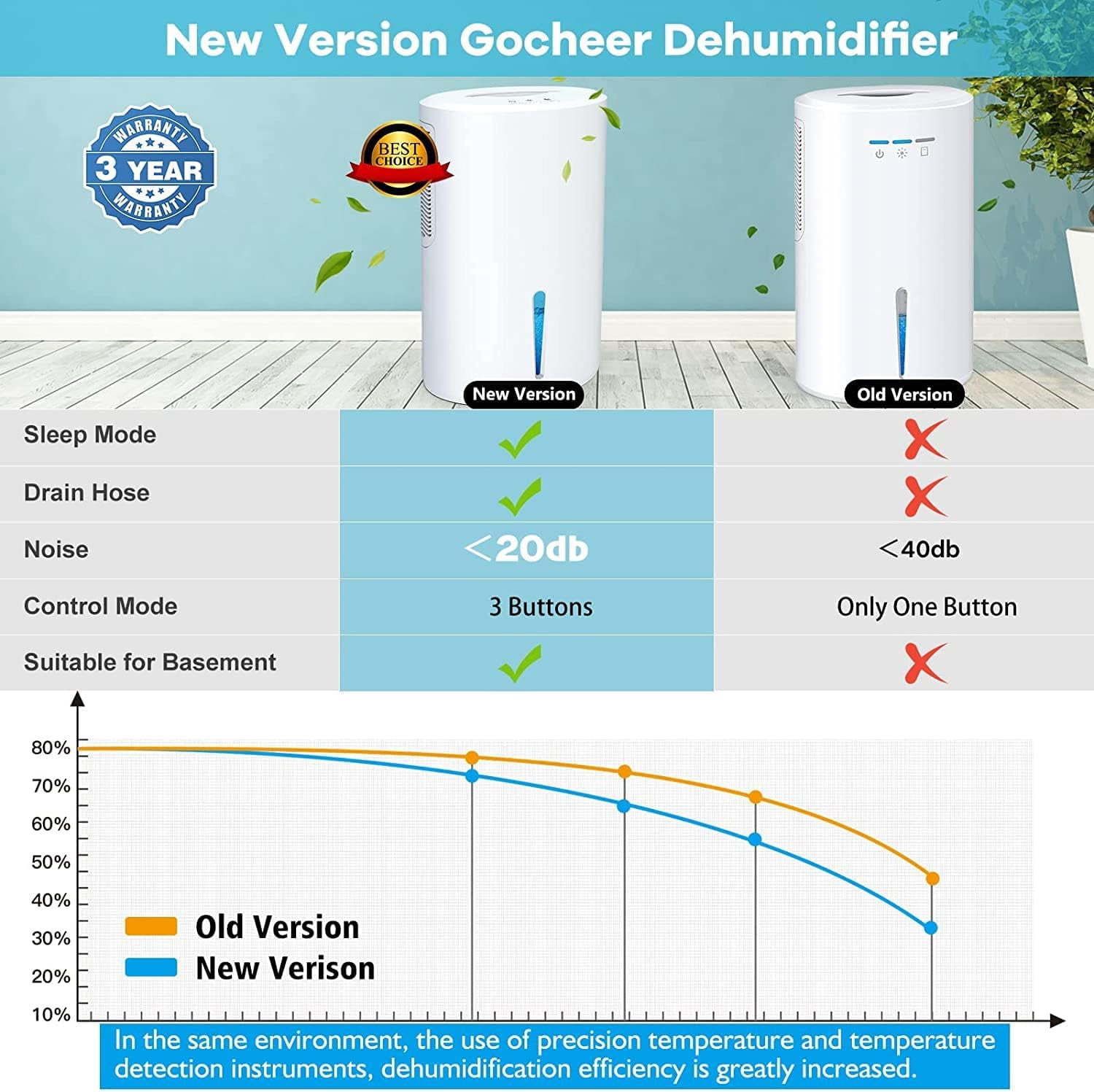 Gocheer air dehumidifier with drain hose is specifically designed to improve environmental quality, bidding farewell to dampness and unpleasant odors, ensuring your home remains comfortable and healthy at all times. Gocheer dehumidifiers are suitable for various rooms (up to 800 square feet), making them ideal for high-humidity areas such as bathrooms, small basements, closets, kitchens, and living rooms. Equipped with a 2000ml water tank, the dehumidifier can swiftly and effectively remove up to 1000ml of moisture from the air daily. Its ultra-quiet sleep mode (below 30 decibels) ensures you’re not disturbed while sleeping, providing a tranquil sleeping environment. This efficient and energy-saving dehumidifier operates 24 hours a day, consuming only 1.15kW of electricity. Compared to traditional large dehumidifiers, the Gocheer dehumidifier is not only affordable but also features a compact and portable design, allowing you to enjoy fresh, dry air anytime and anywhere, whether at home, in the office, or while traveling, bringing convenience and comfort to your life.