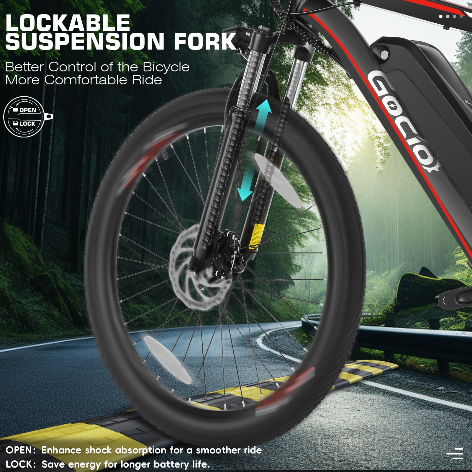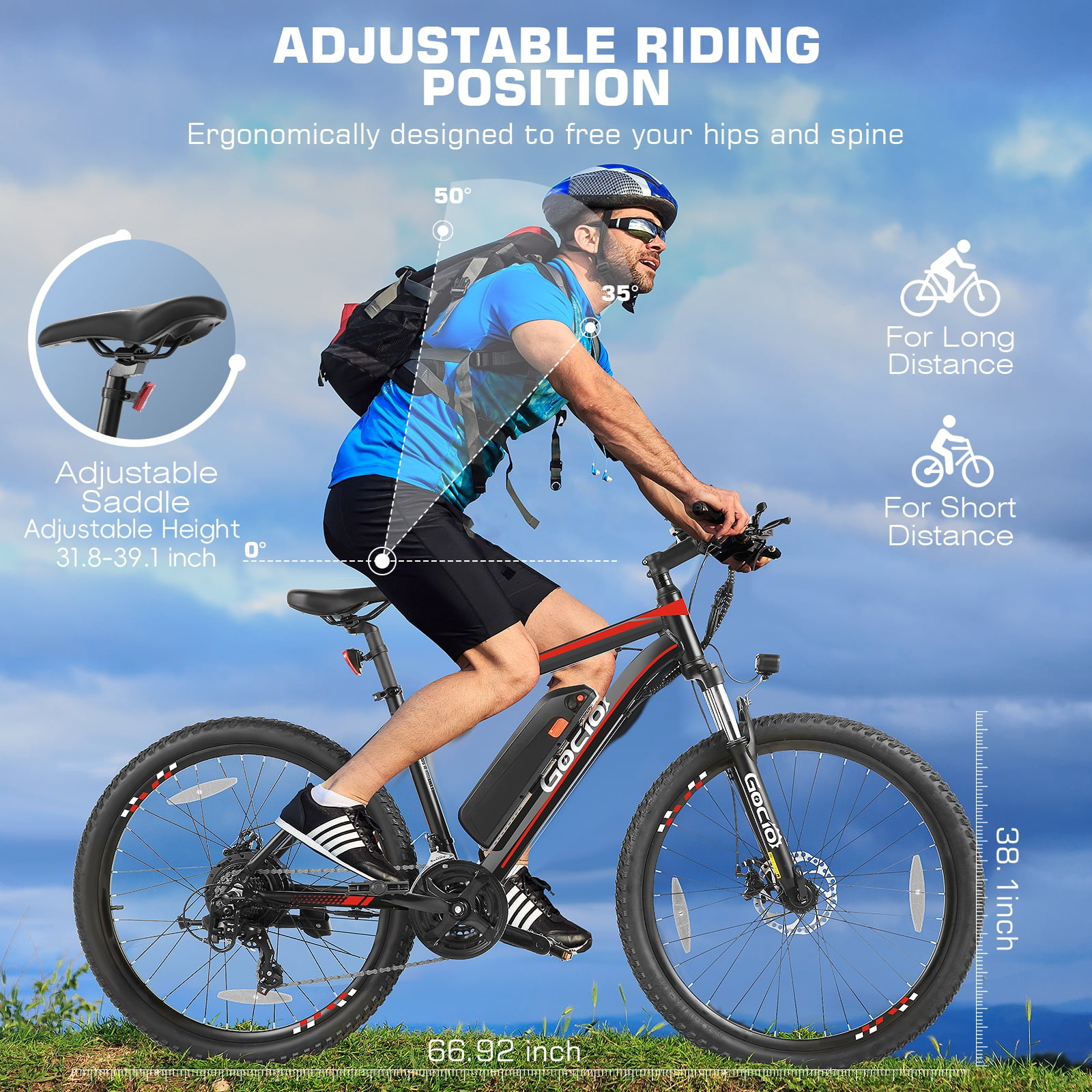 Gocio 500W Electric Bike / 48V 10.4Ah Electric Mountain Bicycle /Adjustable Ebike for Adults Men Women / 19.8MPH Electric Mountain Bike / 26″ * 2.1″ wide tires Ebike Main Feature: ✨【Powerful Riding Performance】: This adult e-bike features a 500W high-speed brushless motor, achieving speeds up to 19.8MPH. The 48V 10.4Ah 499Wh removable high-capacity battery (UL2849 certified) offers up to 30-45 miles in pure mode and 45-60 miles in PAS mode. With new fast charging technology, it fully charges in just 3-4 hours——2X faster!The battery features IP65 waterproofing and BMS protection, significantly extending its lifespan. ✨【Suitable for various terrains.】: The adult electric mountain bike features 26 * 2.1 inch anti-slip wide tires with strong grip and excellent shock absorption, ensuring a smoother riding experience.Additionally, the quick-release front wheel system offers convenience and flexibility, making the bike easier to handle, transport, and store. ✨【Safe & Comfortable Riding】: This adult electric bicycle is equipped with a lockable suspension front fork. Activating the fork enhances shock absorption for a smoother ride, while locking it saves energy, extend range, and ride faster and farther. The ergonomic saddle adapts to riders of different heights. Seat height : 31.8″-39.1″. Recommended height: 5.2 – 6.2 FT. ✨【Versatile Riding Experience】: This mountain electric bike offers 5 riding modes: electric throttle mode, pedal assist mode, pure pedal mode, walk assist mode, and cruise control mode, with 5 PAS levels (1/2/3/4/5). You can freely switch between these 5 riding modes and 5 PAS levels. Combined with the Shimano 21-speed gear system, this adult electric bike provides a versatile riding experience, suitable for off-road adventures, and outdoor cycling. ✨【Multifunctional Practical Design】: The upgraded LCD display provides various data such as mileage, battery level, and speed. The bright front light, rear reflector, and electric horn ensure your safety during night rides.The responsive dual disc brake system ensures your riding safety, allowing for quick braking. ✨【Easy Assembly and Support】: This adult electric bike arrives 85% pre-assembled, with the remaining tasks being simple DIY. We provide clear instructions and a toolset, along with dedicated customer service. Enjoy lifetime technical support for peace of mind.