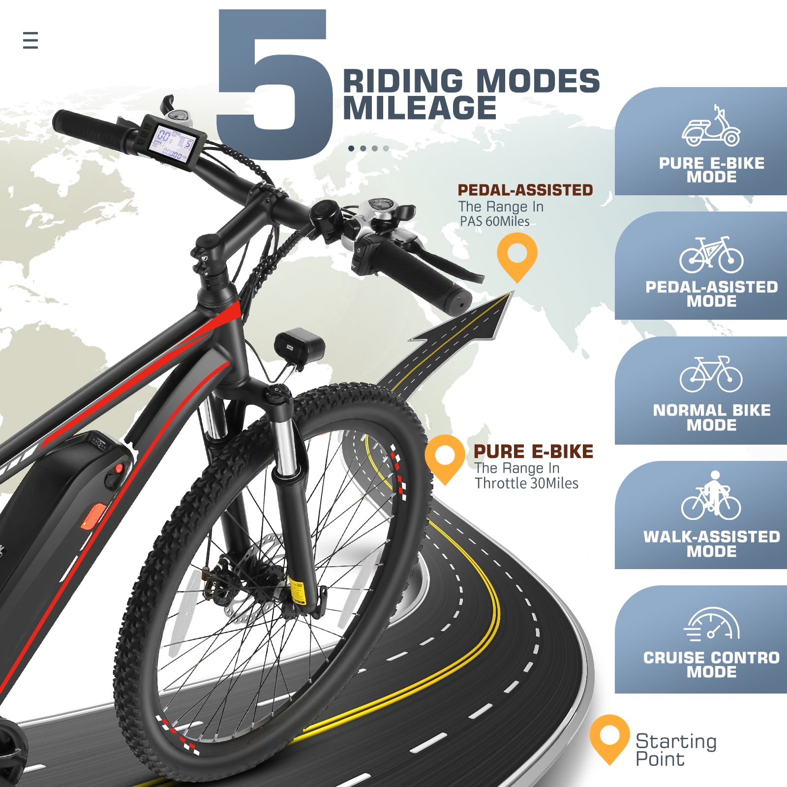 Ebike Highlights: Powerful Hub Brushless Motor Removable Lithium-Ion Battery(UL2849 certified) Maximum Speed(Throttle) & Wide Tires & Lockable Suspension Fork 5 Working Modes & Shimano 21 Speed Gear Adjustable Seat & Quick-release Front Wheel Ebike Specifications: Color:Black-Bule/Red/Orange Ebike Specifications – Style: Electric Mountain Bike Suitable for Adults Men Women Frame Material: Aluminum Alloy Range: 30-60 miles Bike Mode: Throttle (e-bike) / Pedal-assist / Normal bike / Walk assist / Cruise mode PAS Level: 1/2/3/4/5 Bicycle weight: 48 lbs Load Capacity: 265 lbs Handlebar Height: 38.6″ Seat height adjustable: 31.8″-39.1″ Unfold Size: 66.92″ x 38.6″ x 25.2″ Suitable Height: 5.2 – 6.2 FT Package Content: Package Size: 52.7″ x 9.65″ x 27.56″ Package Weight: 59 lbs Quantity: 1Pc 1 x Electric Bike 1 x Lithium-Ion Battery 1 x Battery Charger 1 x Front wheel 1 x Saddle 1 x Headlight 1 x front reflector 1 x Rear Reflector 1 x Bell 2 x Keys 2 x Pedals 1 x Toolkit