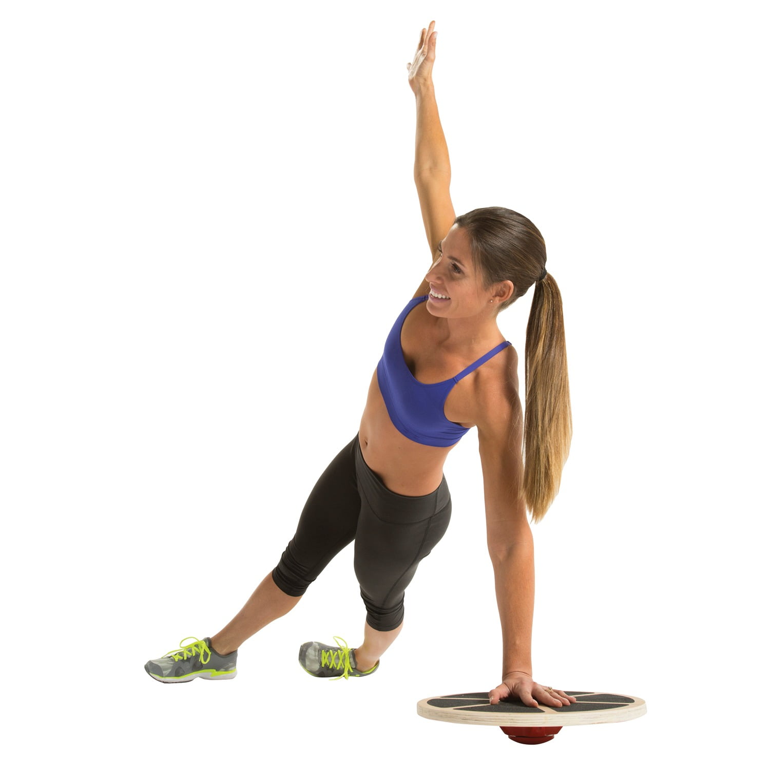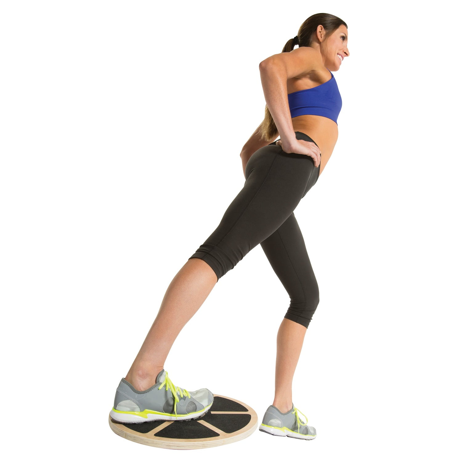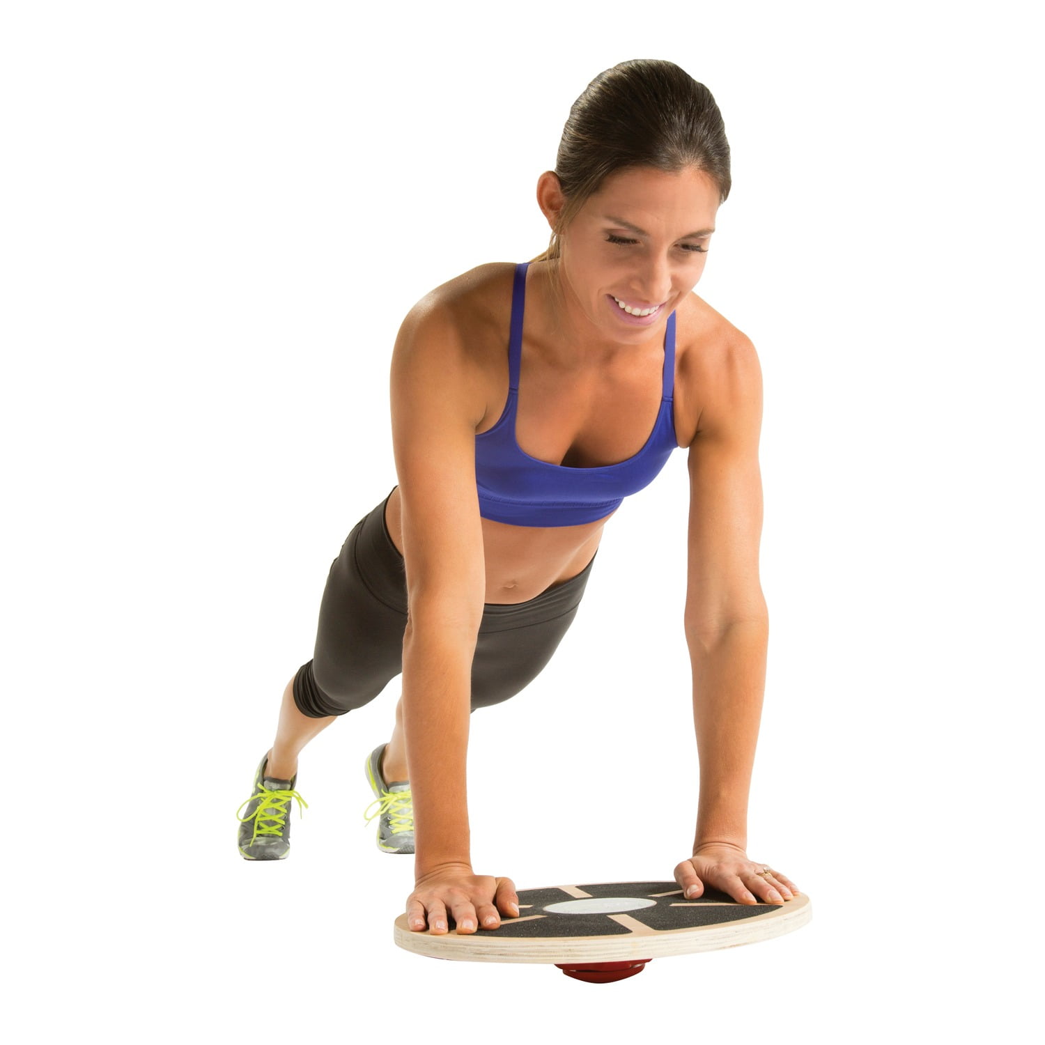 Varnished wood balance board Textured gripping surface Adjustable height range of 3 in. to 4 in. 15.5 in. diameter Includes Brook Benten training manual