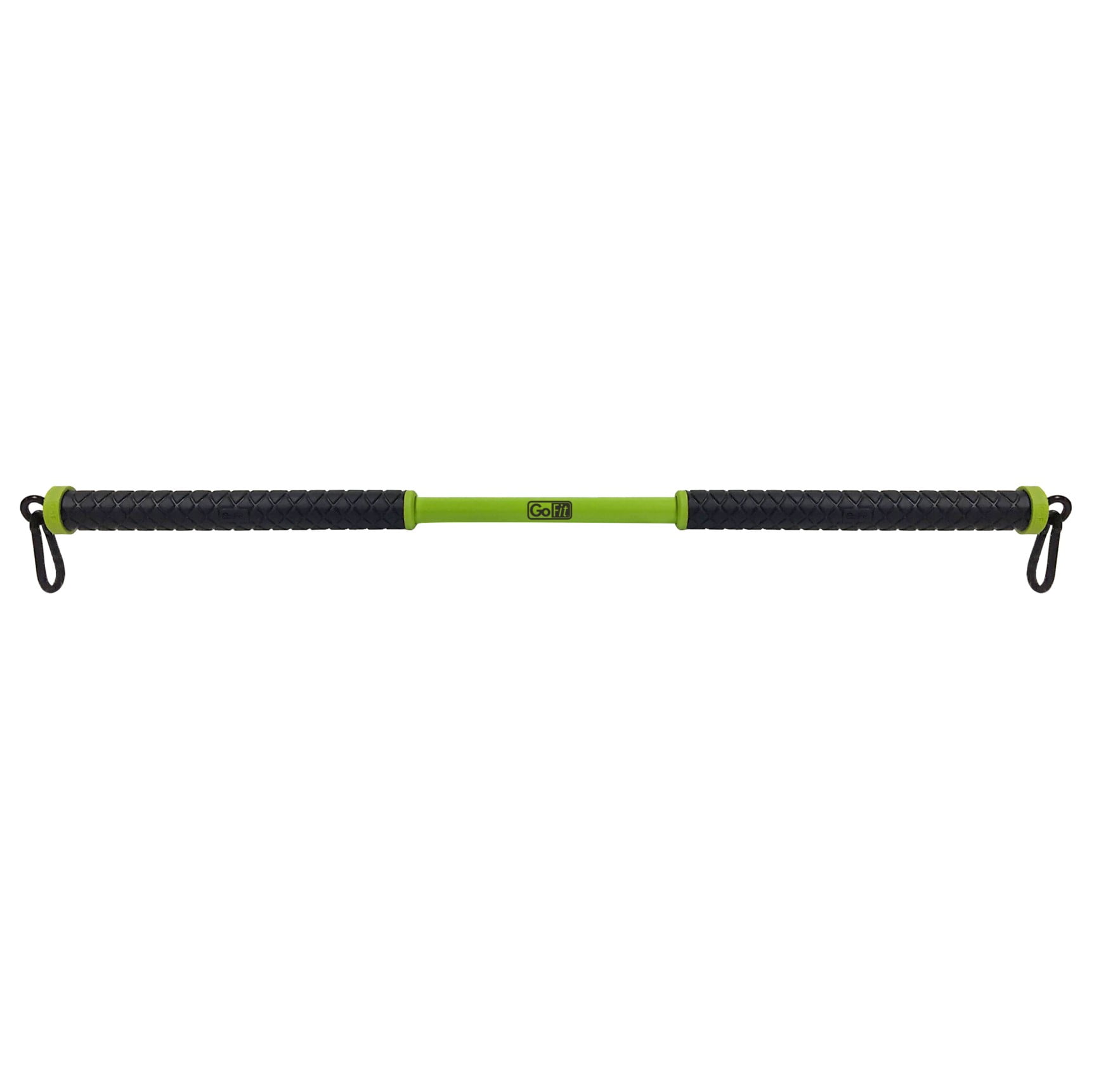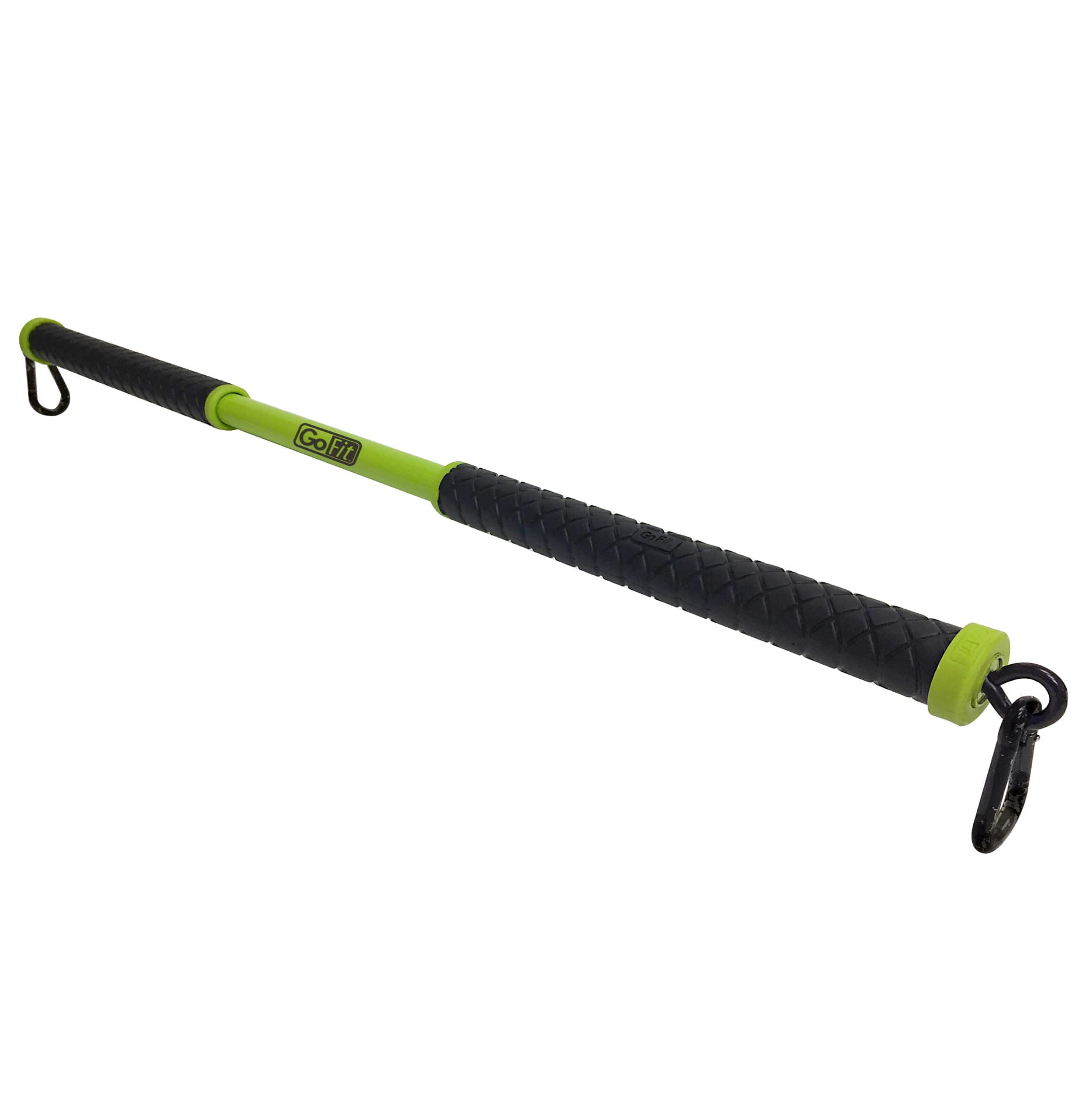 Durable steel bar with comfort grips and heavy duty carabiners. Heavy duty connector ends with ball bearing swivel action. Expandable system, compatible with GoFit resistance products and accessories. Hang-tag package solution. Includes Resist-a-Bar & Training Manual