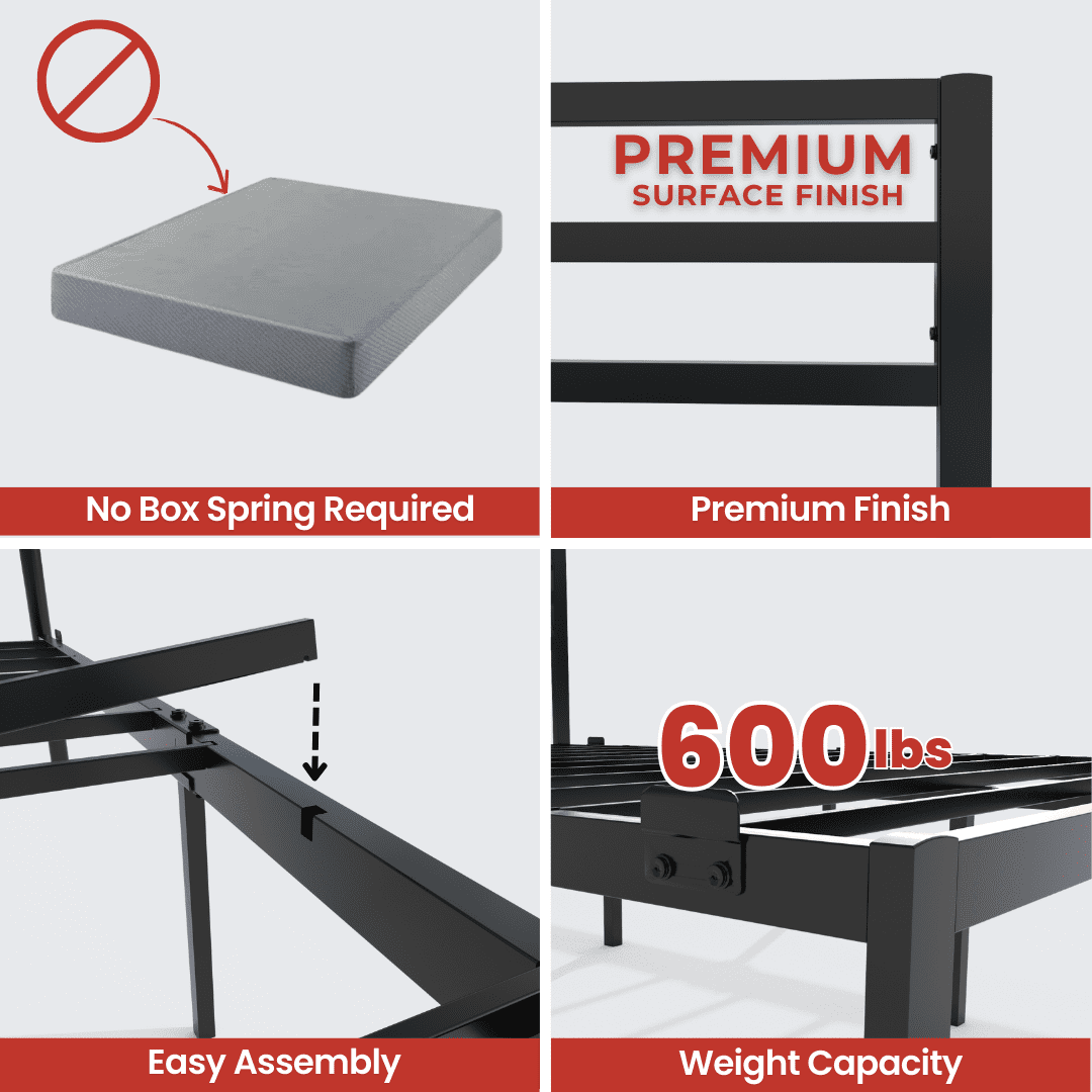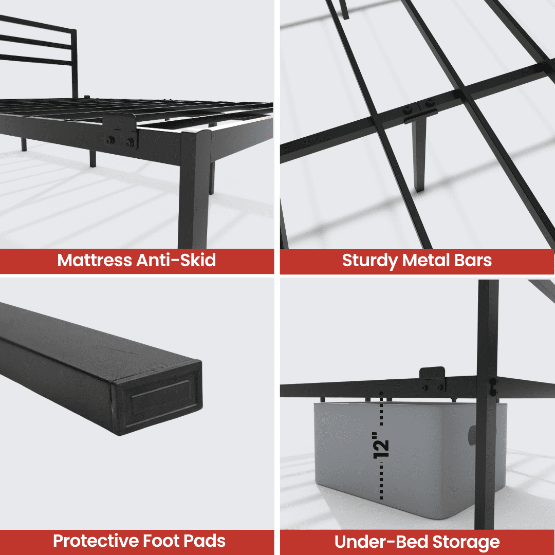DURABLE & HEAVY-DUTY CONSTRUCTION: This black metal bed frame Twin offers outstanding strength with a steel platform that supports up to 600 lbs. Its sturdy frame ensures a long-lasting, squeak-free sleep experience, providing dependable support for your modern bed frame Twin size mattress. MODERN FARMHOUSE BED FRAME DESIGN: Featuring a modern farmhouse bed frame style with a sleek black metal finish, this bed frame seamlessly blends with various home decors, including rustic, industrial, and contemporary themes. Add a touch of elegance to any bedroom with its clean lines and functional design. SPACE-SAVING UNDER-BED STORAGE: With 11 inches of under-bed clearance, this modern bed frame Twin size offers generous storage space for extra bedding, books, or personal items. It helps declutter your room while maximizing the use of available space, keeping your bedroom organized and tidy. NO BOX SPRING NEEDED: Designed as a platform bed frame, this frame eliminates the need for a box spring, saving both time and money. Its metal slats offer robust support for your mattress, making it the perfect choice for anyone seeking a modern and hassle-free foundation. PET-FRIENDLY & EASY TO MAINTAIN: This black metal bed frame Twin is not only pet-friendly but also easy to clean, making it ideal for households with pets. The non-toxic finish resists dust, allergens, and pests, ensuring a healthier sleep environment with minimal upkeep.