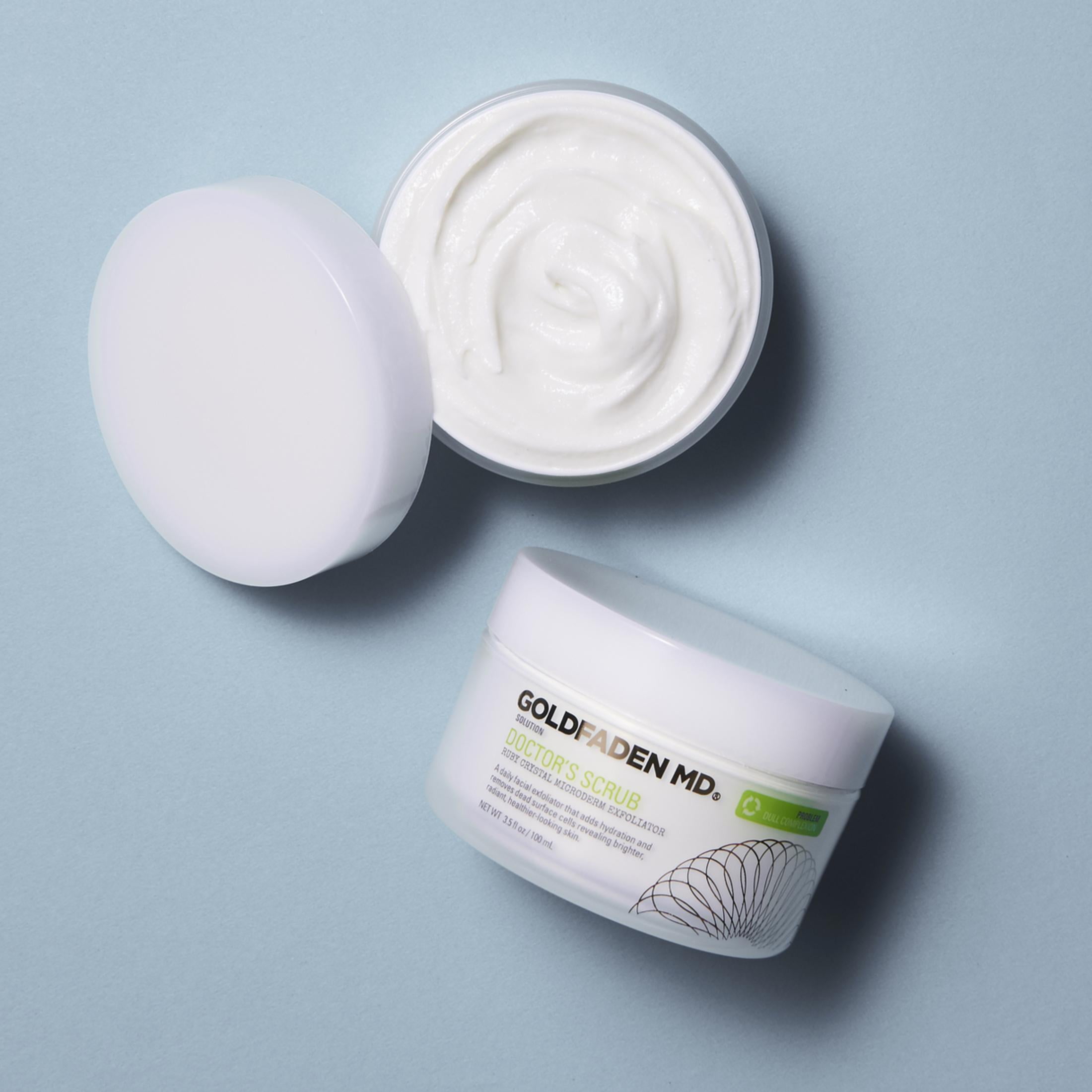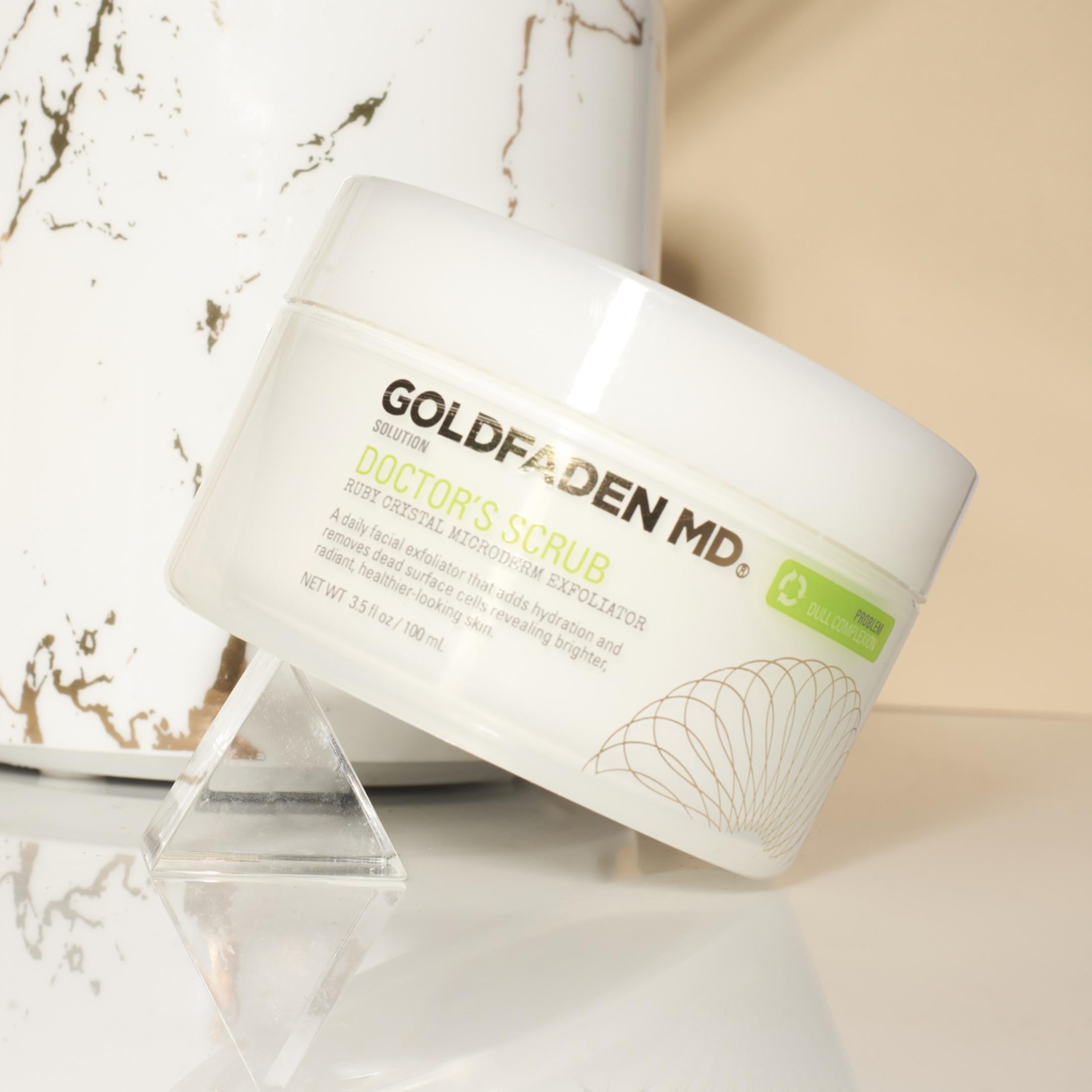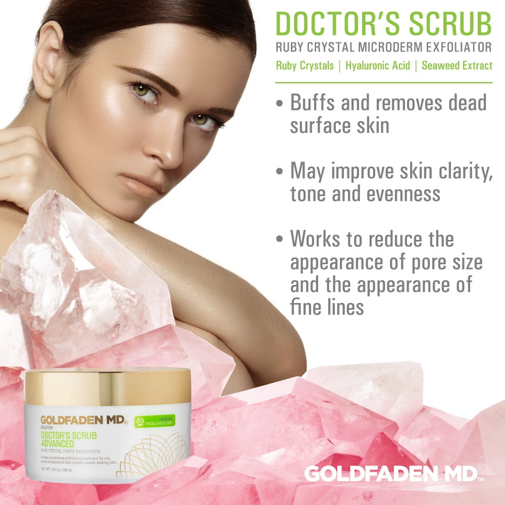 Goldfaden MD Doctor’s Scrub Ruby Crystal Microderm Exfoliator Facial Cleanser, 3.5 fl oz Buffs and removes dead skin May improve the appearance of skin color and tone Works to reduce the appearance of pores and lines This daily facial exfoliator is formulated with Jojoba Oil, a moisturizing agent that may help to prevent water loss and enhance suppleness. 3.5 oz