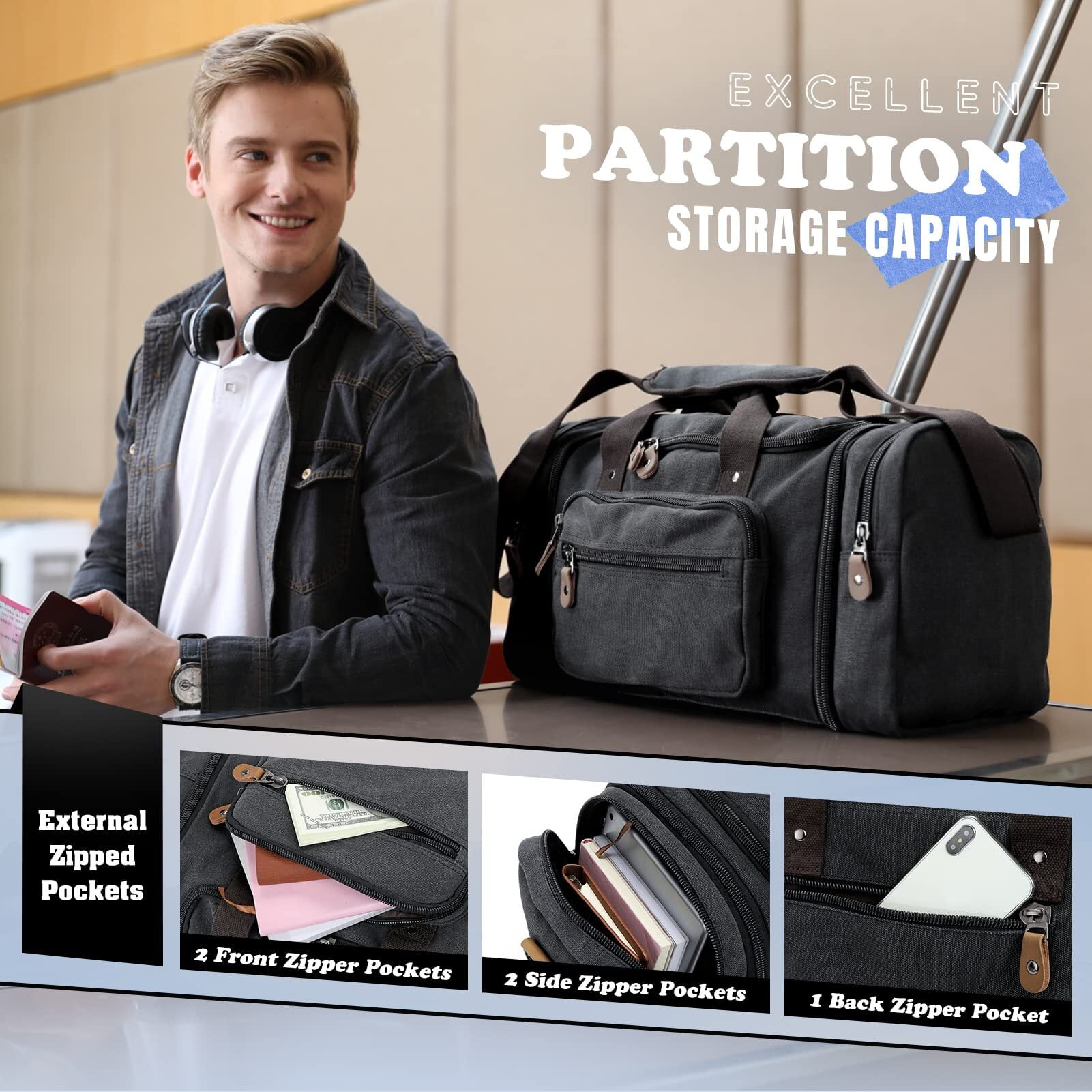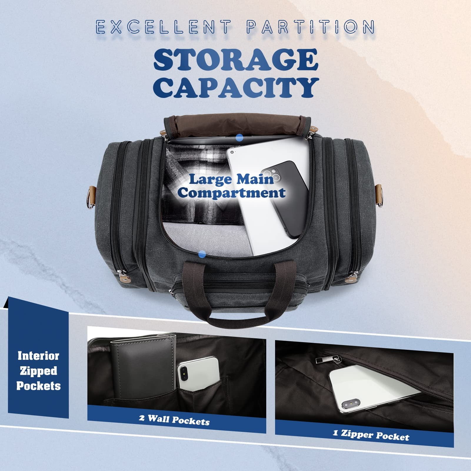 【Premium Canvas Material】The duffel bag is made from high-quality, durable canvas that can withstand the wear and tear of travel and daily use. 【Expandable Capacity】The canvas travel duffel bag measures (L)23.6 x (W)11 x (H)12.2 inches and can be extended to 26 inches with two side zippers. Perfect for carrying on flights as carry-on luggage. 【Spacious Interior】Our canvas duffel bags feature a spacious interior with ample storage space for all your belongings. It boasts a spacious 60L capacity, accommodating a 17-inch laptop, iPad Pro, clothes, shoes, and other essentials for a 3-7 day trip. 【Adjustable & Detachable Strap】 Equipped with an adjustable and detachable shoulder strap, a round stitched handle. It can be carried in three ways: by hand, over the shoulder or crossbody. 【Multiple Pockets】This Gonex duffel bag has one main compartment with a zipper pocket, two side zipper pockets, two front zipper pockets, and one back zipper pocket. 【Versatile use】Our duffle bag, a good companion for traveling, could be served as a weekender bag, travel bag, gym bag, overnight bag, camp/airplane duffel, carry-on luggage.