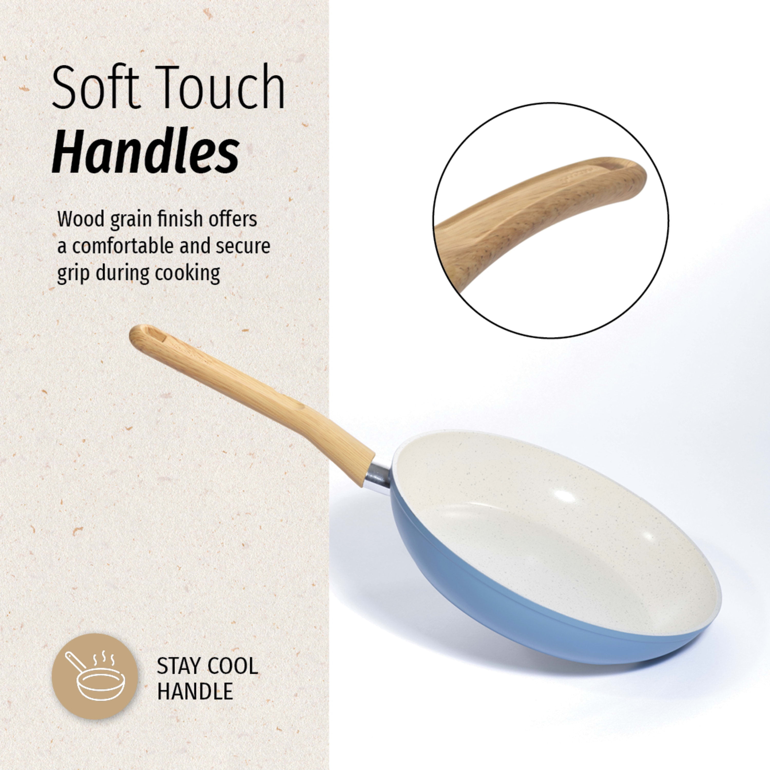 Bring premium cookware to your home kitchen with the GoodCook Healthy Ceramic Titanium-Infused 10-Piece Cookware Set. Designed especially for home cooks, this cookware set includes 7″ and 9.5″ fry pans, 1.25-quart and 2-quart saucepans with lids, a steamer that fits the 2-quart saucepan, egg pan, spoon, and slotted turner so you’ll always have the cookware and utensils you need. With titanium-infused ceramic nonstick surfaces, these cookware pieces allow you to cook with less oil and butter for healthier meals while ensuring an excellent mess-free release, even for the stickiest of foods. Each cookware piece distributes heat evenly for the best results and is safe for all stovetops (including induction), and both wood utensils feature ergonomic soft touch and stay-cool handles for optimal comfort and control as you cook. With titanium-infused ceramic nonstick surfaces, these cookware pieces allow you to cook with less oil and butter for healthier meals while ensuring an excellent mess-free release, even for the stickiest of foods. Each cookware piece distributes heat evenly for the best results and is safe for all stovetops (including induction), and both wood utensils feature ergonomic soft touch and stay-cool handles for optimal comfort and control as you cook. The cookware’s trendy matte light blue exterior and sophisticated light beige interior with gray speckles add luxurious style to any home’s kitchen, and the tempered glass lids allow you to watch your food as it cooks while keeping it covered.