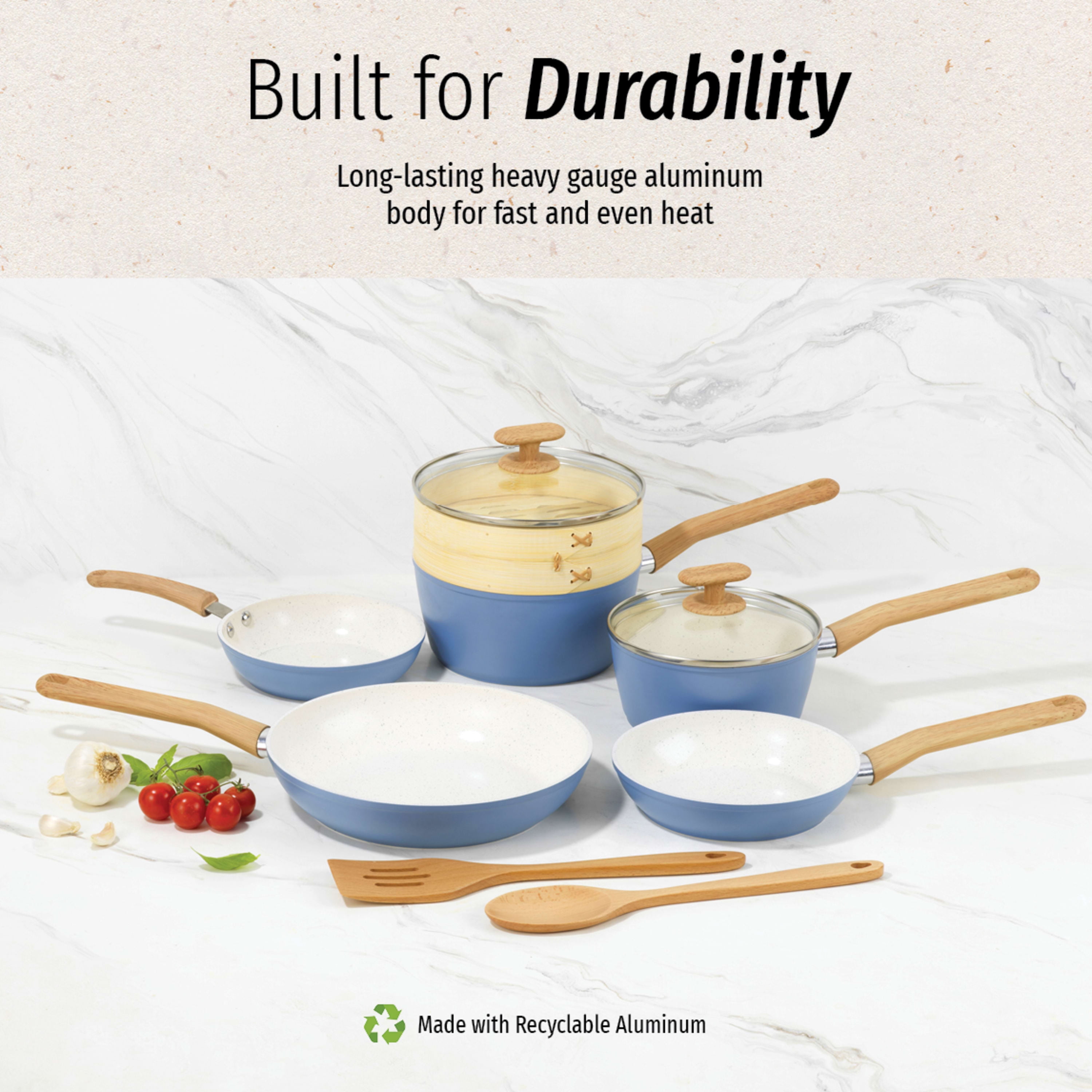 10-piece cookware – 7” and 9.5” fry pans, 1.25-quart and 2-quart saucepans with lids, steamer, egg pan, spoon, and slotted turner Titanium-infused ceramic nonstick interior Distributes heat evenly Safe for all stovetops – including induction Trendy matte light blue exterior Tempered glass lids