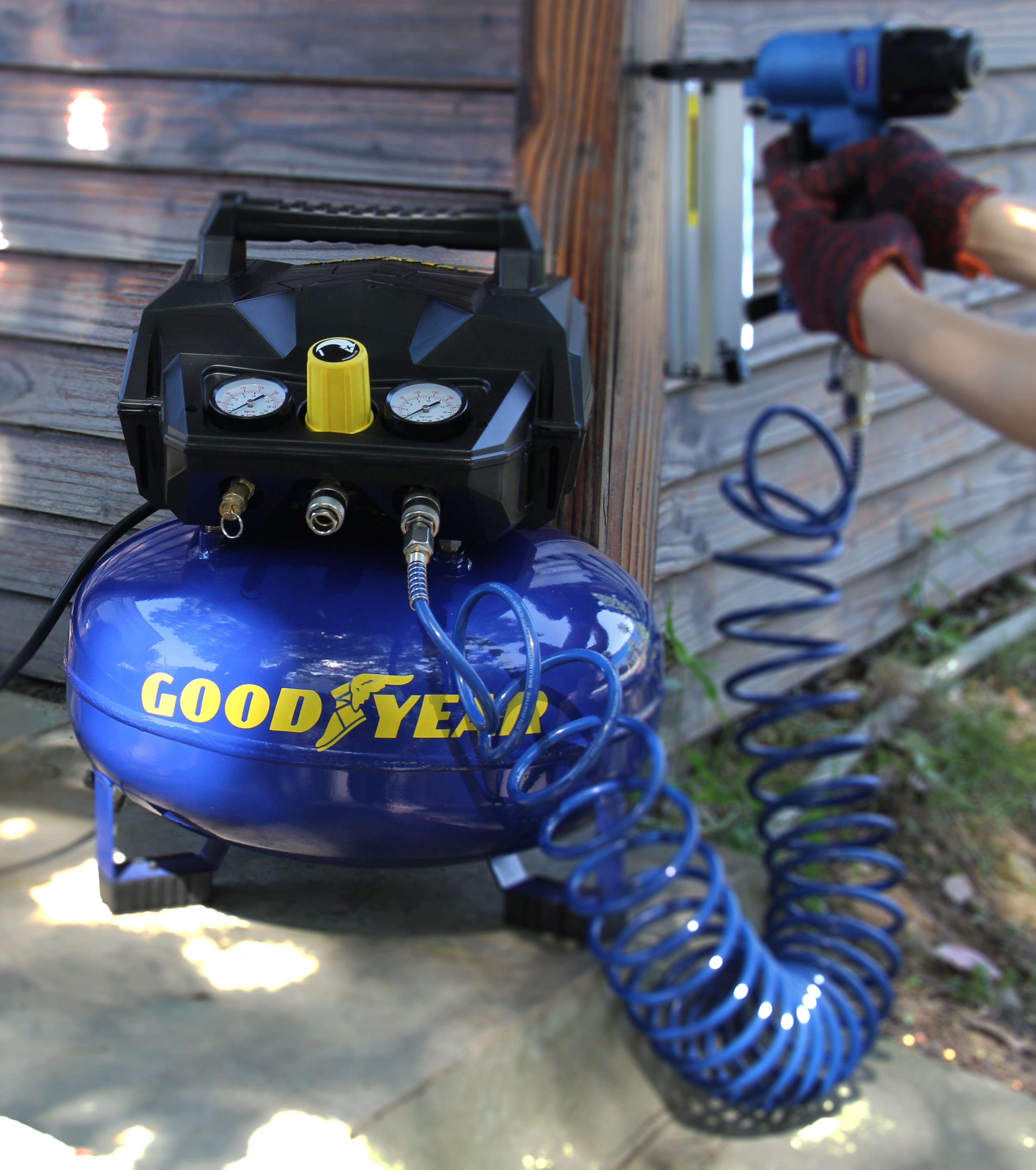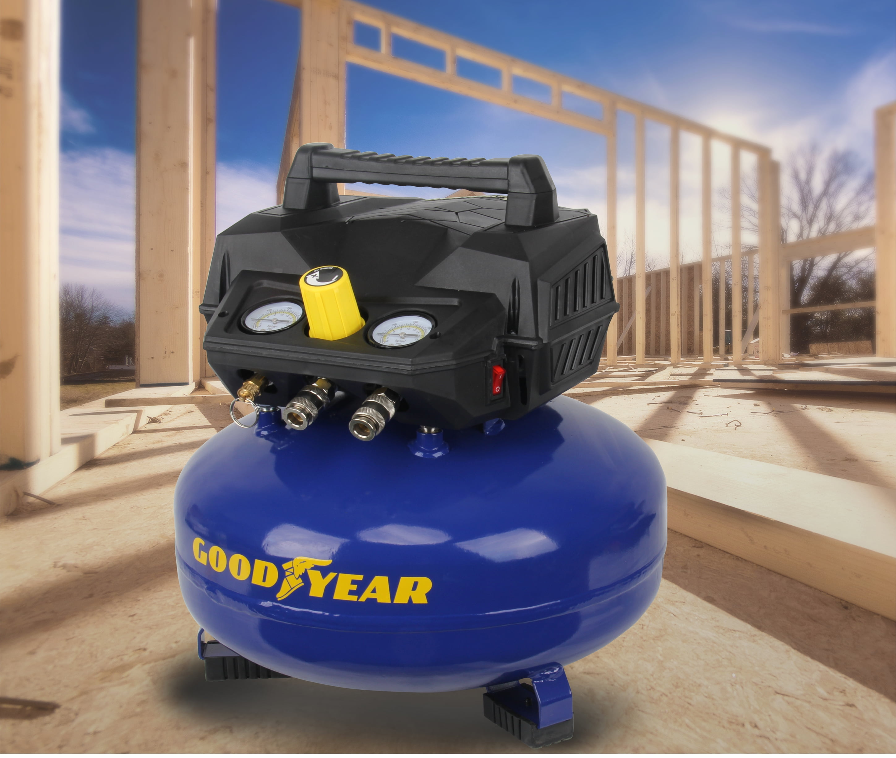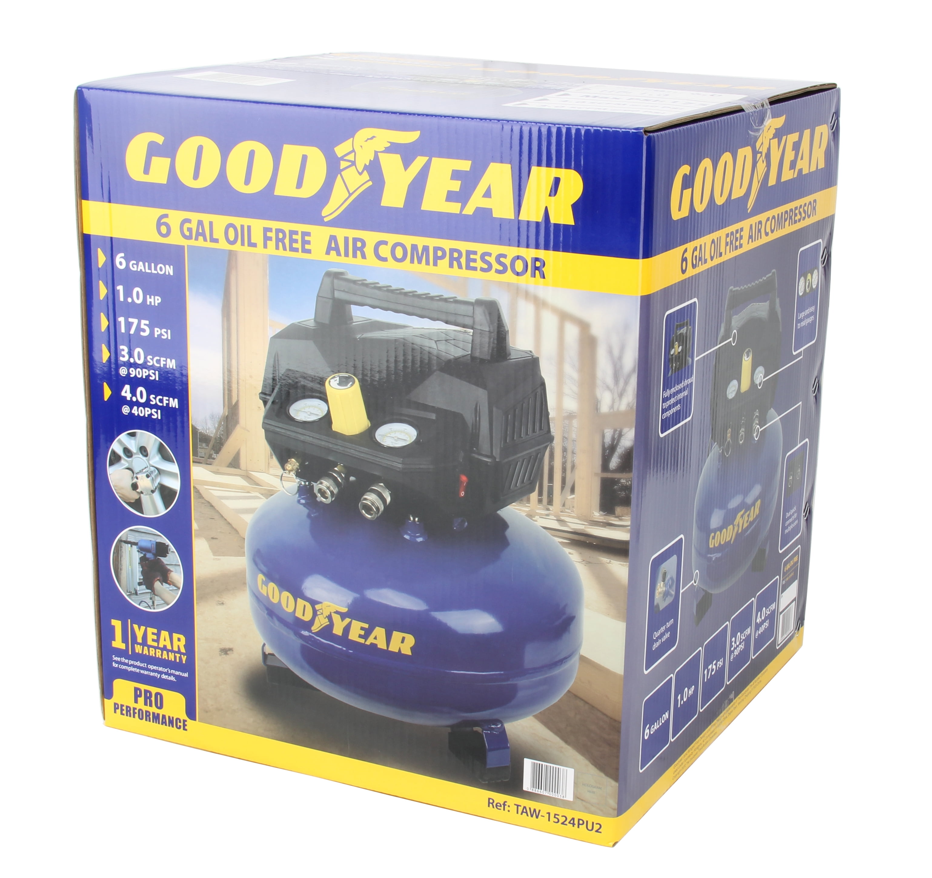 This is a GOODYEAR 6 Gallon Portable Pancake Air Compressor. This compressor boasts of 175 Max Psi with an impressive 4.0 SCFM at 40 PSI and 3.0 SCFM @ 90 PSI. This unit has an oil free maintenance free pump. You do not have to worry about changing the oil and works perfect in cold weather. This unit has a carry handle to maximize portability and only weighing approximately 37 lbs. The GOODYEAR 6 gallon is perfect for trim work and finishing work with duel quick connects. This unit is powerful enough to operate 2 nailers at a time. Everything you need to get the job done.