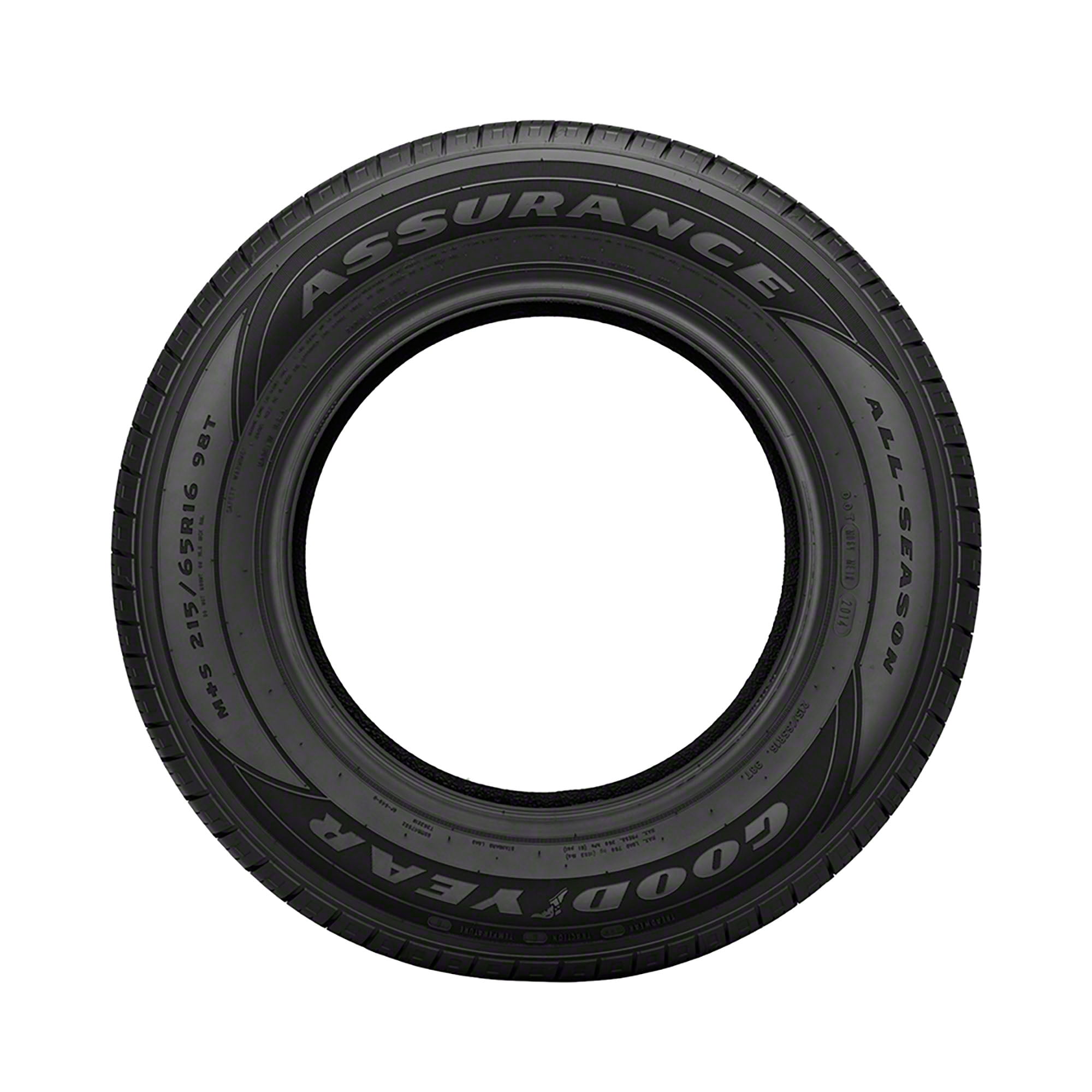 Goodyear Assurance All-Season 215/65R16 98T OVERVIEW The Goodyear Assurance All-Season is a passenger tire specially designed for drivers who want year-round traction, comfort, and excellent value. Ideal for family sedans and minivans, the Goodyear Assurance All-Season does well in all seasons including winter weather. Its tread was engineered to be strong and durable as noted by its 65,000 mile tread life warranty. On the road, it creates multiple biting edges required during wet, dry, and snowy conditions. Enhancing this further are the wide tread grooves which drain water efficiently out the tires while enhancing wet traction. For reliable handling on wet and dry roads are the large stable shoulder blocks. To provide you a comfortable ride even when travelling at long distances is the optimized tread pattern.