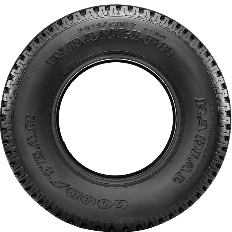 Feel more confident on the road when you have the Goodyear Wrangler Radial Tire 235 75R15 105 S model installed on your vehicle. This product is designed for SUVs and light trucks and offers users with a safer driving experience on and off the road. This all-season tire features a rugged tread pattern to deliver reliable traction on different kinds of terrain. It has large blocks to help keep the vehicle stable and to improve handling in both wet and dry road conditions. This light truck SUV tire is prepared for performing well in the summer as well as the winter seasons. In addition, it sports a sleek look to complement your overall style. The Goodyear Wrangler Radial Tire 235 75T15 105 S has a treadwear warranty of 50,000 miles and an S speed rating.